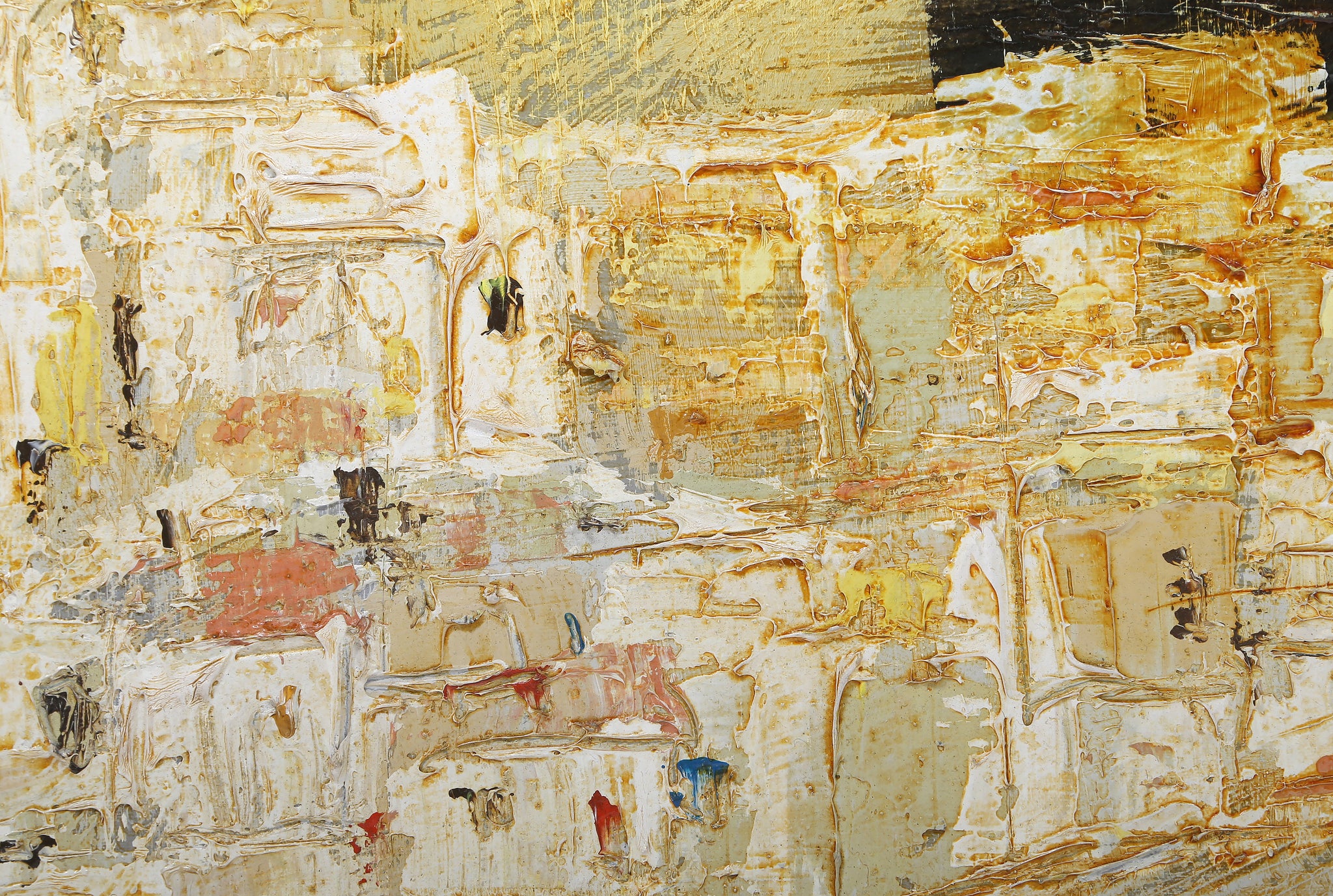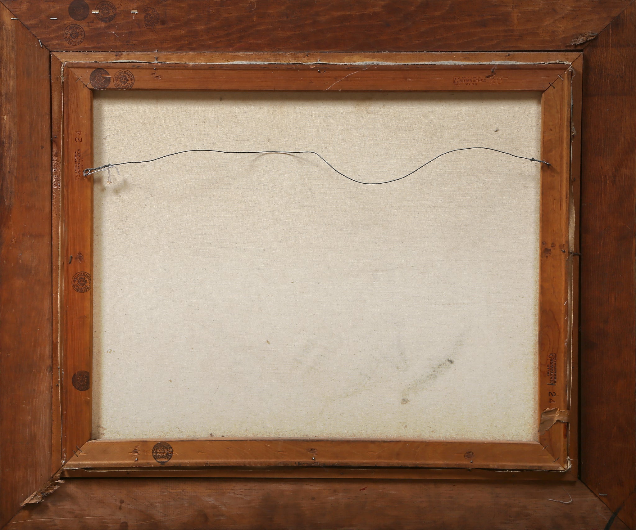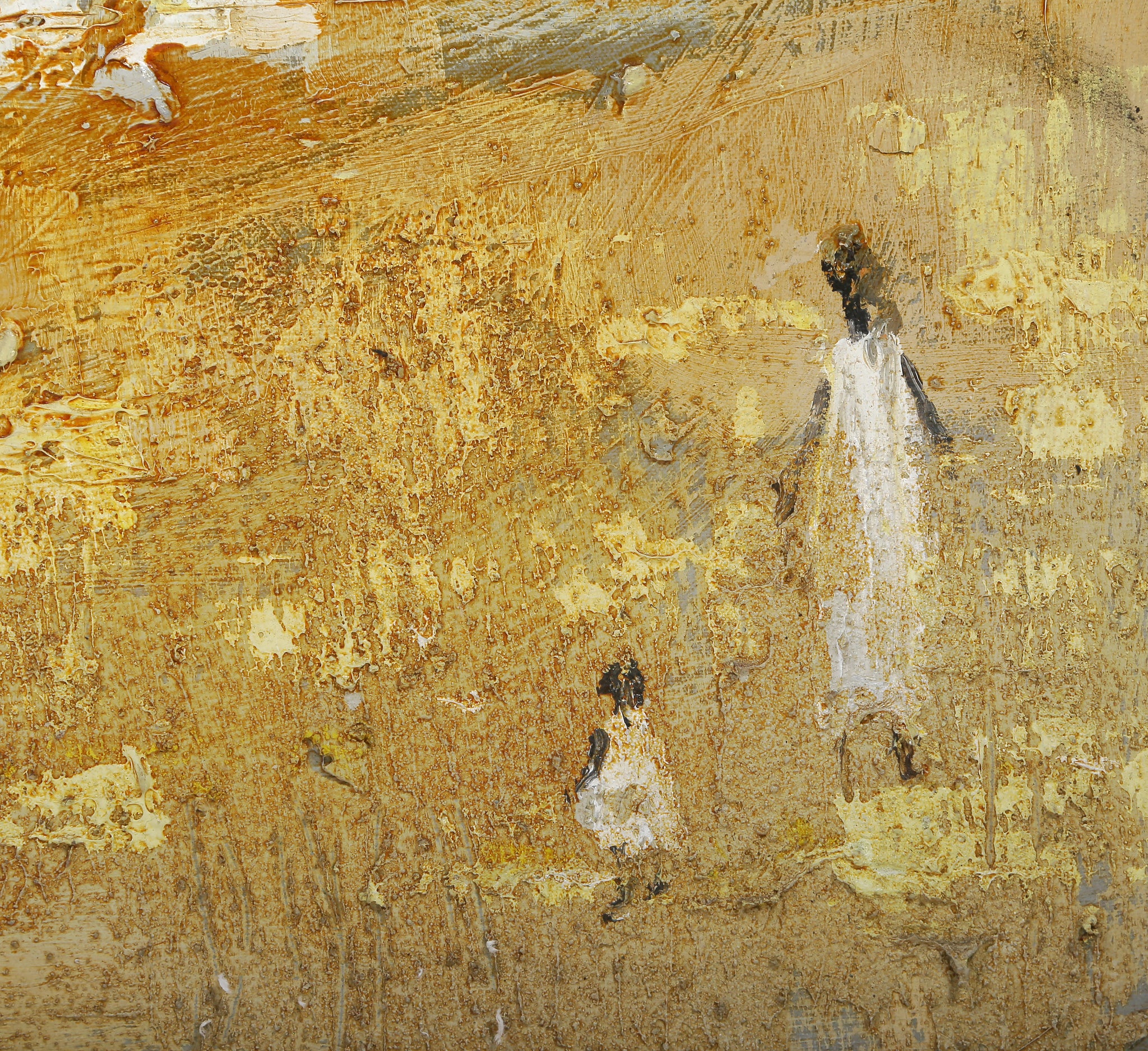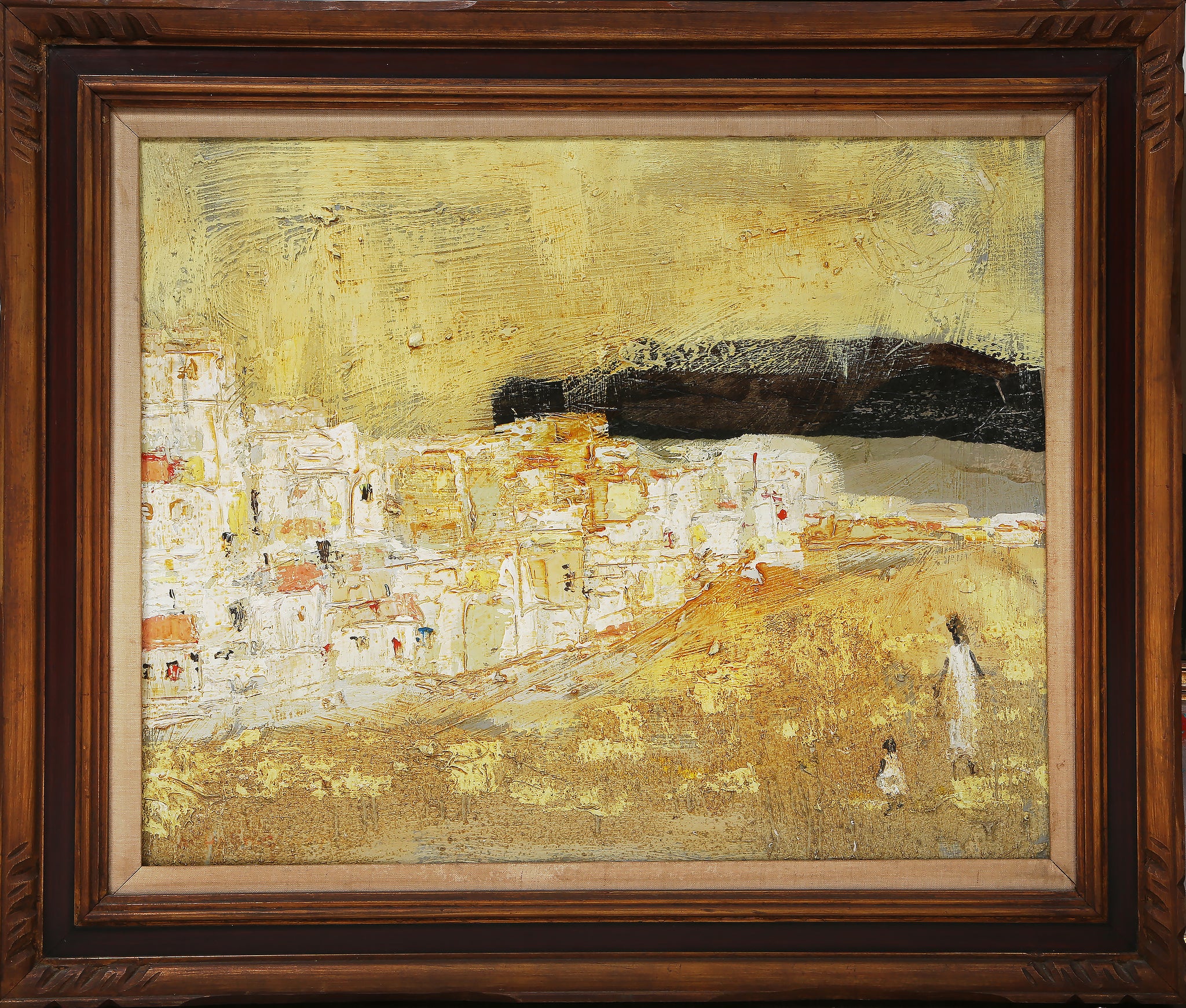 A simple painting by African American artist Alvin Carl Hollingsworth. This oil painting on canvas shows to dark figures in white clothes, perhaps a mother and daughter, walking along golden sands. To their left, a city of white buildings rises, beyond which looms a dark black mountain. This painting is nicely framed.