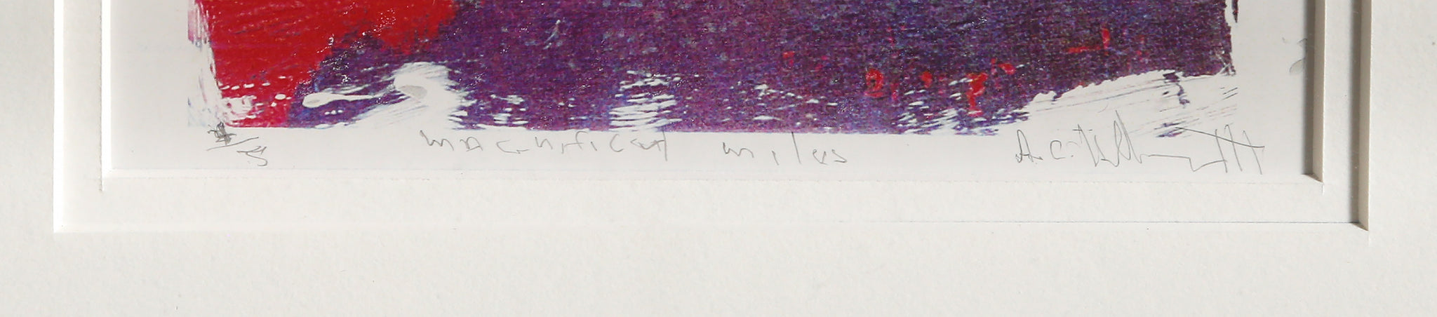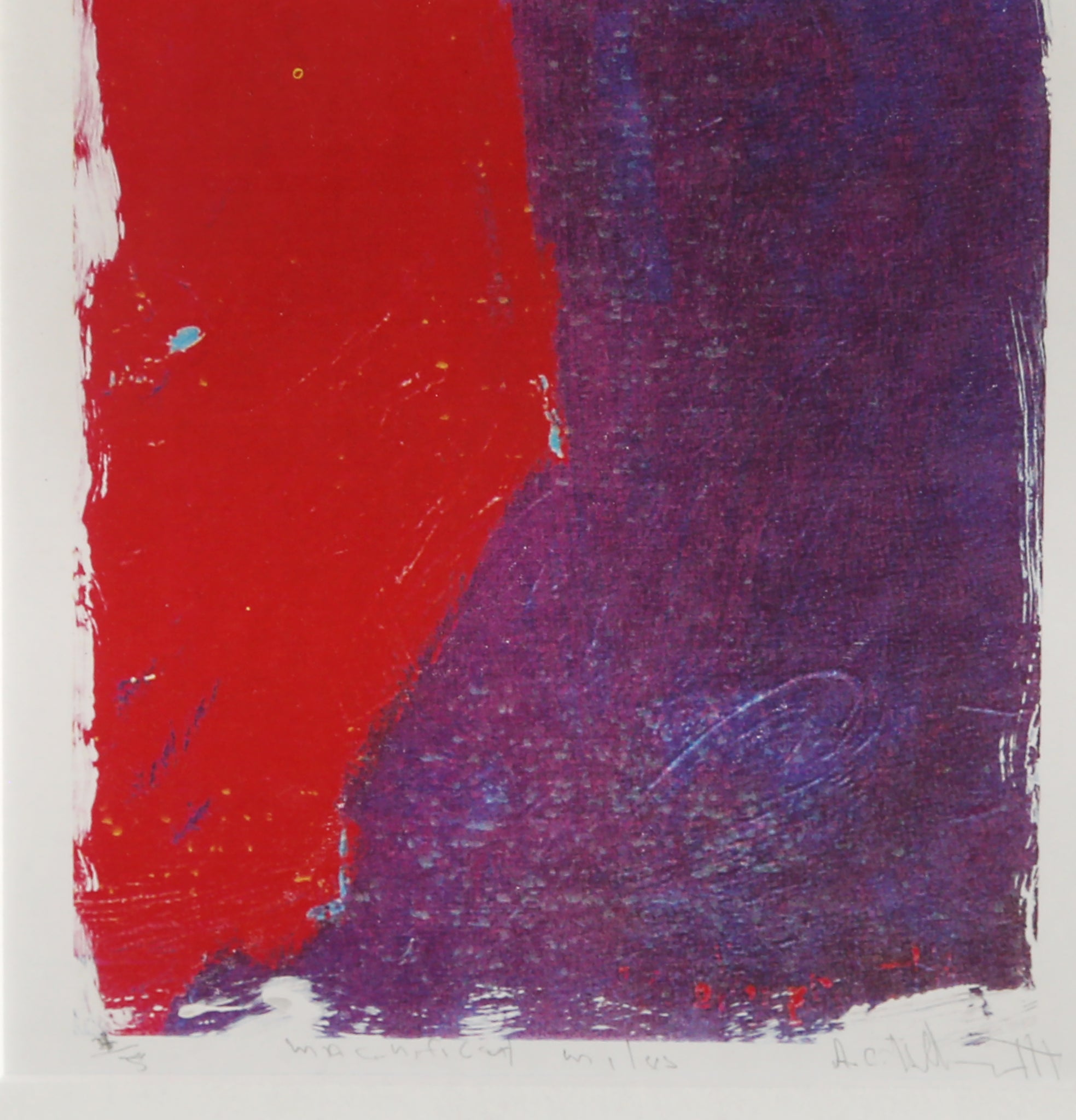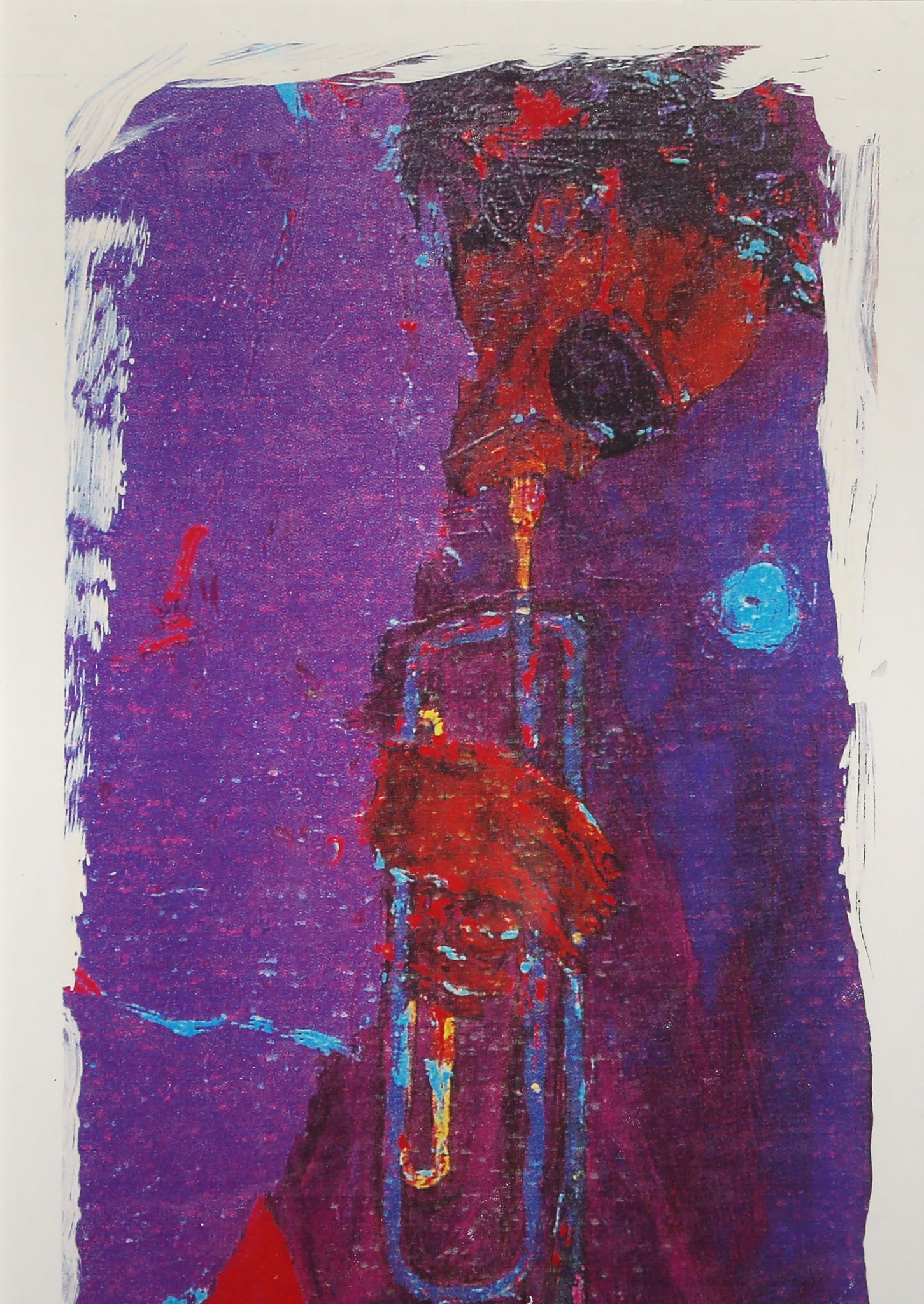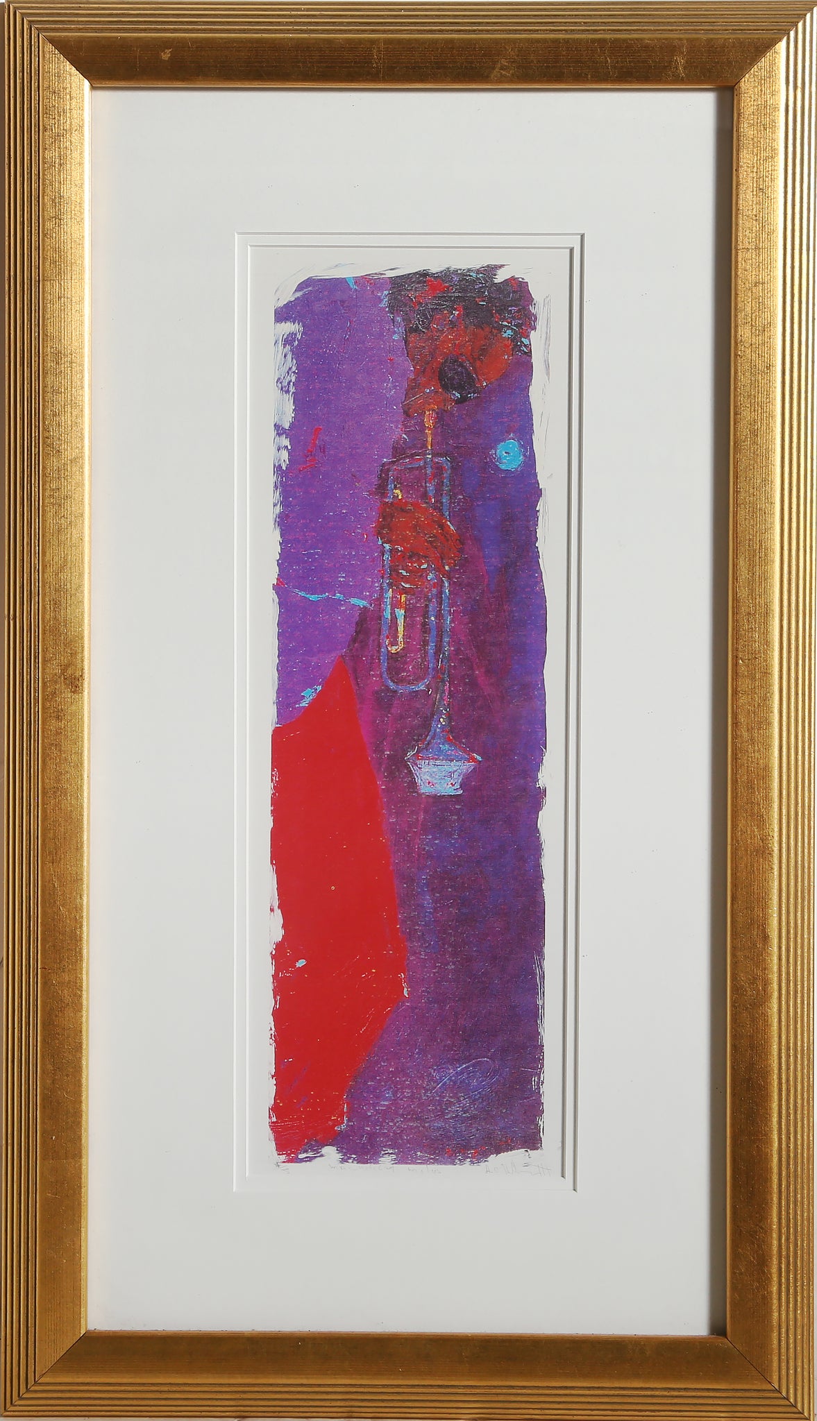 An abstract depiction of famed Jazz musician Miles Davis by African American artist Alvin Carl Hollingsworth. This lithograph, signed, titled, and numbered in pencil, shows the trumpet player with his head dipped, playing an unheard melody against a background of purple and red.