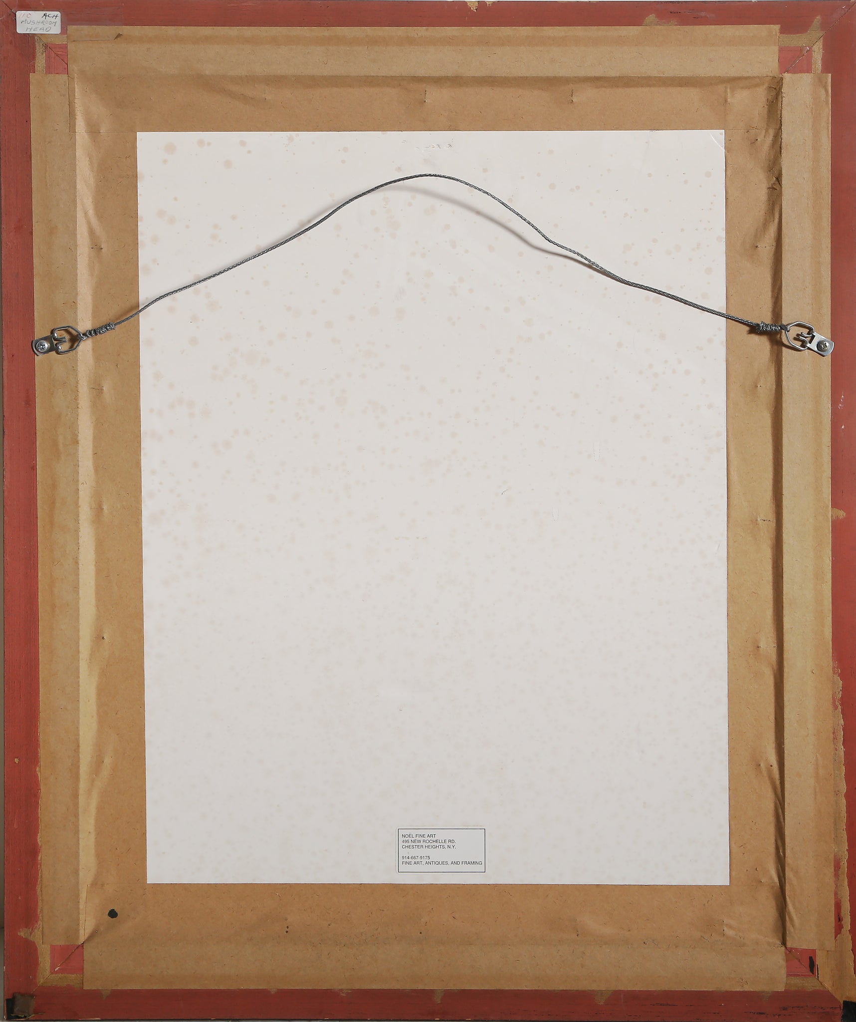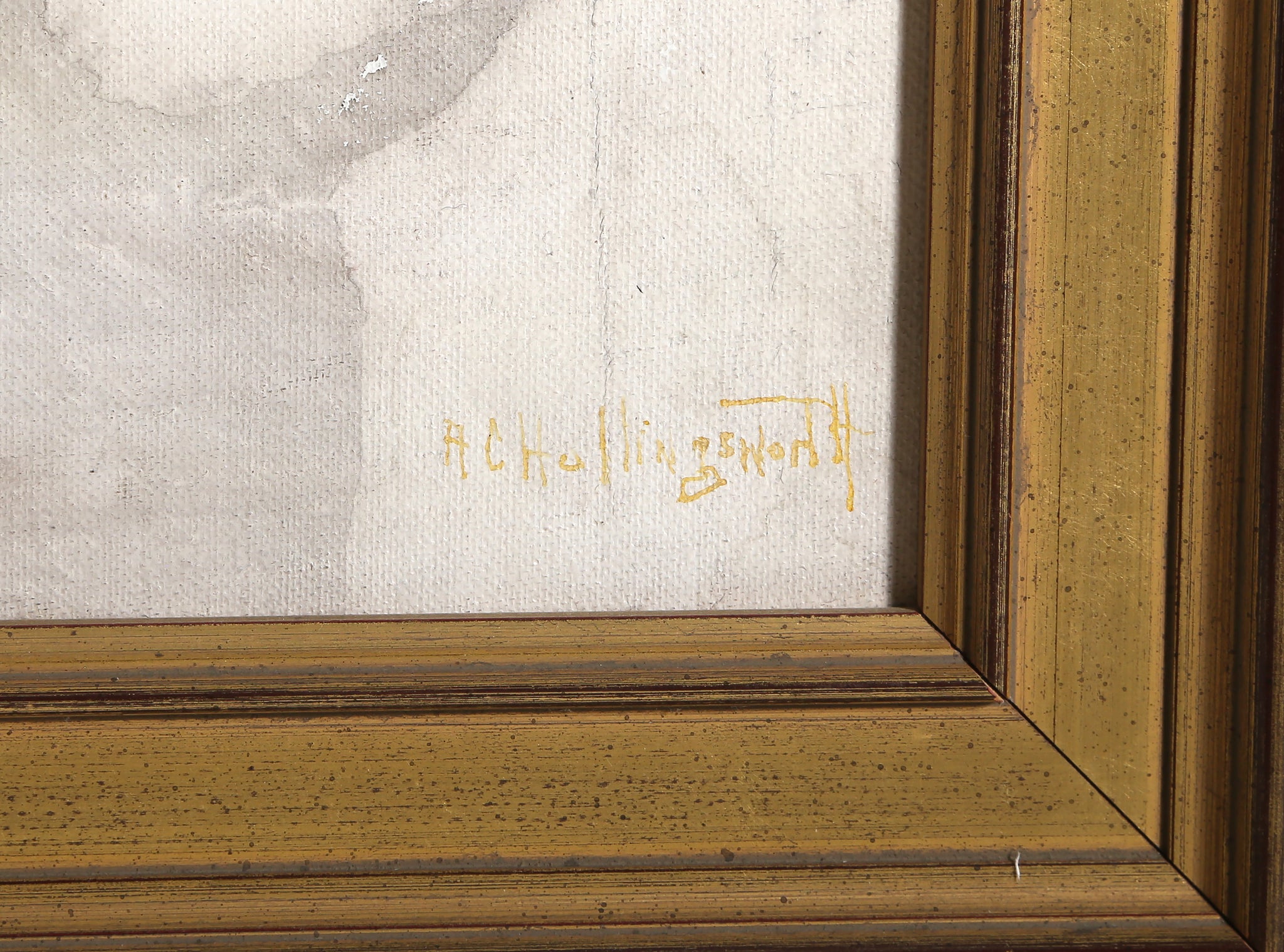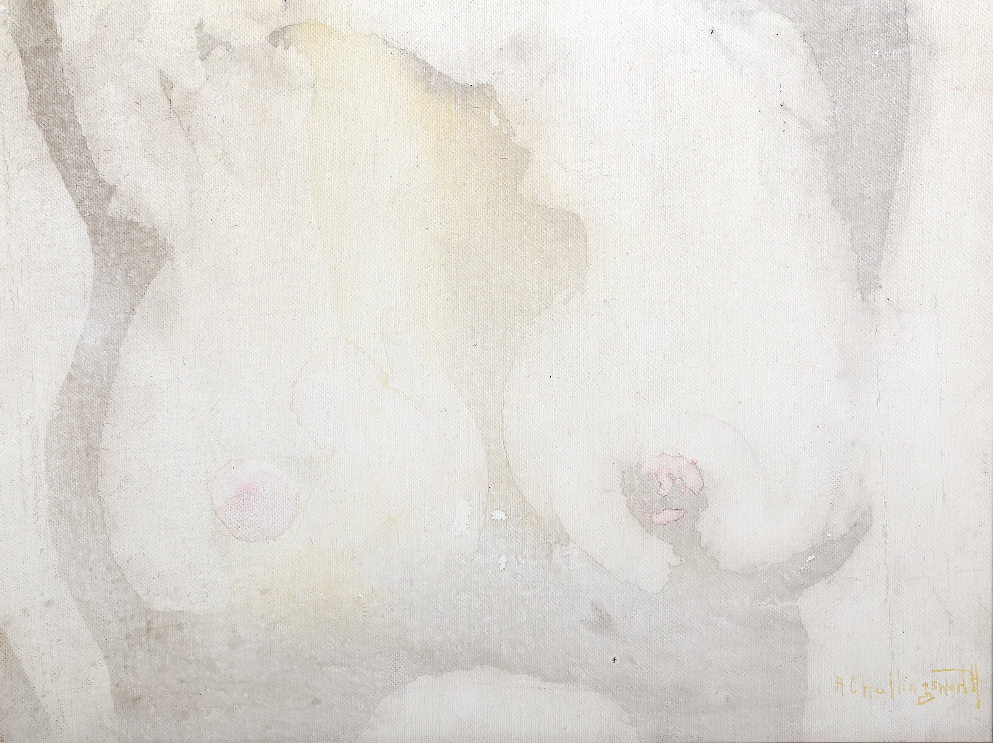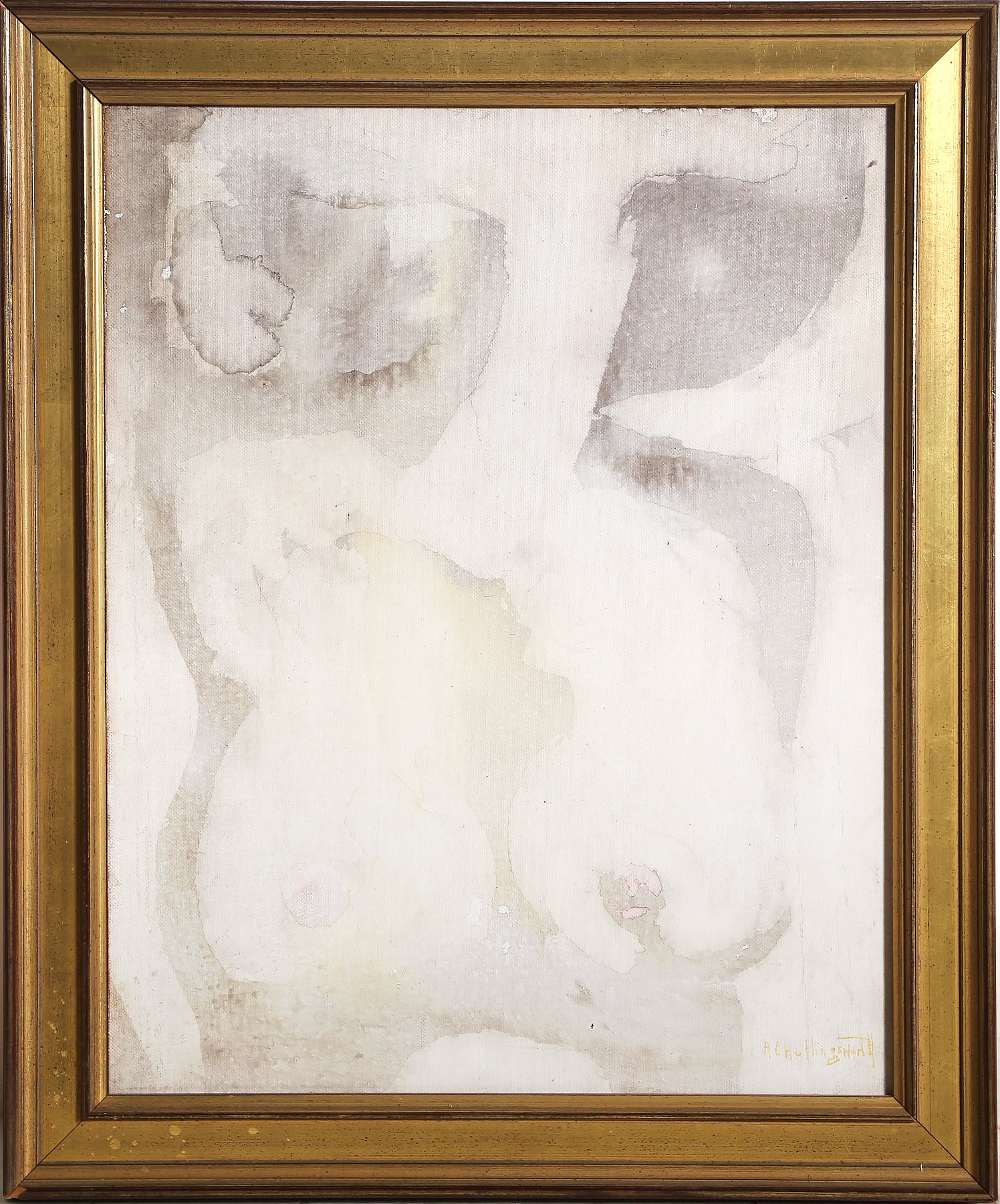 An abstract composition of a nude bust by African American artist Alvin Carl Hollingsworth. This gouache and acrylic on canvas painting uses only white and grey tones to fill the space, making it almost feel carved from marble. The piece is signed lower right and nicely framed.