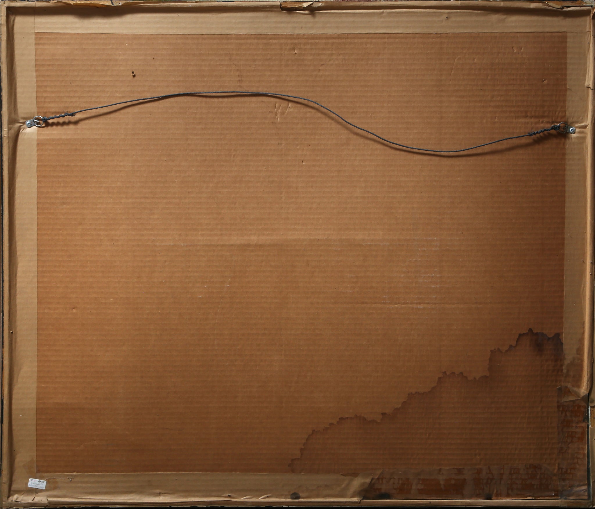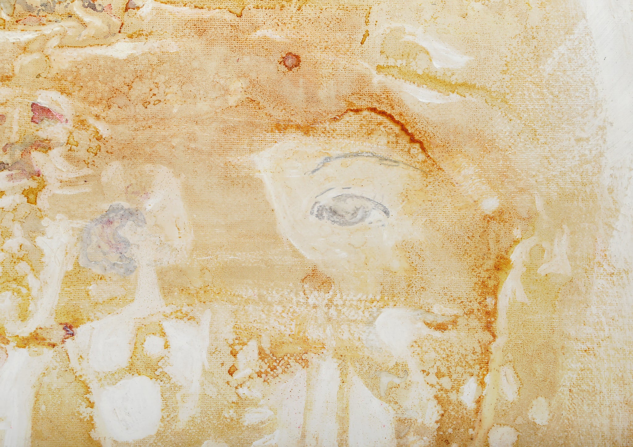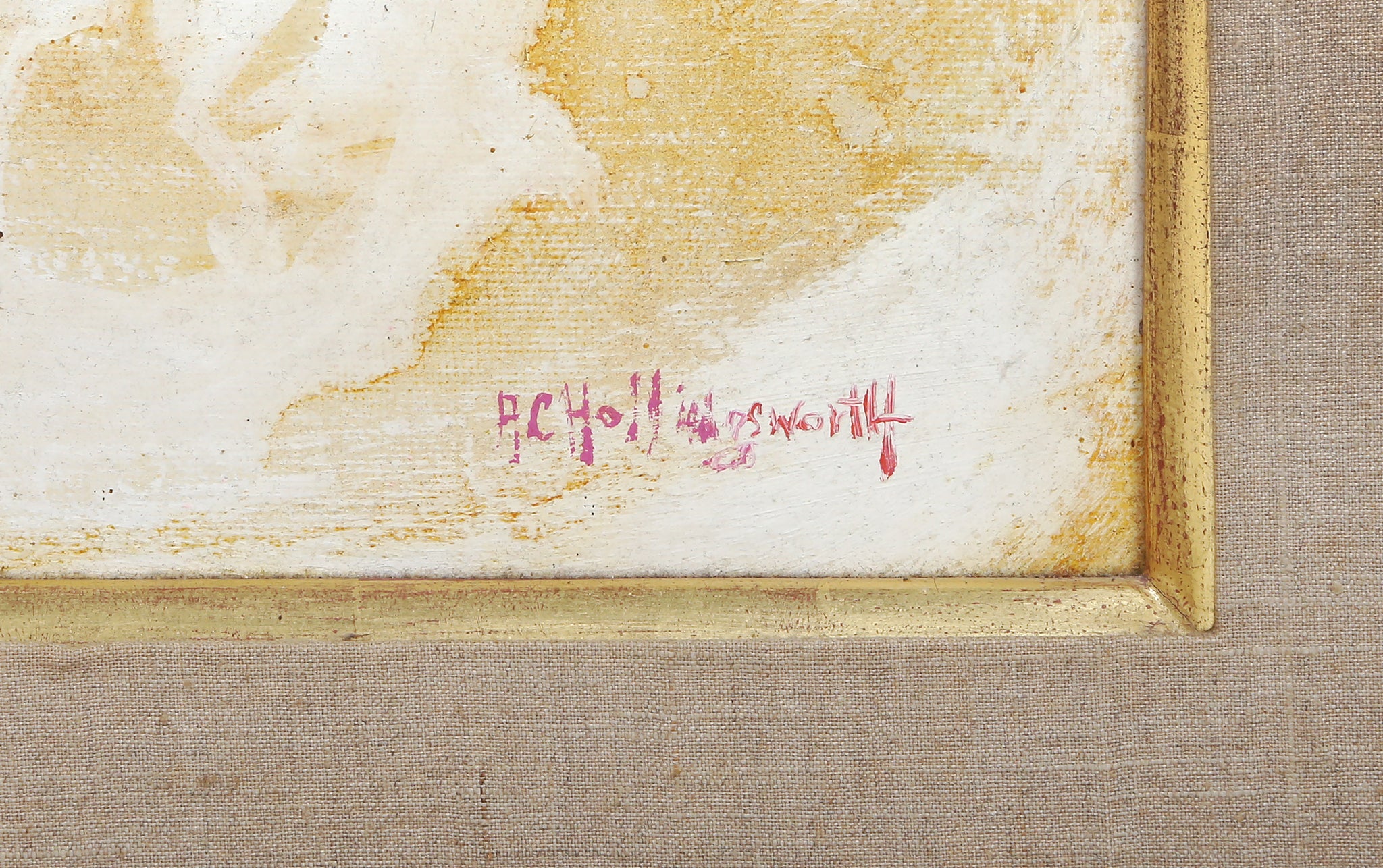 A Surrealist composition by African American artist Alvin Carl Hollingsworth. Using only yellow paints, the artist depicts a scene that appears abstract at first glance, but reveals faces and torsos and objects upon closer inspection. This painting is made with oil, acrylic, and gouache paints on board and is signed in the lower right.