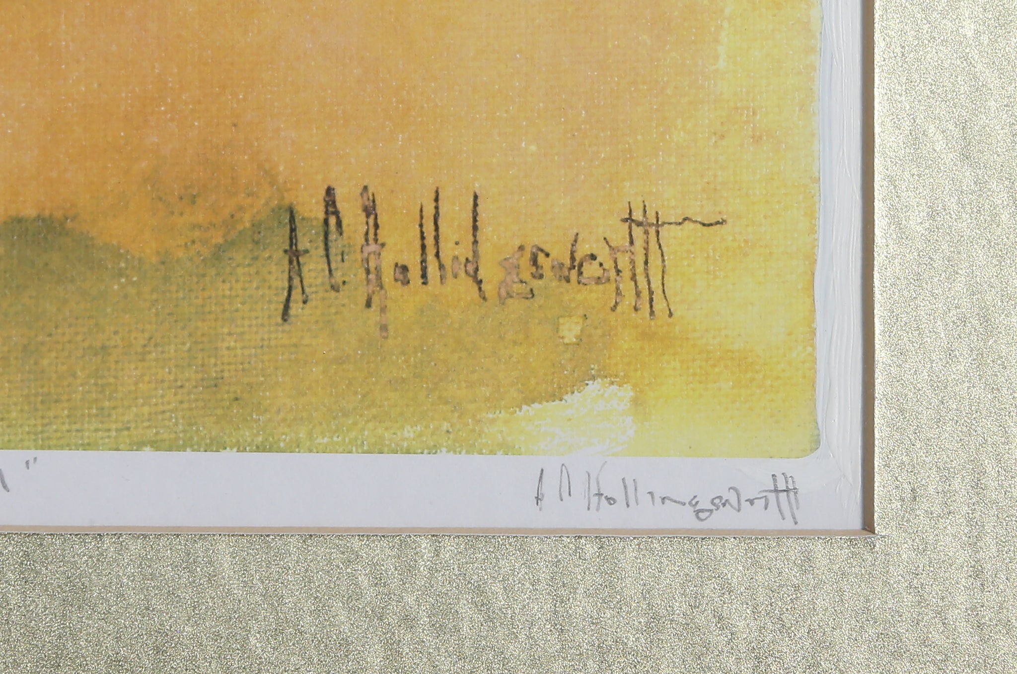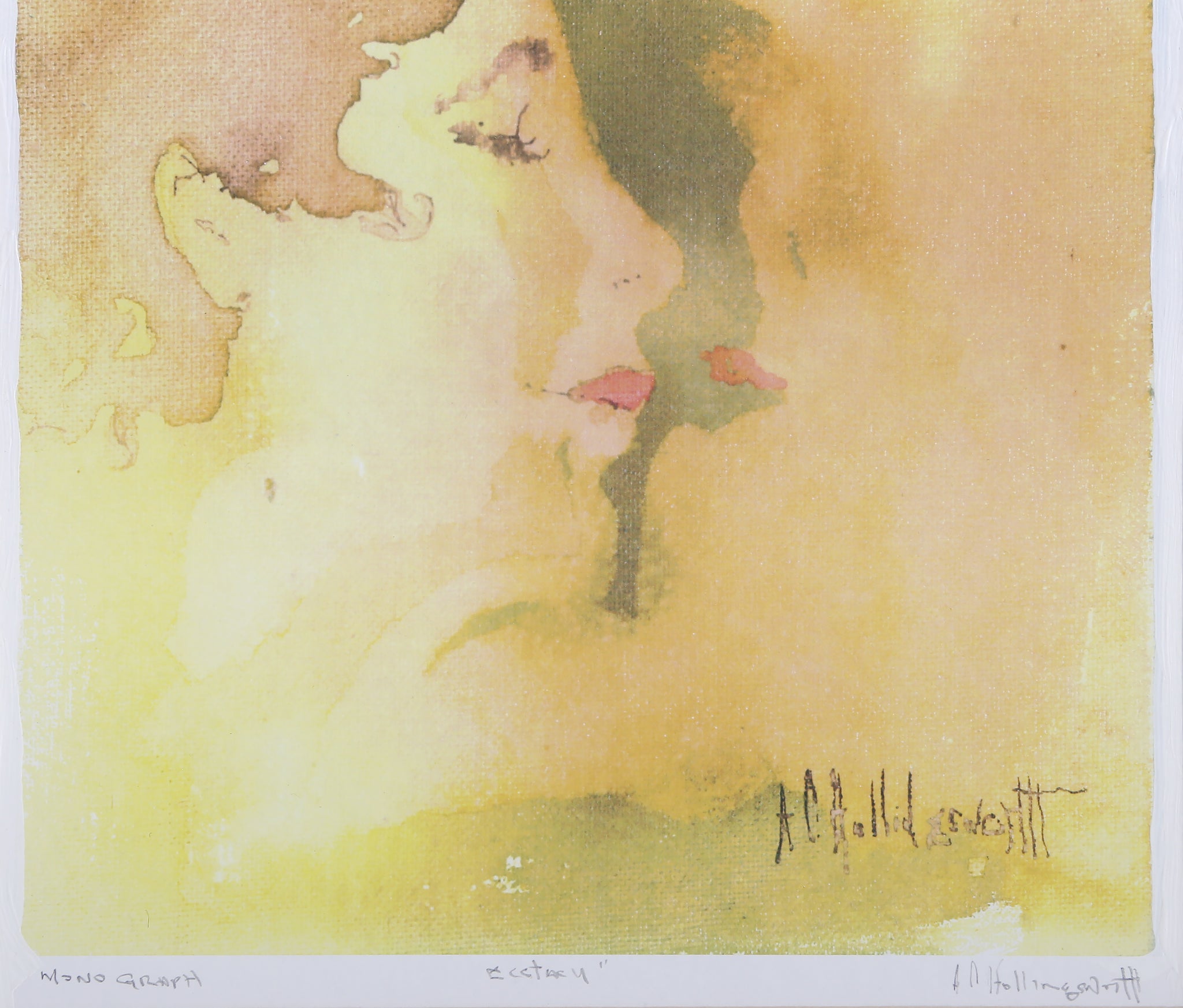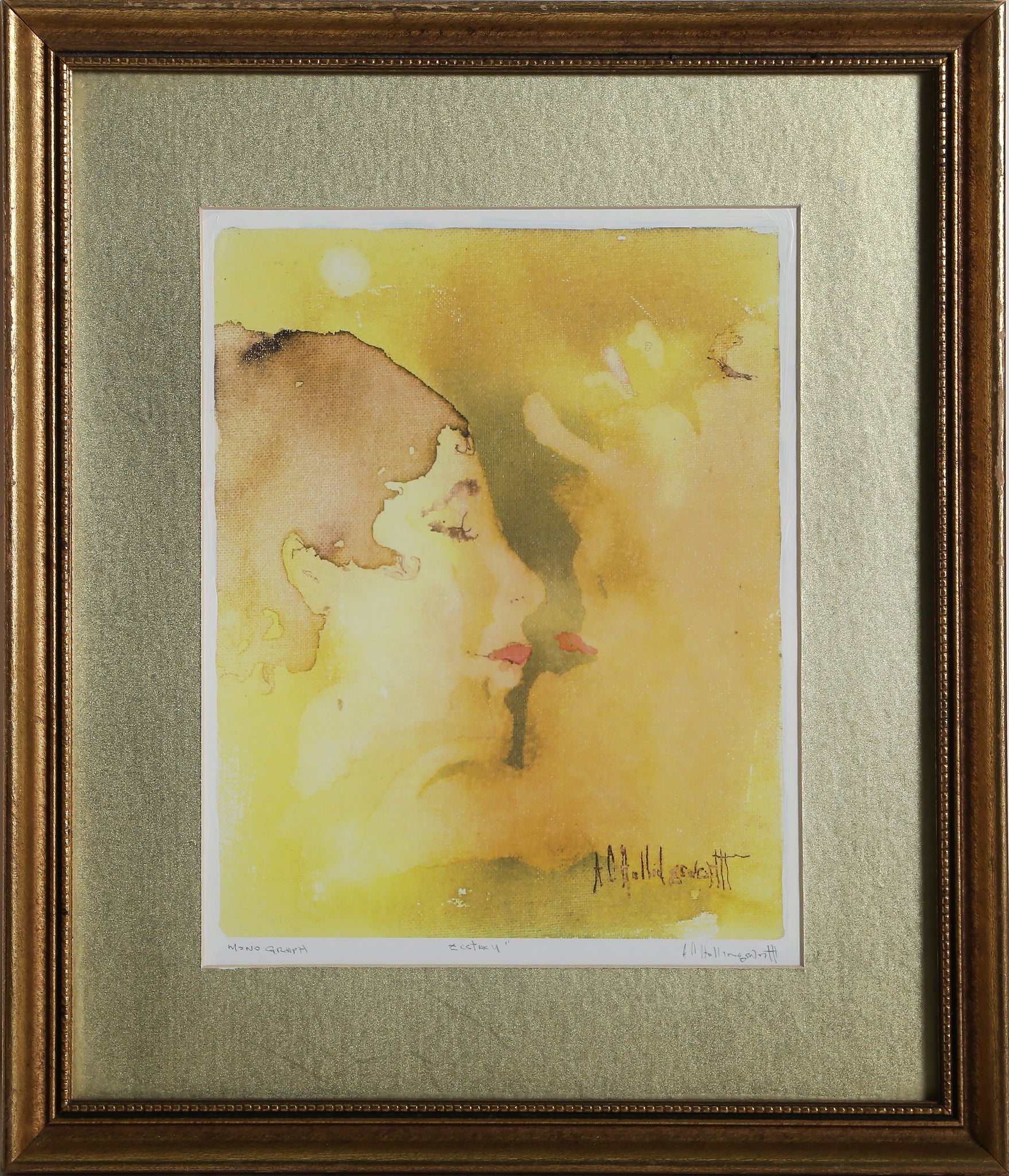 This Modern monoprint by African American artist Alvin Carl Hollingsworth features a hazy portrait, possibly a double portrait, of a face in profile with closed eyes and bright red lipstick. The composition uses a technique similar to watercolor to lend a smoky quality to the image. This print is signed and titled in pencil and also signed in the plate.