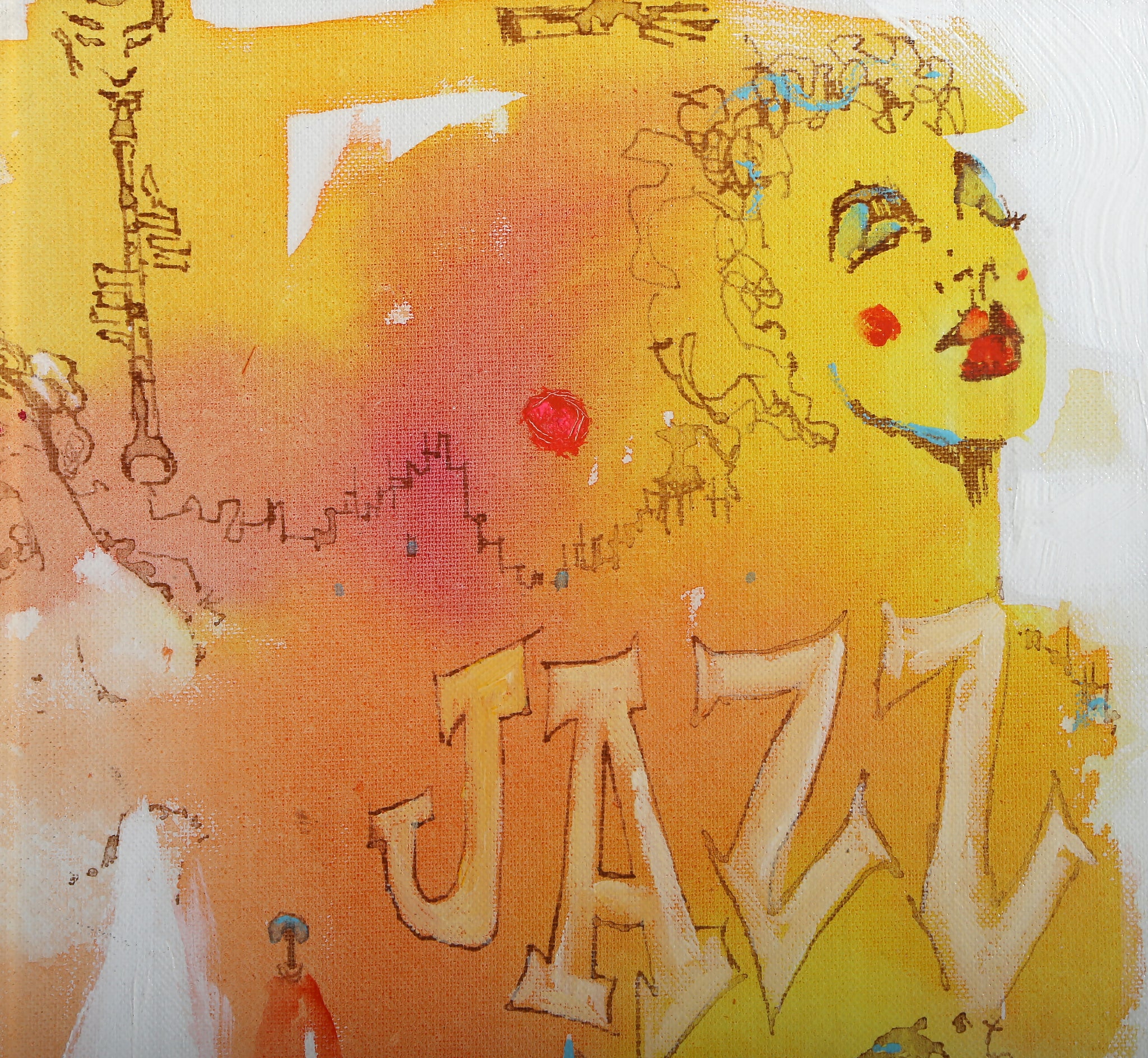 A unique oil and gouache painting by African American artist Alvin Carl Hollingsworth. The piece features the faces of several figures wearing bright rouge and lipstick, all in various states of discernibility. Floating like smoke over the composition is the word "JAZZ" written in large block letters.
