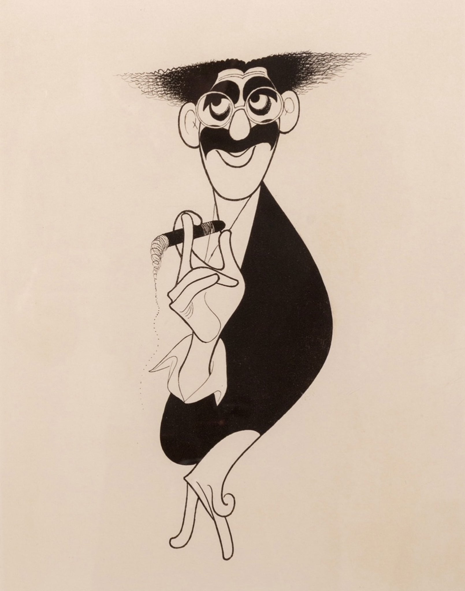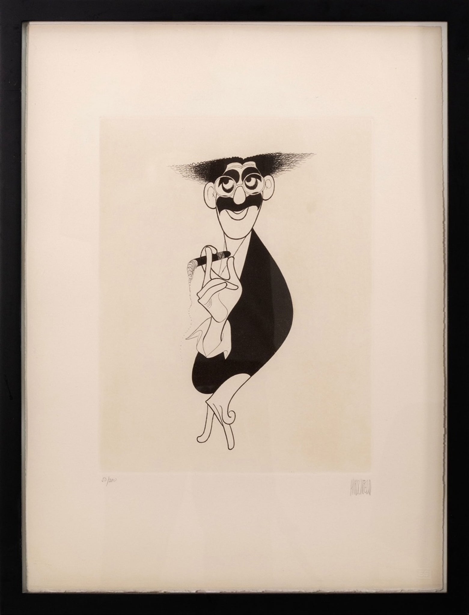 Capture the iconic wit and charm of theatrical performance with this masterful American Art lithograph depicting David Garrison's portrayal of Groucho Marx in the Broadway production "A Day in Hollywood/A Night in the Ukraine." Al Hirschfeld's signature illustrative style brings to life the legendary comedian's distinctive features—the cigar, mustache, glasses, and expressive hand gestures—in a composition that exemplifies Celebrity Art and American Art movements' celebration of entertainment culture. The artist's elegant linework and keen observational skills transform a theatrical moment into a timeless tribute to comedy and performance art. A must-have for collectors of American Art, Celebrity Art, and Illustrative Art seeking prints that honor Broadway history and comedic legends.