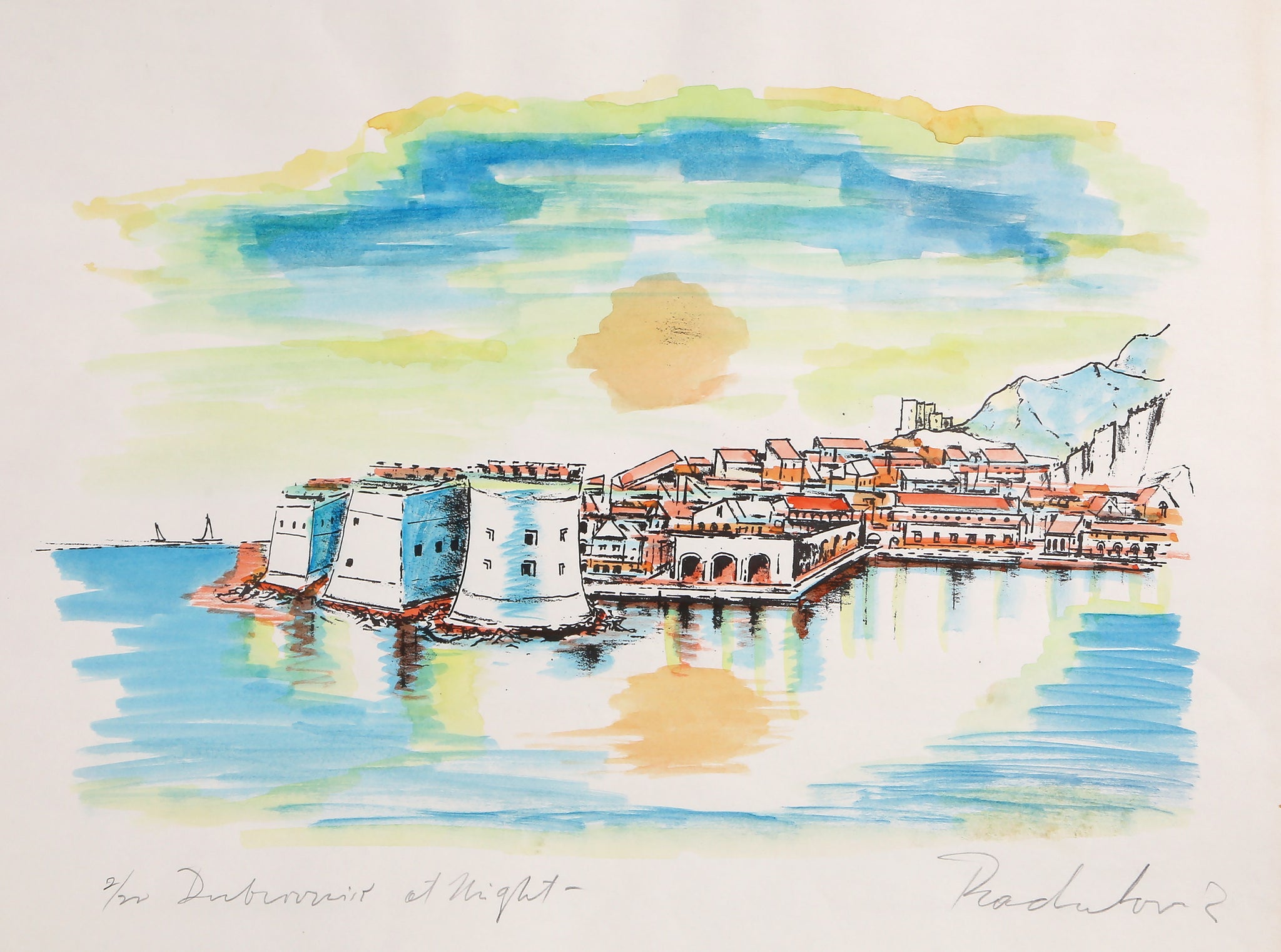 Experience the enchanting nocturnal beauty of the Adriatic with "Dubrovnik at Night," a hand-colored Impressionist print by Savo Radulović that captures the magical atmosphere of this historic Croatian cityscape under moonlight. This evocative print features the waterfront and architectural splendor of Dubrovnik illuminated by both moon and sun in a dreamlike composition, rendered in Radulović's distinctive impressionistic style that celebrates the interplay of light and shadow along the Mediterranean coast. The artist's delicate hand-coloring technique adds warmth and depth to this nocturnal scene, making this print a captivating addition to any collection focused on European cityscapes, Impressionism, or works that celebrate the romantic beauty of Adriatic coastal cities at night.