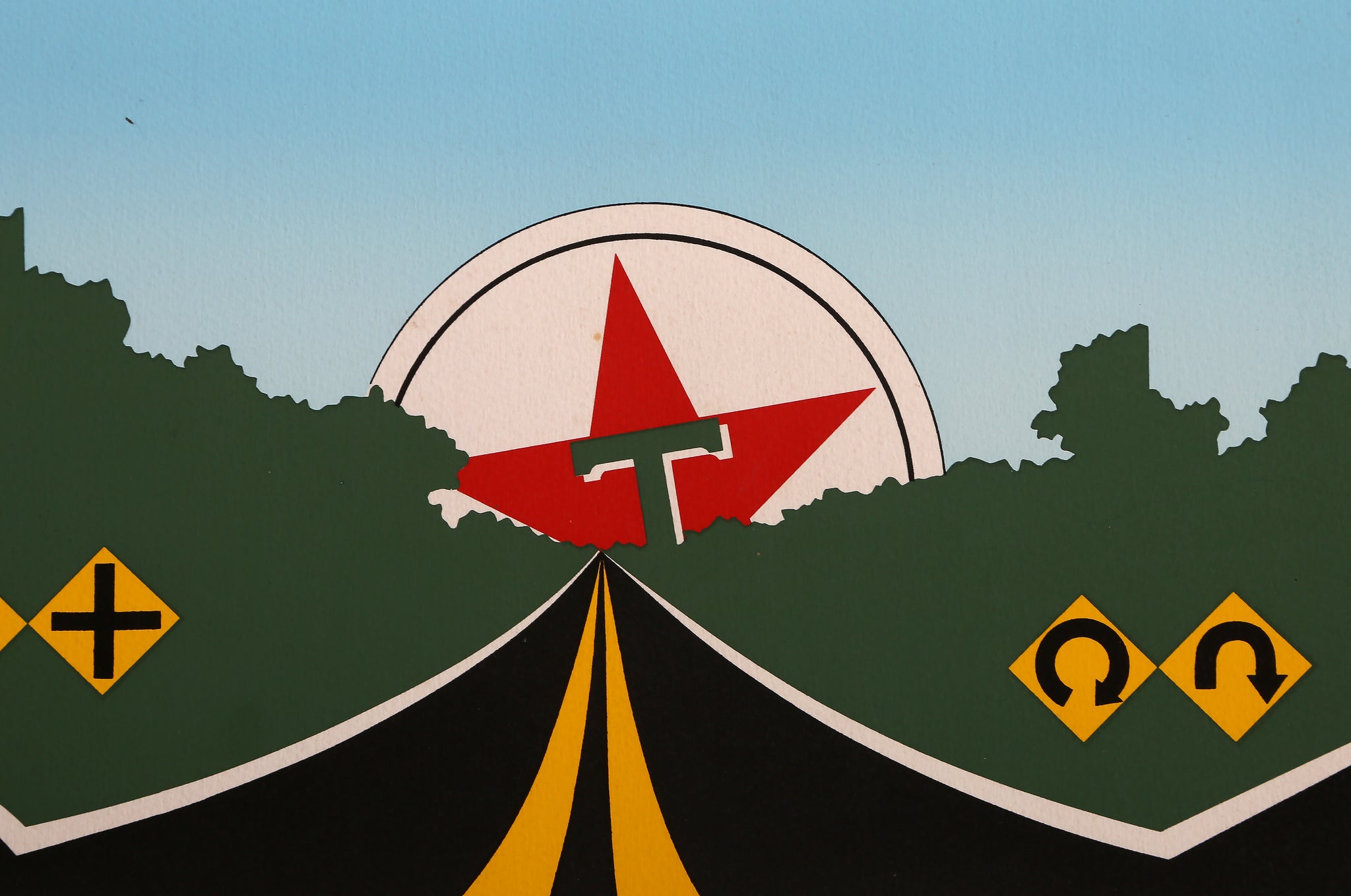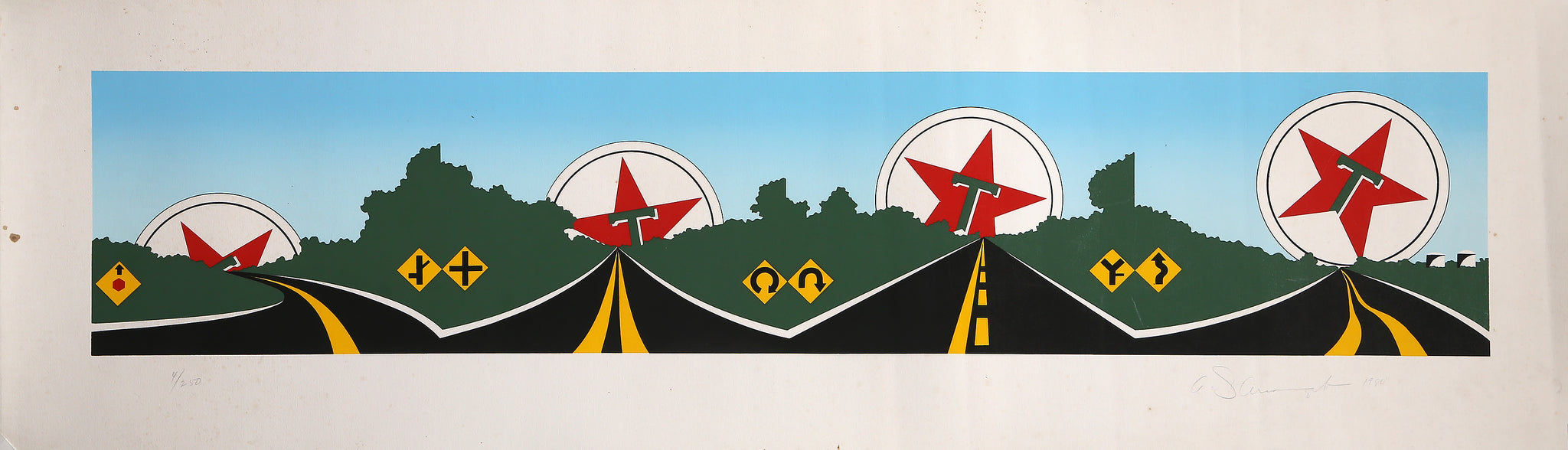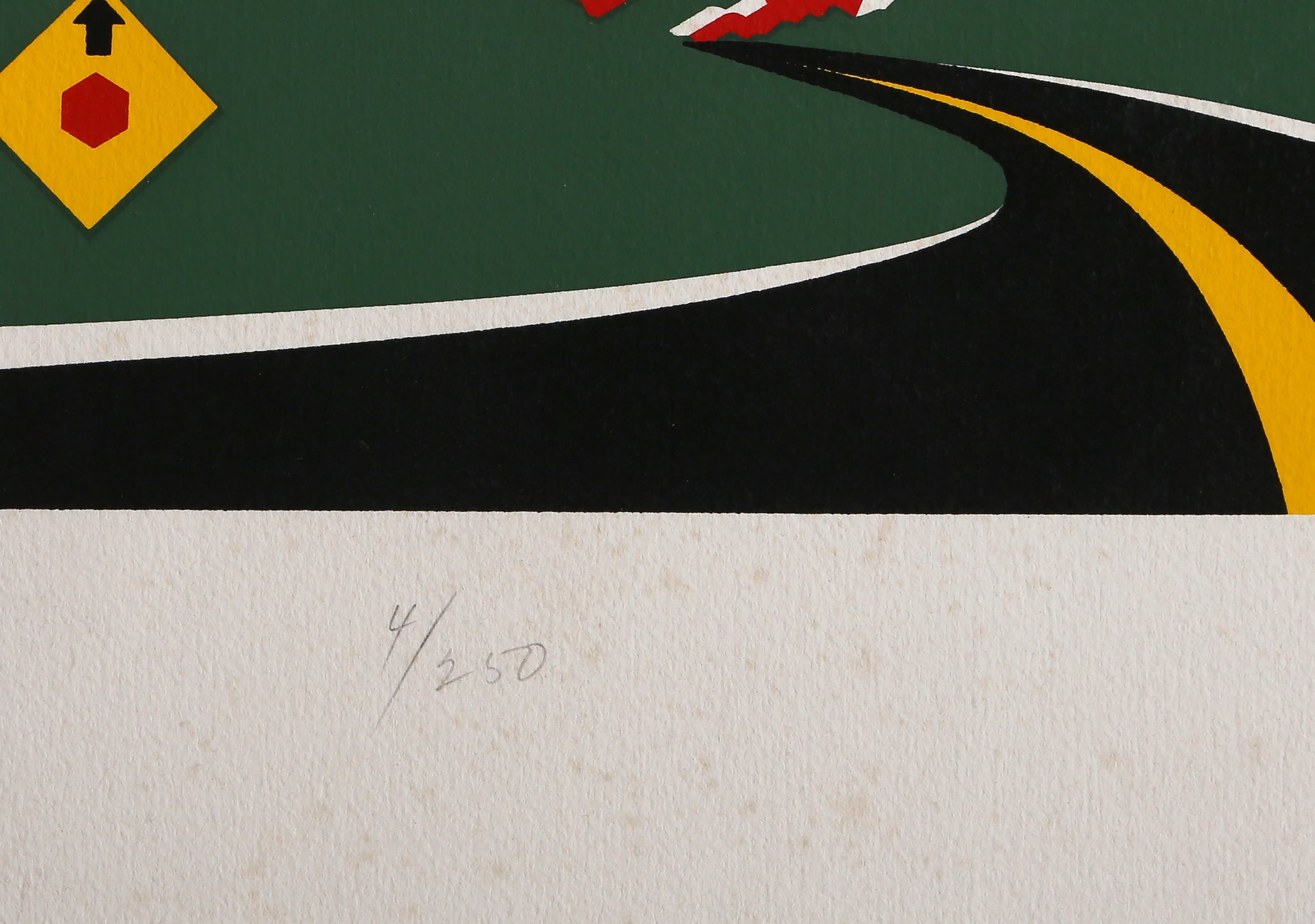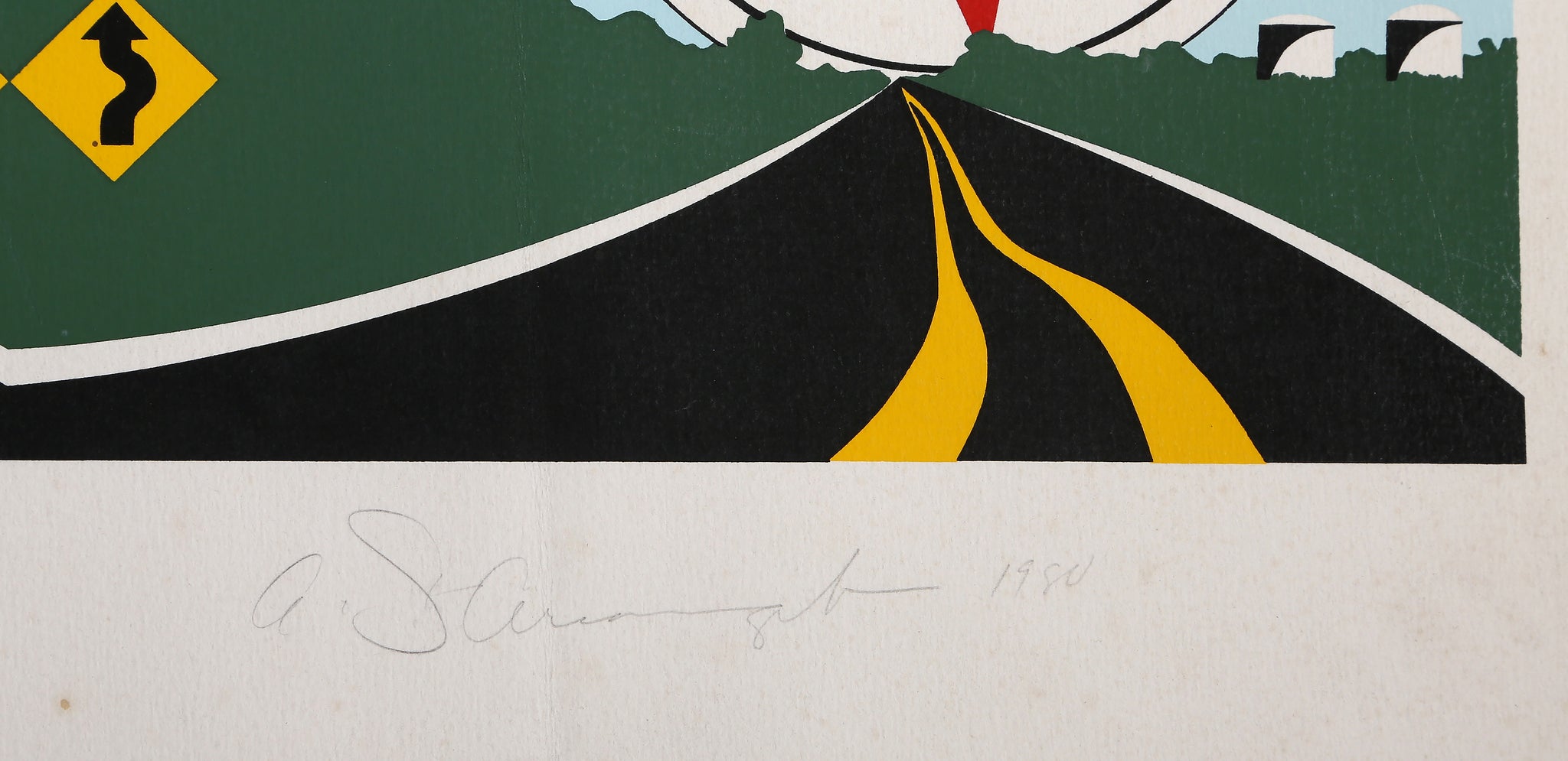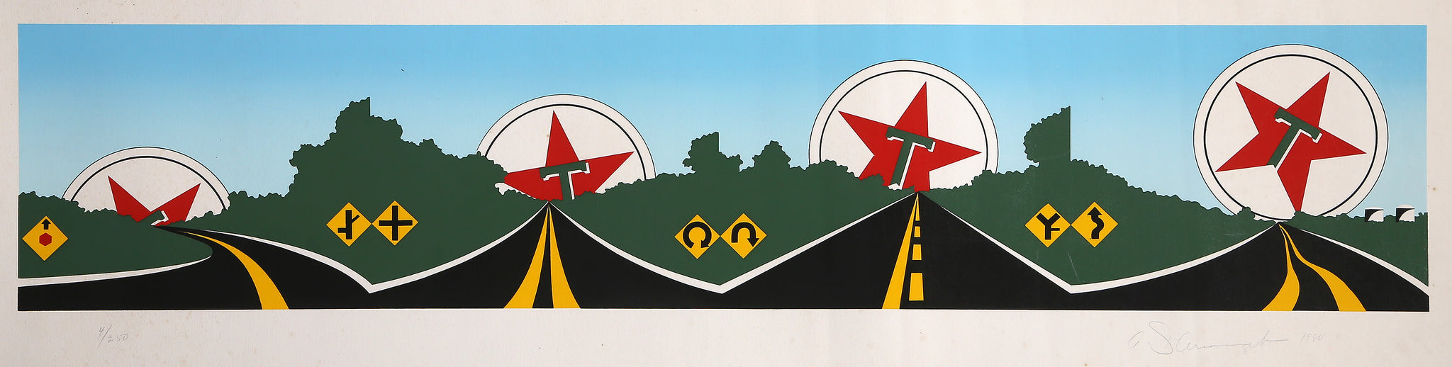 Experience the iconic intersection of Pop Art and Geometric Art with this hand-signed screenprint capturing the American roadside landscape featuring a Texaco star, highway junction, and trees. Allan D'Arcangelo's "Morning Star (Texaco)" exemplifies the Pop Art and Geometric Art movements' celebration of American commercial culture and highway aesthetics, where bold geometric forms and Pop Art sensibilities transform everyday roadside imagery into striking visual commentary. The artist's precise geometric composition captures the essence of mid-century American driving culture and the visual language of the open road. A significant addition for collectors of Pop Art, Geometric Art, and Landscapes seeking prints that celebrate American roadside iconography.