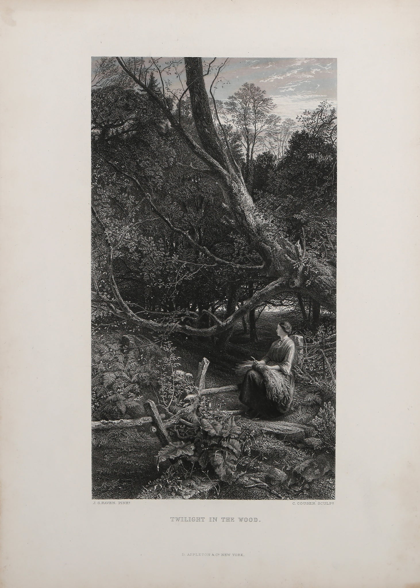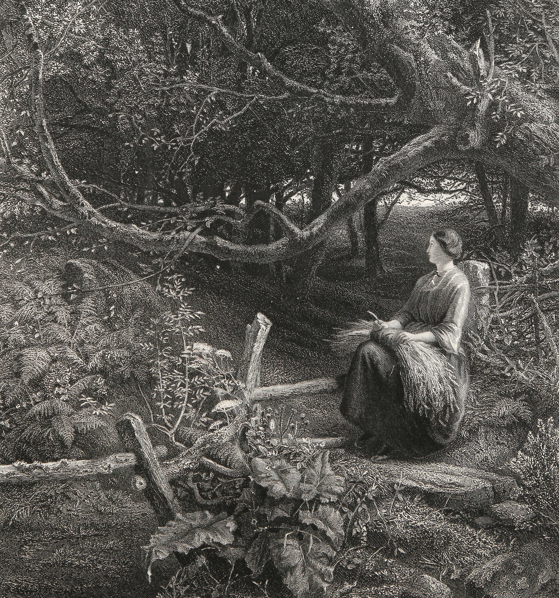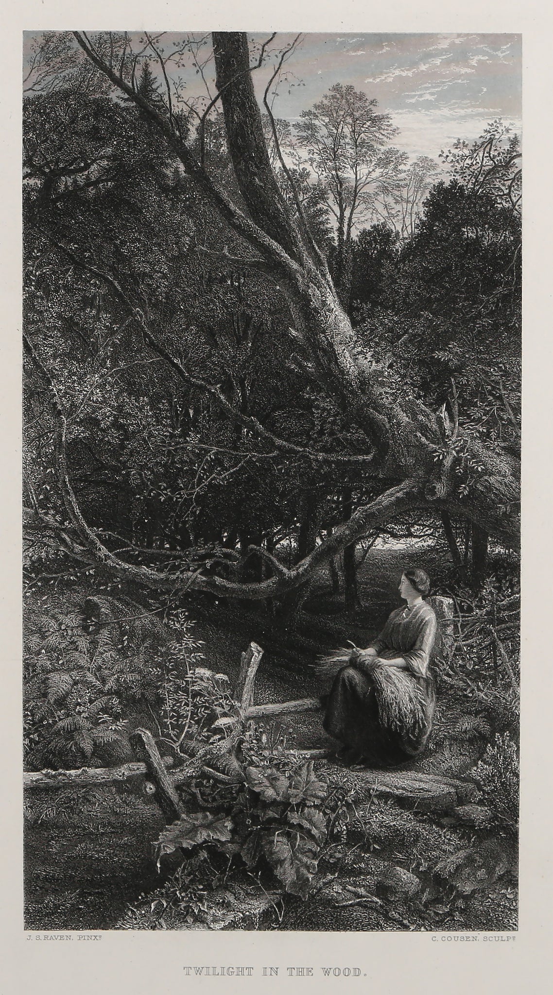 This serene engraving by John Samuel Raven depicts a woman sitting on a forest path at twilight, surrounded by towering trees, rocks, and lush plants in a peaceful woodland gathering. Created in the Romanticism tradition of 19th-century landscape art, Raven's detailed line work captures the tranquil beauty of nature and the contemplative solitude of the forest setting. The composition features a winding path through dense vegetation, characteristic of Pre-Twentieth Century explorations of natural landscapes and the sublime beauty of untamed wilderness. A beautiful example of Raven's engraving work that showcases his ability to render atmospheric woodland scenes with romantic sensibility and meticulous detail.