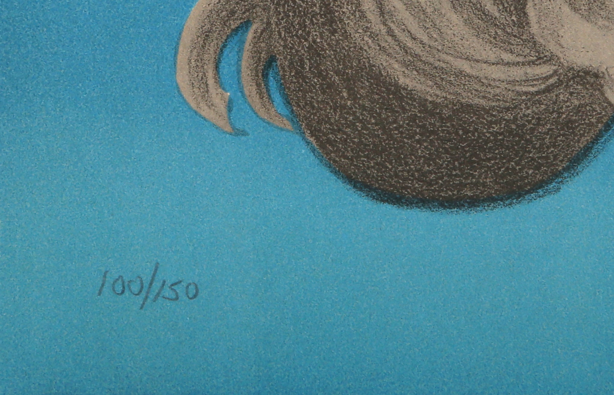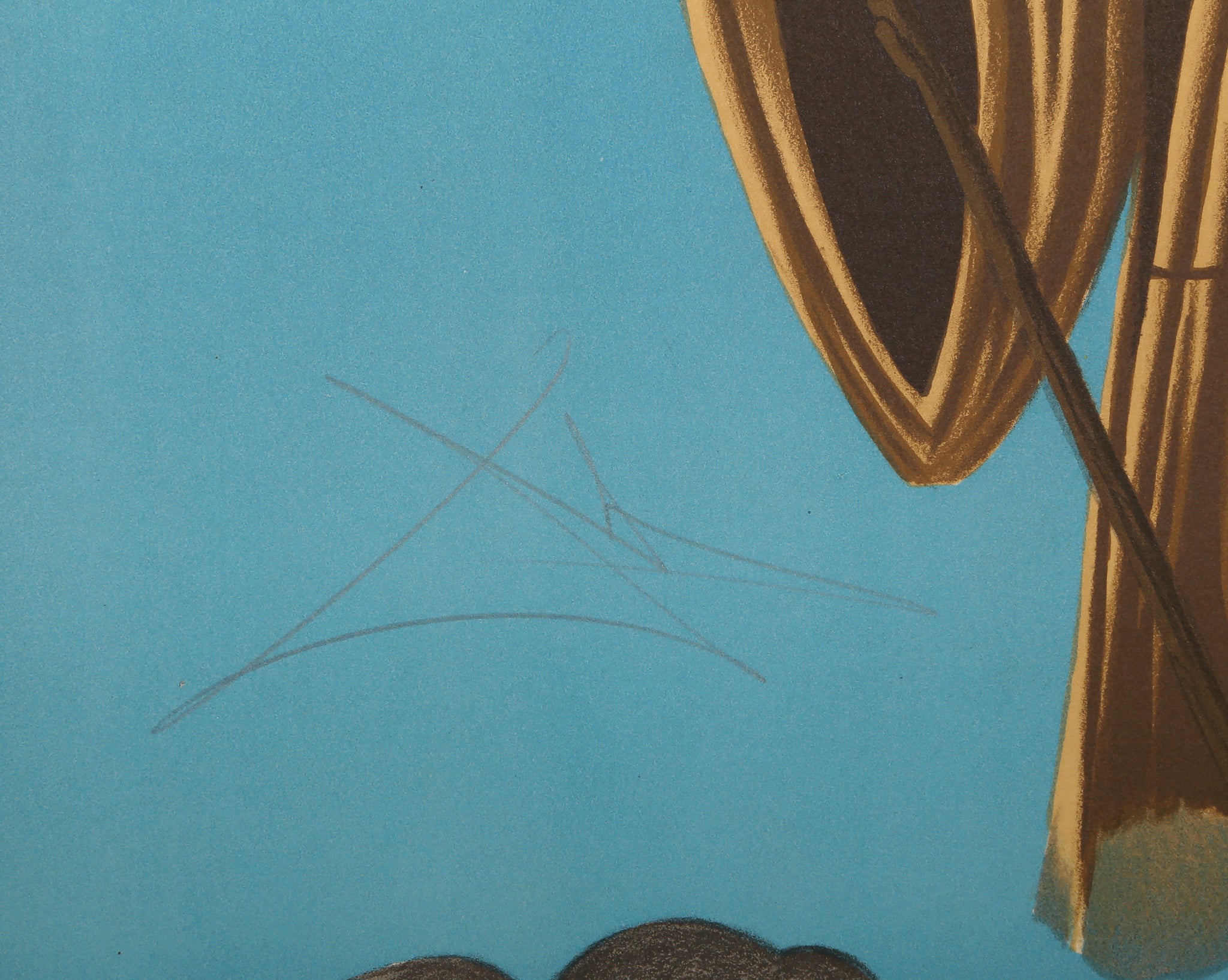 A clock-faced figure wearing monk's robes floats in a blue void above a roiling storm cloud. This Surrealist lithograph by Salvador Dali shows the figure in movement, traveling with their walking stick and a lantern adorned with butterflies. This excellent piece is signed and numbered by Dali on the front in pencil, with authenticity confirmed and counter-signed by Frank Hunter at the Salvador Dali Archives on the verso.