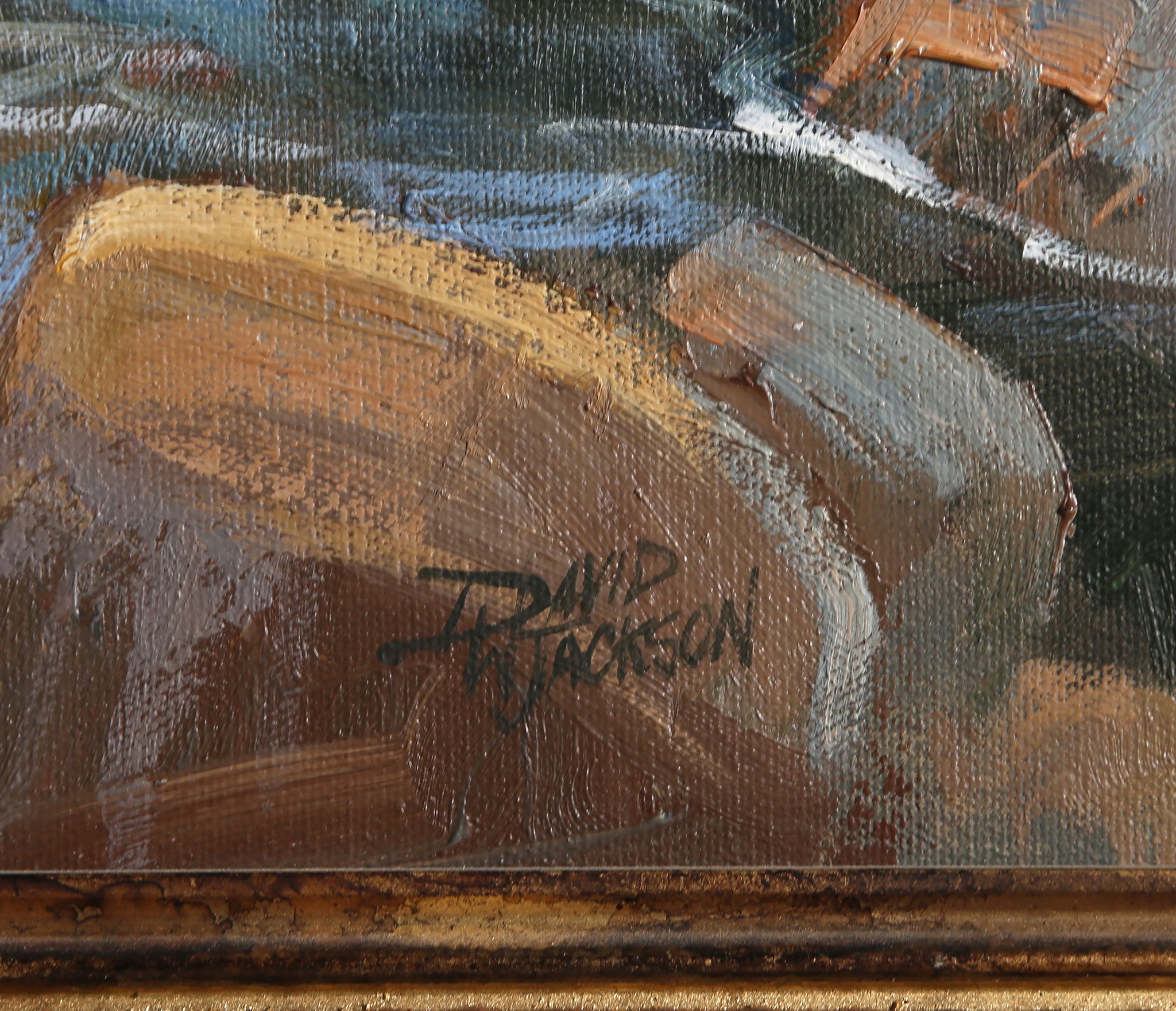 Artist: David Jackson, American (1951 - ) - Deer Crossing Creek. Medium: Oil on Canvas, signed lower right, Size: 29.5 x 14.5 in. (74.93 x 36.83 cm), Frame Size: 35 x 20 inches