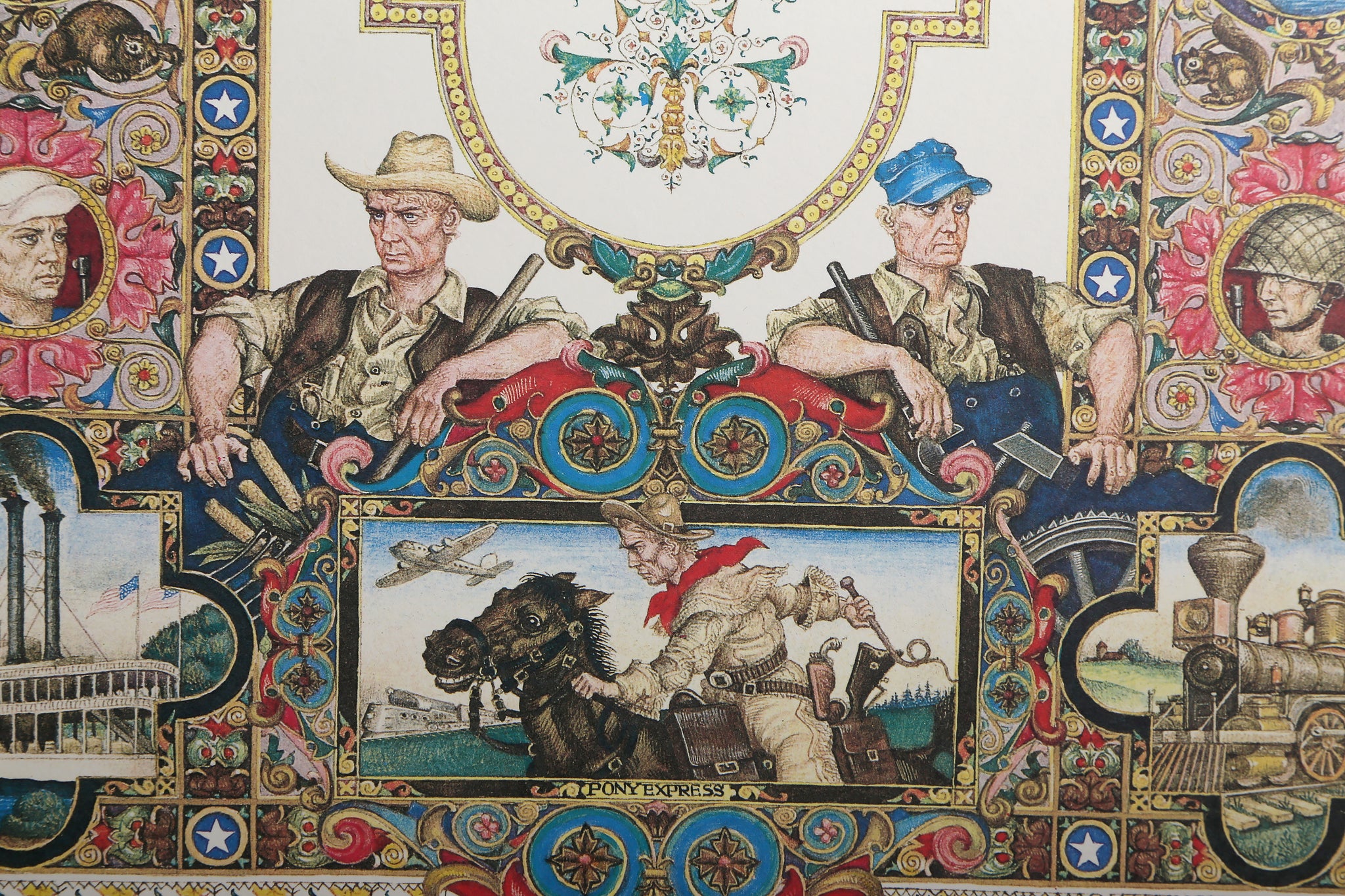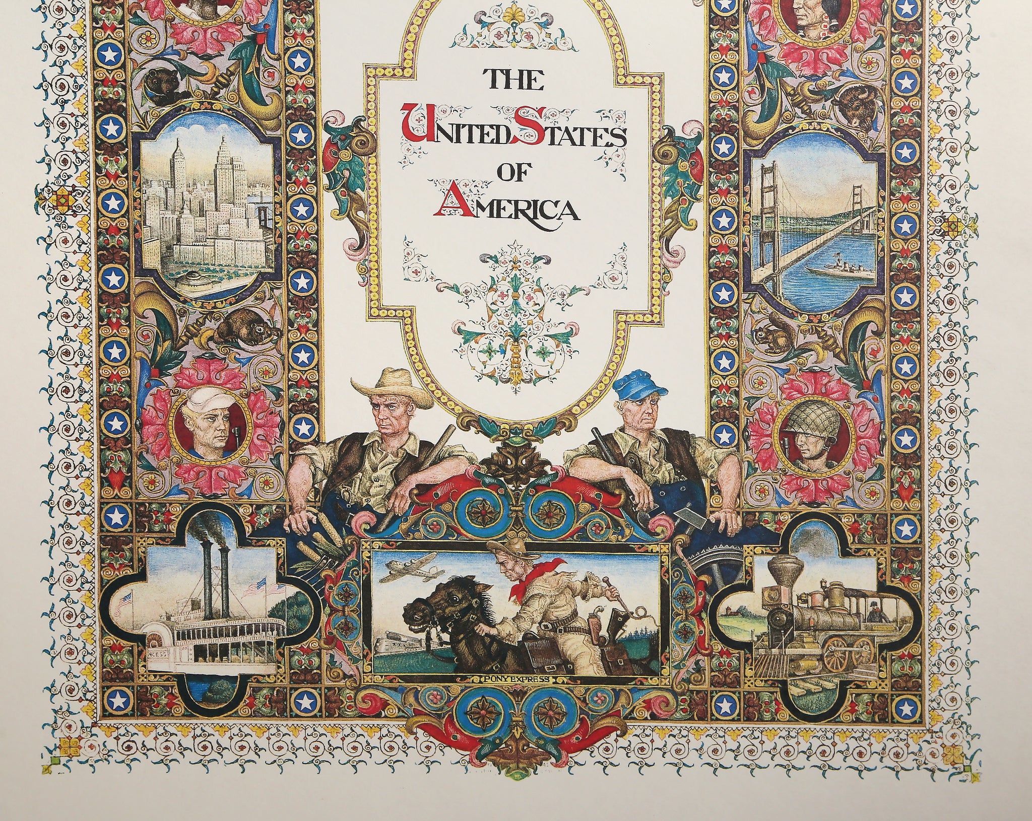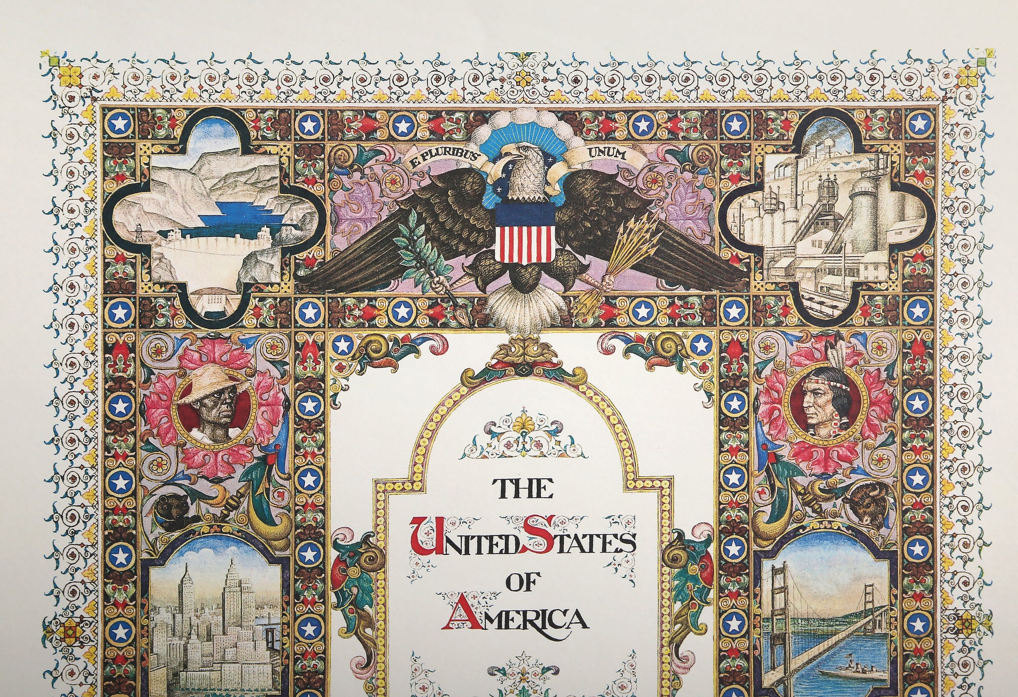 This American art offset lithograph by Arthur Szyk celebrates the United States of America with ornate illuminated manuscript styling featuring the Declaration of Independence, 1776 Congress, and John Hancock's signature. Szyk's work in American art transforms patriotic themes into decorative fine art through intricate borders and historical imagery. The print demonstrates the artist's dedication to honoring American history through beautiful illumination techniques, celebrating the founding principles and courageous leaders who established the nation's independence and democratic ideals.