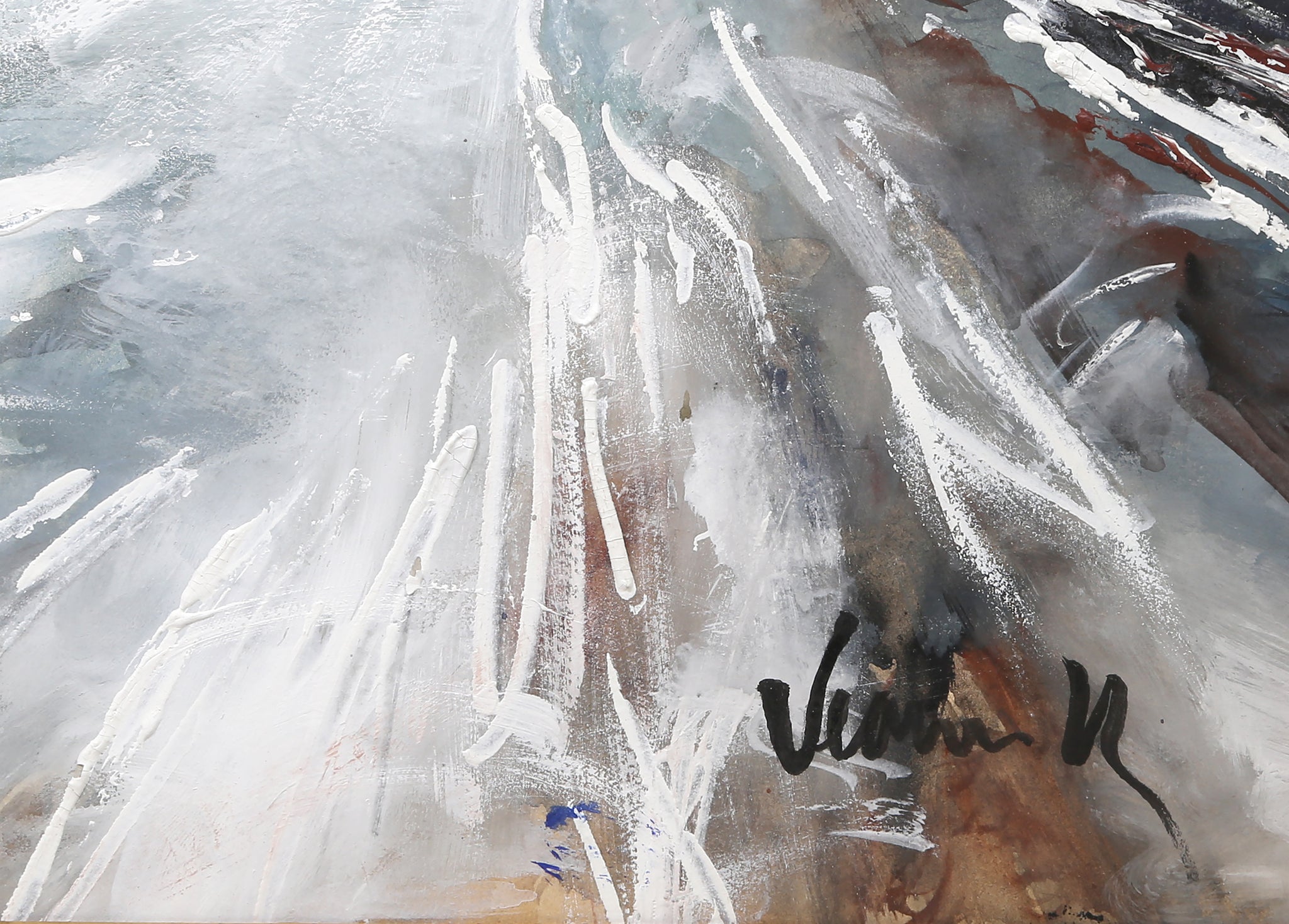 This scene by French artist Maurice Vlaminck features a regular subject of the artist's practice. Rendered in gouache, acrylic, and India ink on paper, Vlaminck shows a solitary snowy road winding through a small village. Overhead, dark clouds battle with the fading blue sky as night begins to fall. Vlaminck often returned to this scene over and over again in his work, depicting it in every medium and every season. Although the angle and the clarity of details would change slightly with each rendition, Vlaminck clearly had a great fondness for this little road. In returning to it time and time again, Vlaminck follows in a tradition similar to Monet and his haystacks, one that develops an intimate knowledge of subject, light, and form. Provenance: Galerie Felix Vercel, New York.