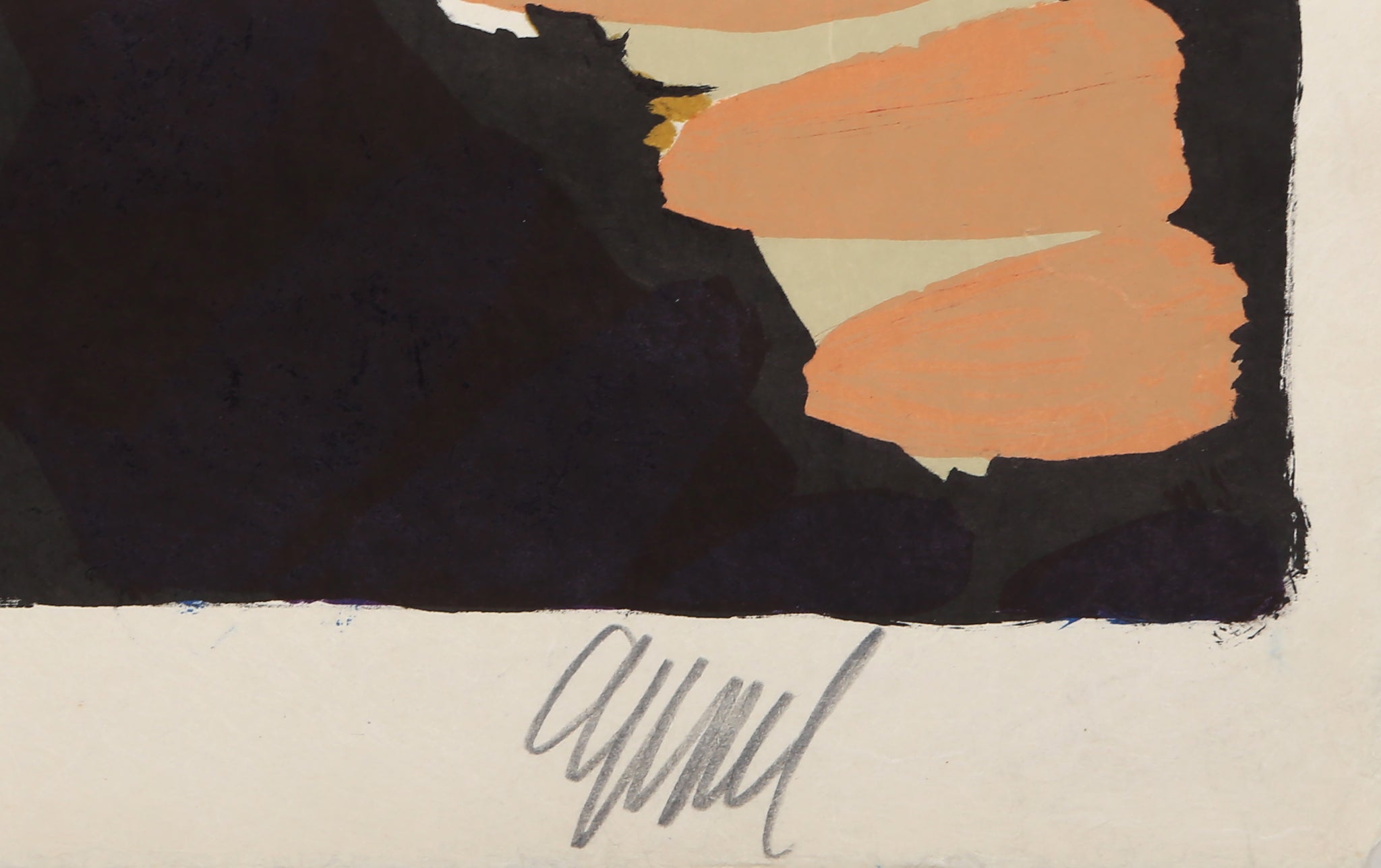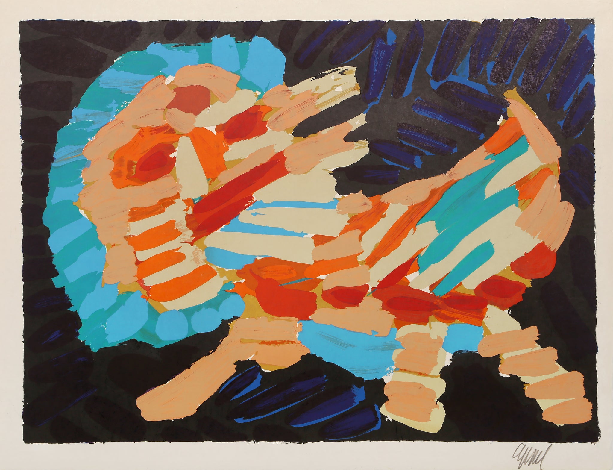 This signed and numbered lithograph on Japon paper is from a portfolio of 17 prints by Modern artist Karel Appel. He admired the domestic house cat for its aloof, yet instinctive, demeanor, and it became one of his favorite subjects. The portfolio "Cats" is a visual meditation on the animals’ behavior in which the artist depicts them resting, walking, stalking, frightened, and poised to attack.