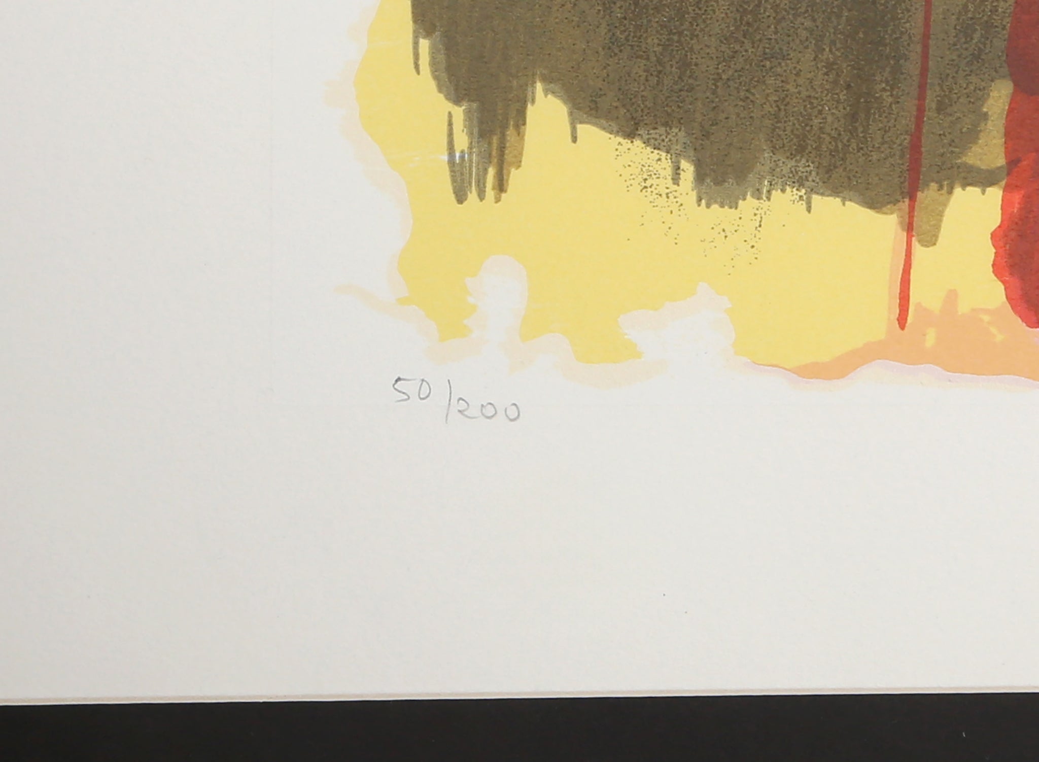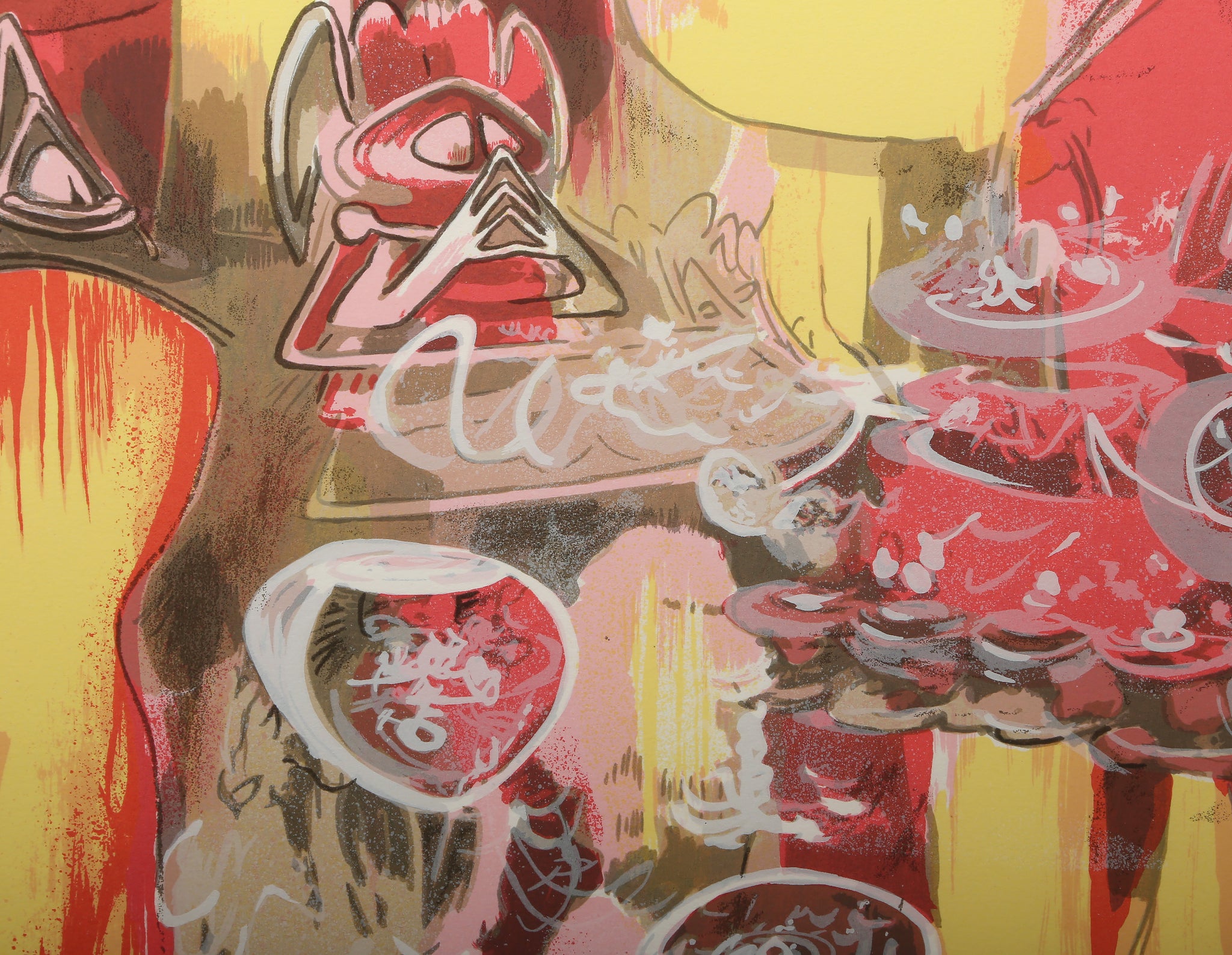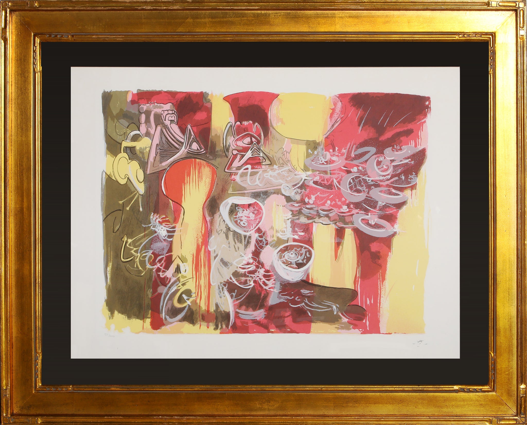 Roberto Matta, Chilean (1911 - 2002) - L'eau est Mana. Year: 1974, Medium: Lithograph on Arches Paper, signed and numbered in pencil, Edition: 50/200, Image Size: 21.5 x 30 inches, Size: 26 x 40 in. (66.04 x 101.6 cm), Frame Size: 36.5 x 46.5 inches, Description: In this Roberto Matta print, organic forms are placed over one another, overlapping with streaks of color and curving lines throughout the composition. The work showcases the artist's exploration into abstraction and his method of layering biomorphic forms with expanses of brushstrokes.