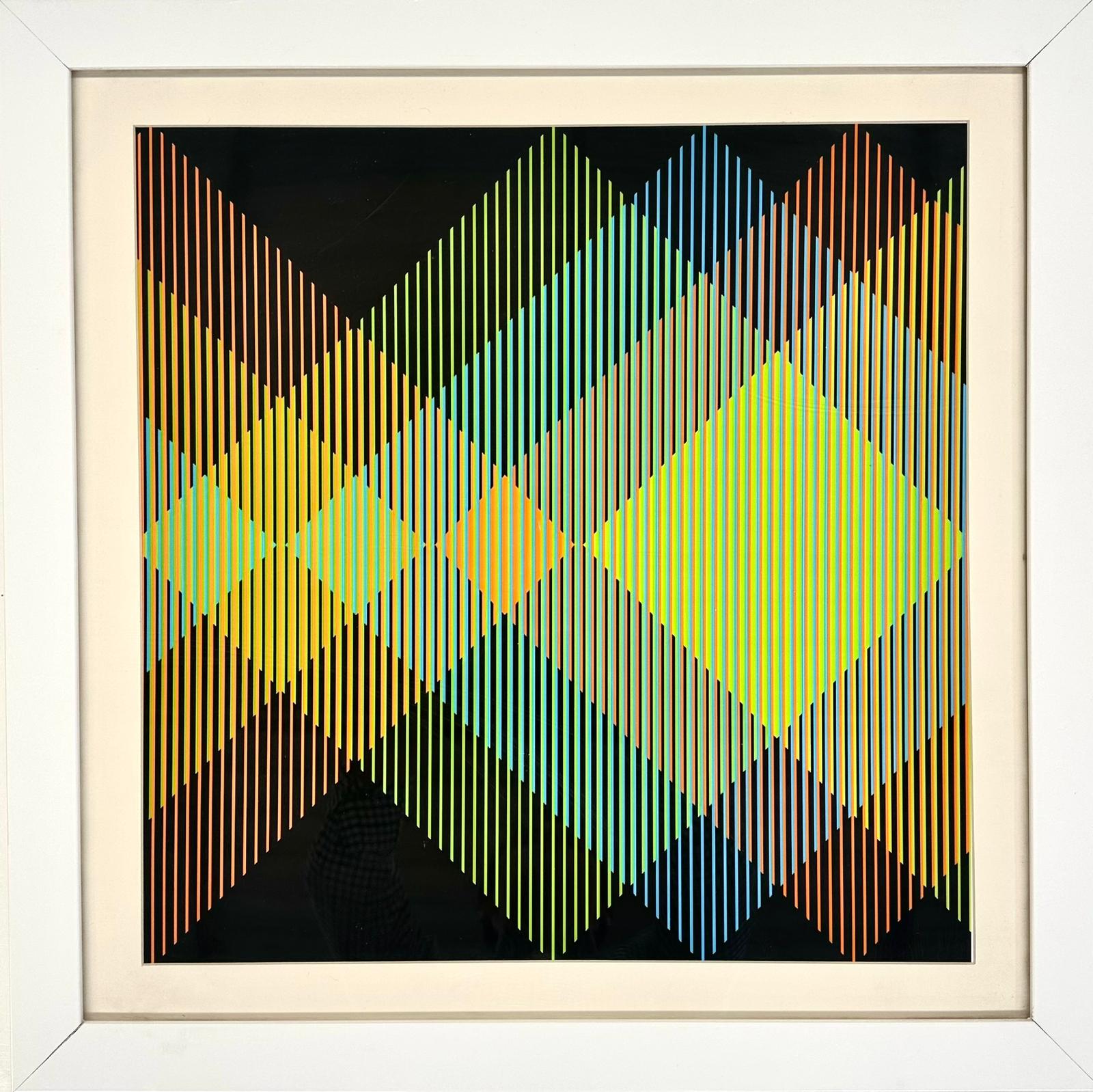 Discover this striking geometric art print featuring mesmerizing diamond shapes and optical illusions through bold stripes and squares. This Latin American art piece exemplifies the Geometric Art and Optical Art movements, creating dynamic visual effects that captivate viewers with its precise mathematical patterns and rhythmic repetition. The interplay of geometric forms demonstrates the artist's mastery of spatial relationships and color theory, making it a sophisticated addition to any contemporary art collection. Perfect for collectors seeking museum-quality prints that showcase the intersection of art, mathematics, and visual perception.