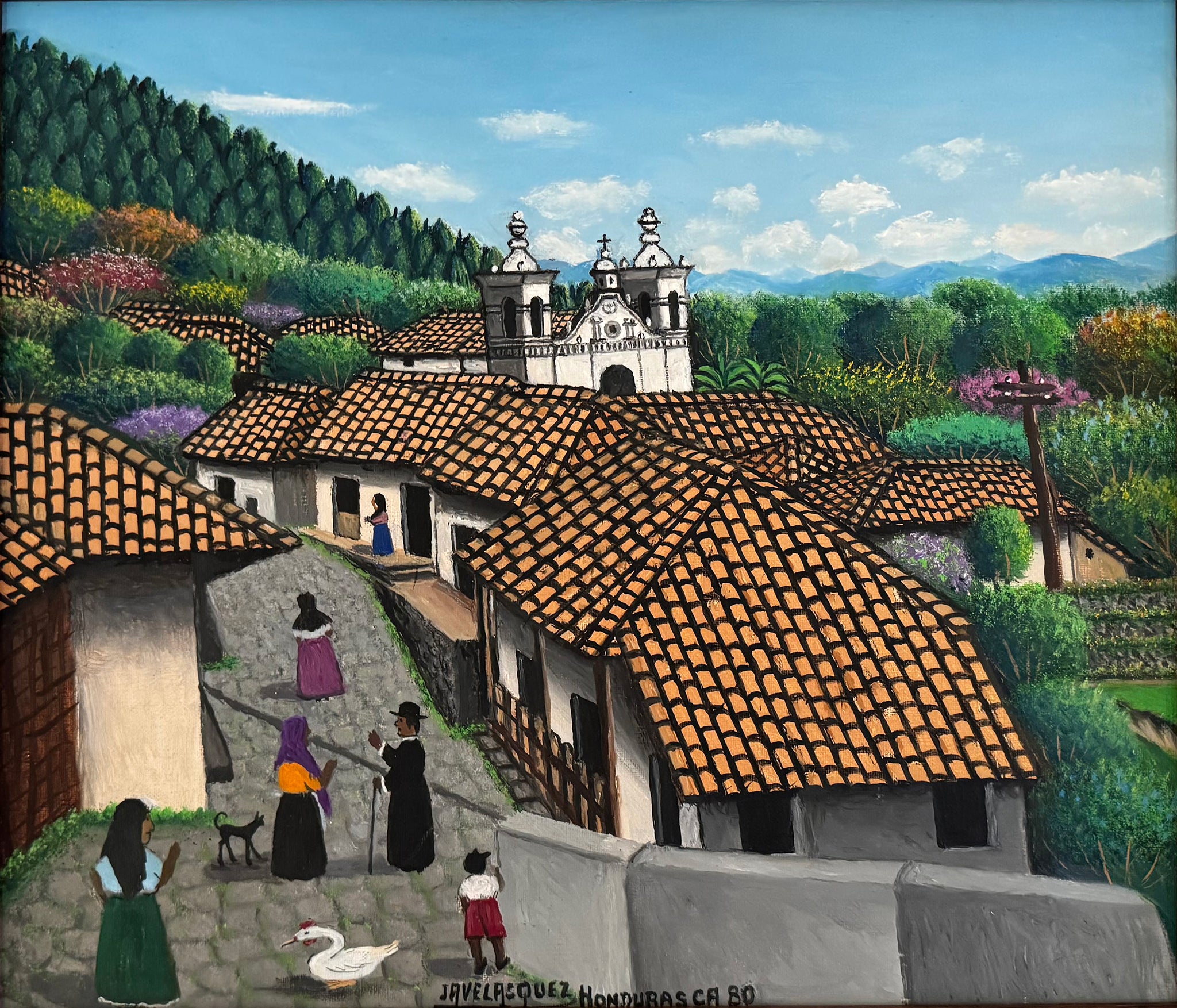This view of a small town in the Honduran hills with a white church rising in the distance is a recurring motif in the work of artist Jose Antonio Velasquez. Once a booming silver-mining hub, this town had quieted down significantly by the time the artist arrived to take over as the telegram operator. He became a beloved figure, not just for sending and receiving messages from out of town, but also as a painter, barber, and later even mayor. This painting is beautifully framed and is signed by the artist in the lower right.