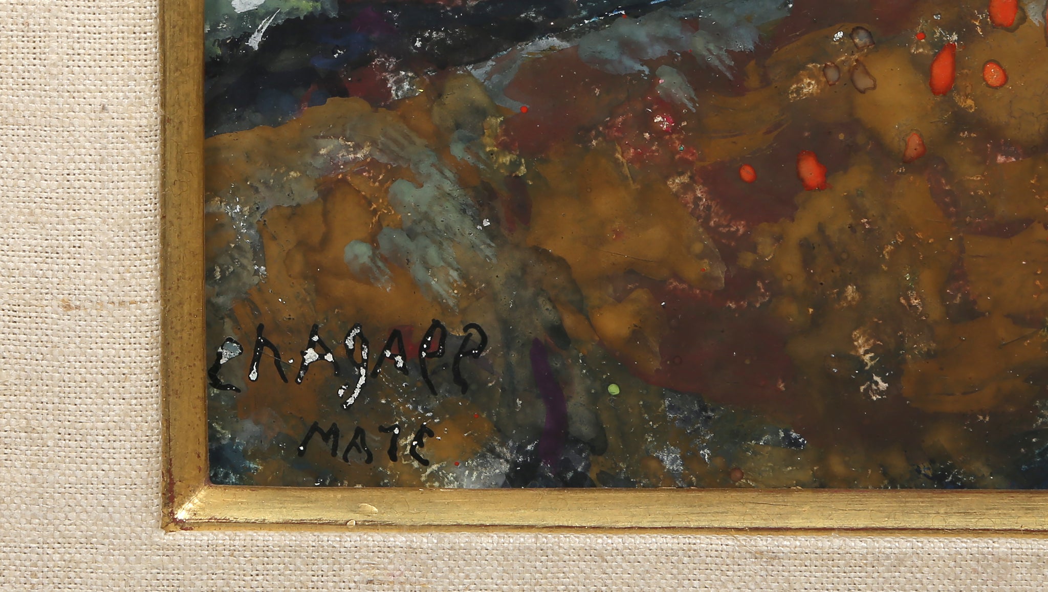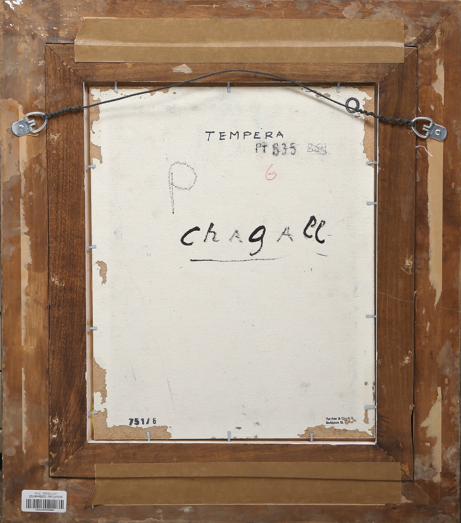 The Modern Russian artist Marc Chagall often took a very literal approach to naming his art. The title of this unique tempera and gouache painting on masonite translates very simply to "Peasant Woman with Green Face". Chagall regularly depicted people with unusual skin and hair colors, lending a magical quality to his pieces, a quality that is further emphasized by visual movement produced from swirling brushstrokes. This beautiful original painting is signed by the artist in the lower right and on the verso and is framed in an ornate gold leaf frame. The authenticity of this work has been confirmed by the Comité Marc Chagall. Provenance: Pierre Matisse Gallery, New York (acquired directly from the artist). Galerie Felix Vercel, New York (acquired from the above in 1984). Acquired from the above by the previous owner in March 1988.