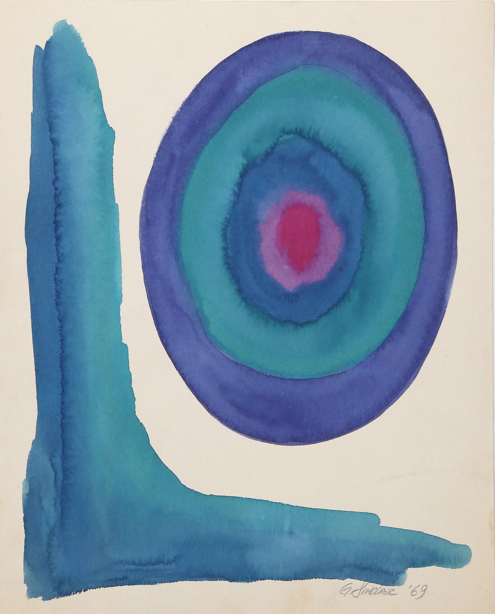 G Sinclair - Blue and Red Composition. Year: 1969, Medium: Watercolor on Paper, signed and dated in pencil, Image Size: 14 x 11 inches, Size: 15 x 12 in. (38.1 x 30.48 cm)