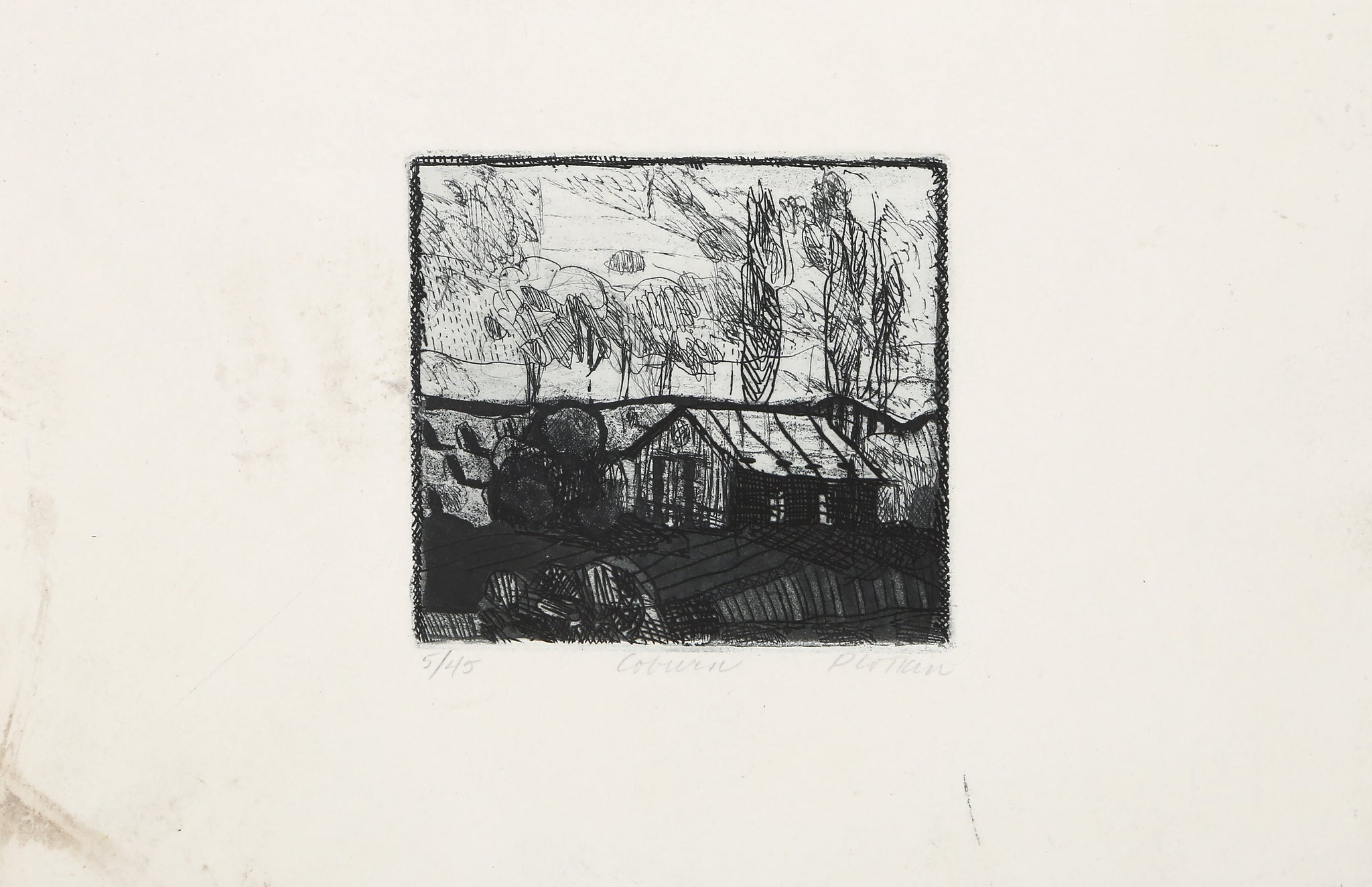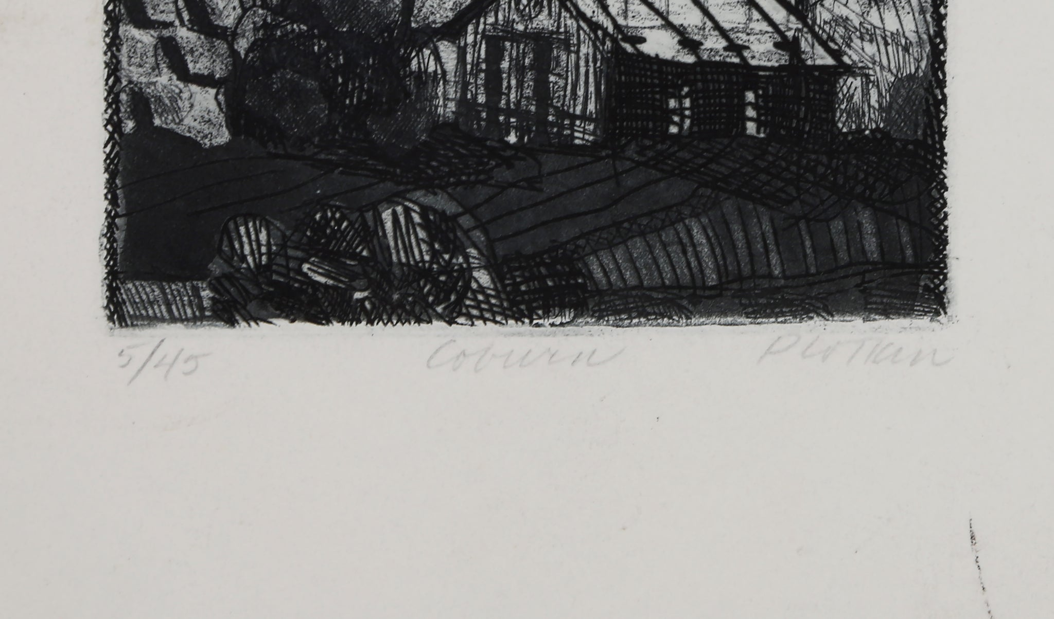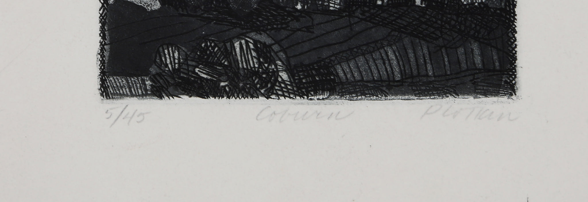 Linda Plotkin, American (1938 - ) - Coburn. Year: circa 1965, Medium: Etching on BFK Rives, signed, titled and numbered in pencil, Edition: 5/45, Image Size: 3.75 x 4.25 inches, Size: 7.5 x 11 in. (19.05 x 27.94 cm)