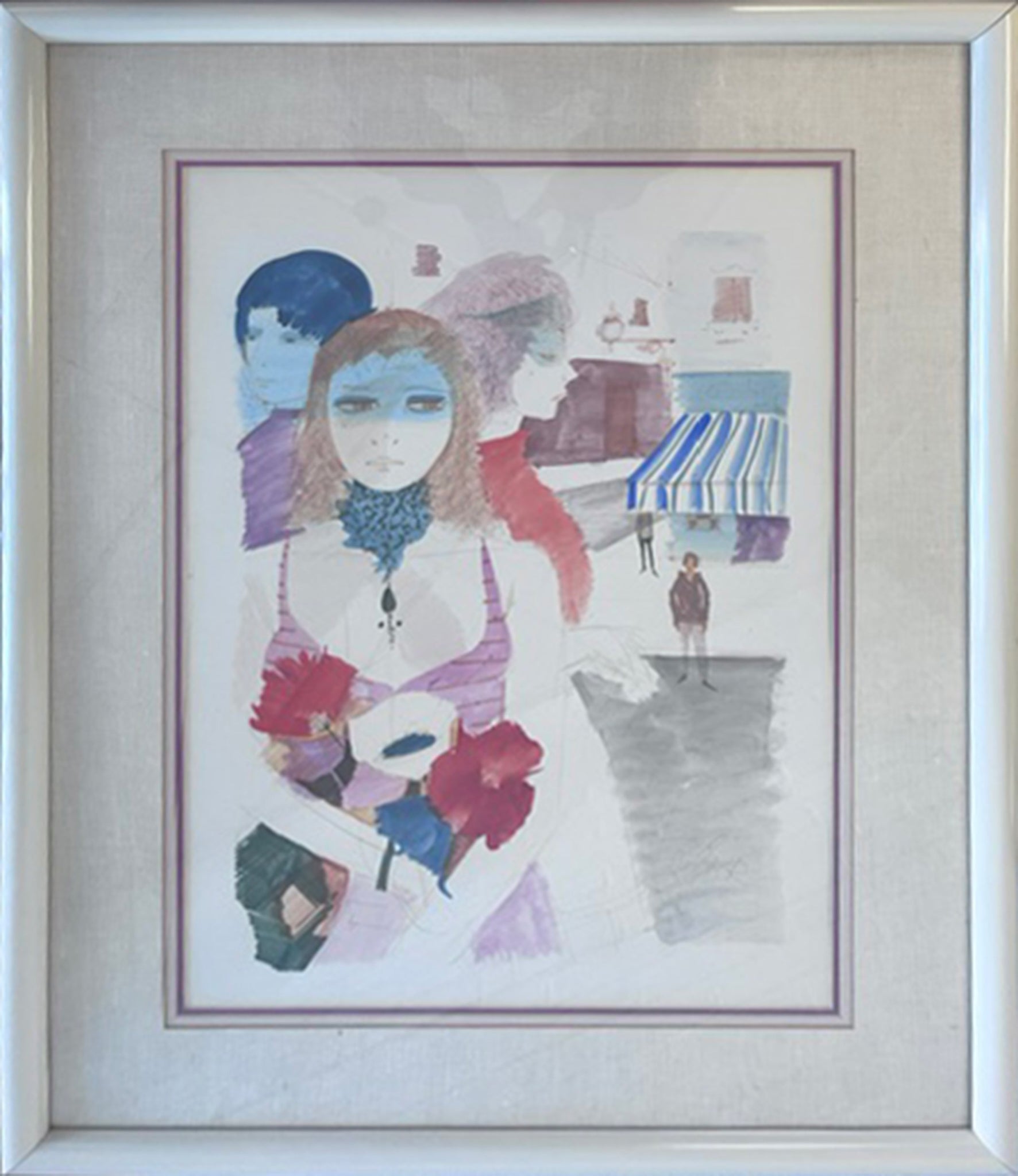 Charles Levier, French (1920 - 2003) - Flower Shopping. Year: circa 1970, Medium: Watercolor and Ink, Size: 26 x 18.25 in. (66.04 x 46.36 cm), Frame Size: 40.5 x 30.5 inches