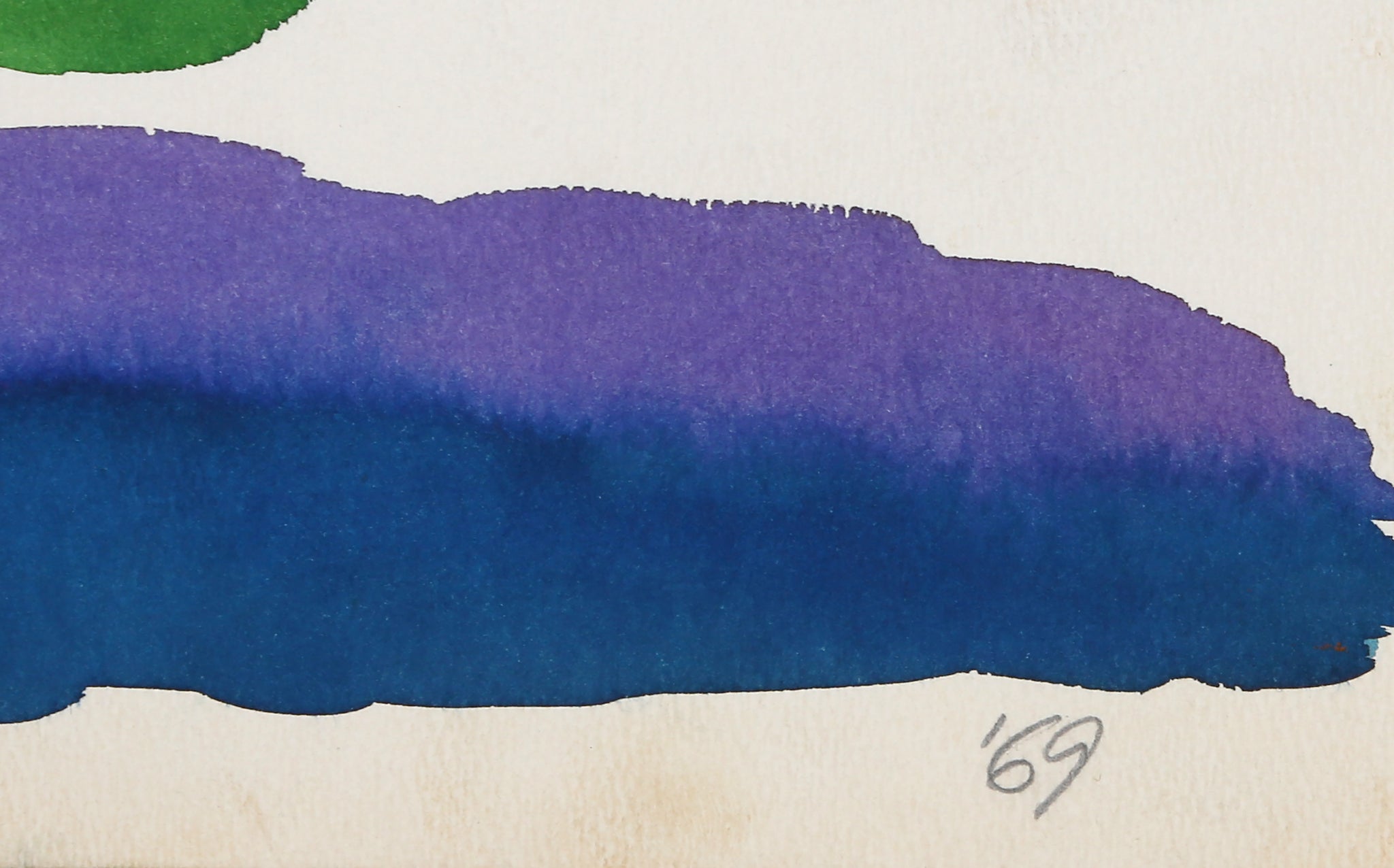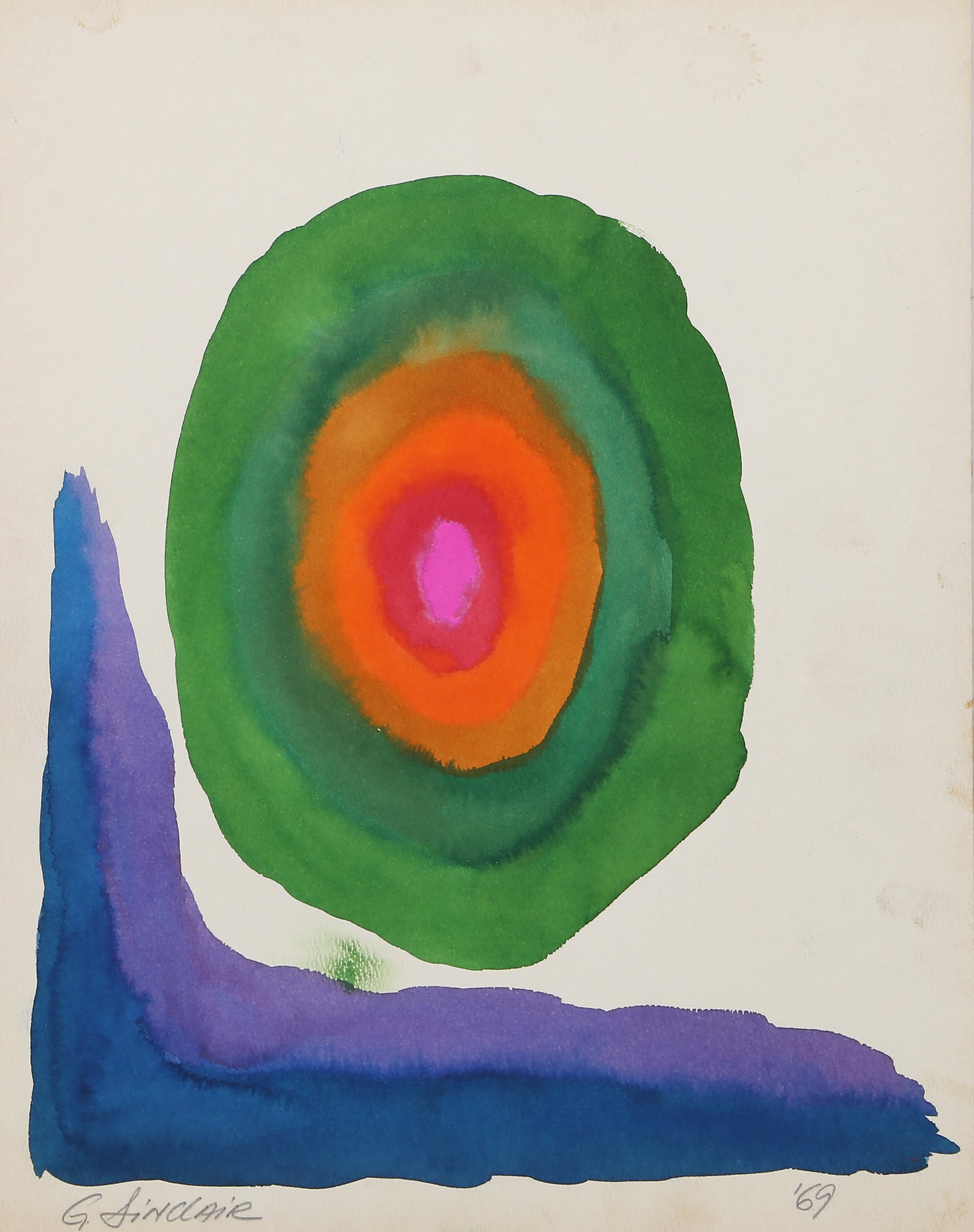 G Sinclair - Green and Purple Composition. Year: 1969, Medium: Watercolor on Paper, signed and dated in pencil, Image Size: 12.5 x 11 inches, Size: 15.25 x 12 in. (38.74 x 30.48 cm)