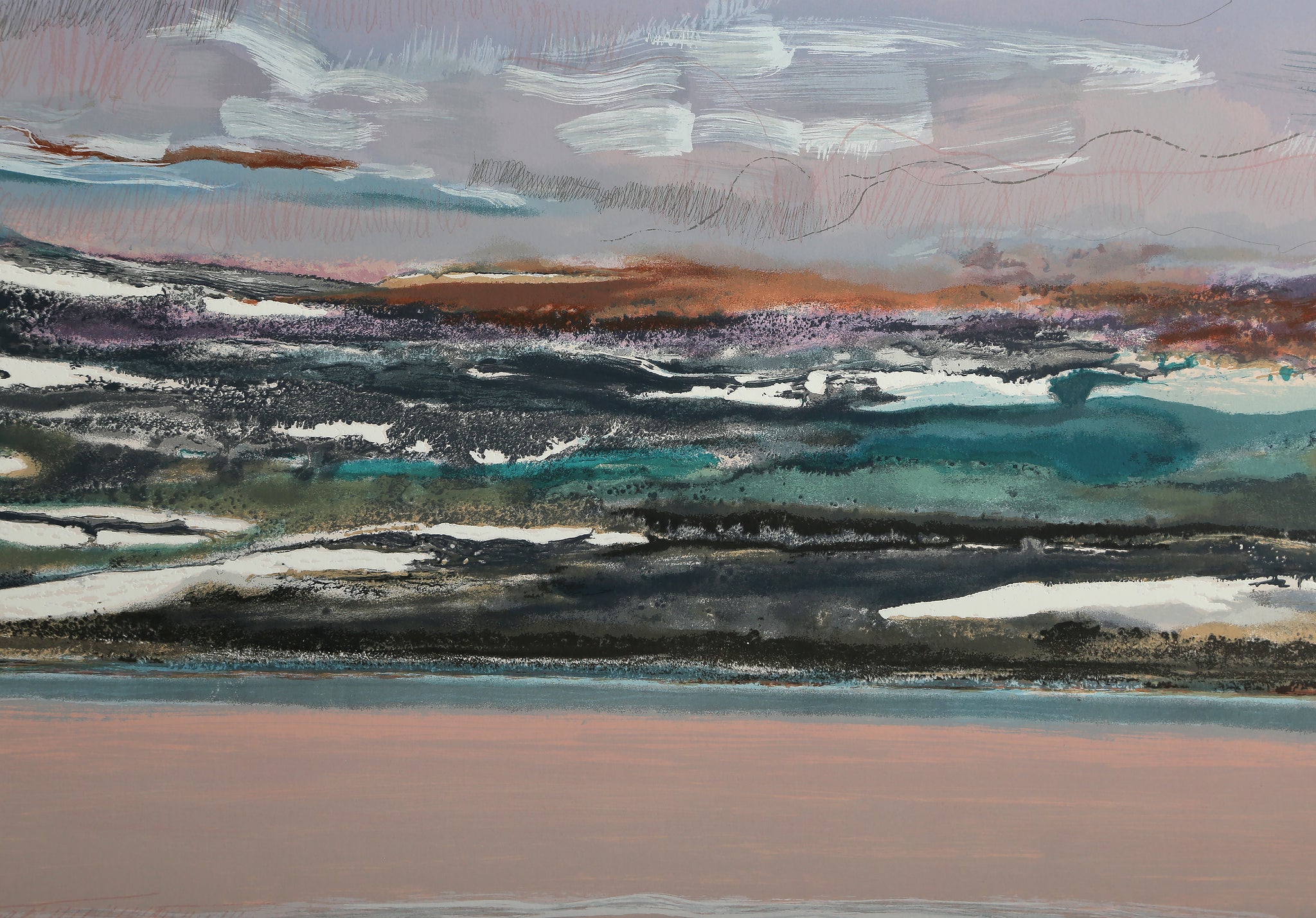 Immerse yourself in the tranquil beauty of dawn with this hand-signed Abstract Expressionist screenprint featuring abstract horizon lines and serene seascape elements in a limited edition. This evocative landscape print exemplifies the Abstract Expressionism and Landscapes movements through its atmospheric rendering of light and color that captures the essence of daybreak over water. The artist's masterful screenprint technique creates layers of subtle tones and gestural marks that evoke the peaceful transition from night to day. A beautiful example of contemporary Abstract Expressionist landscape art that brings meditative calm and natural beauty to any collection seeking sophisticated abstract seascape prints.