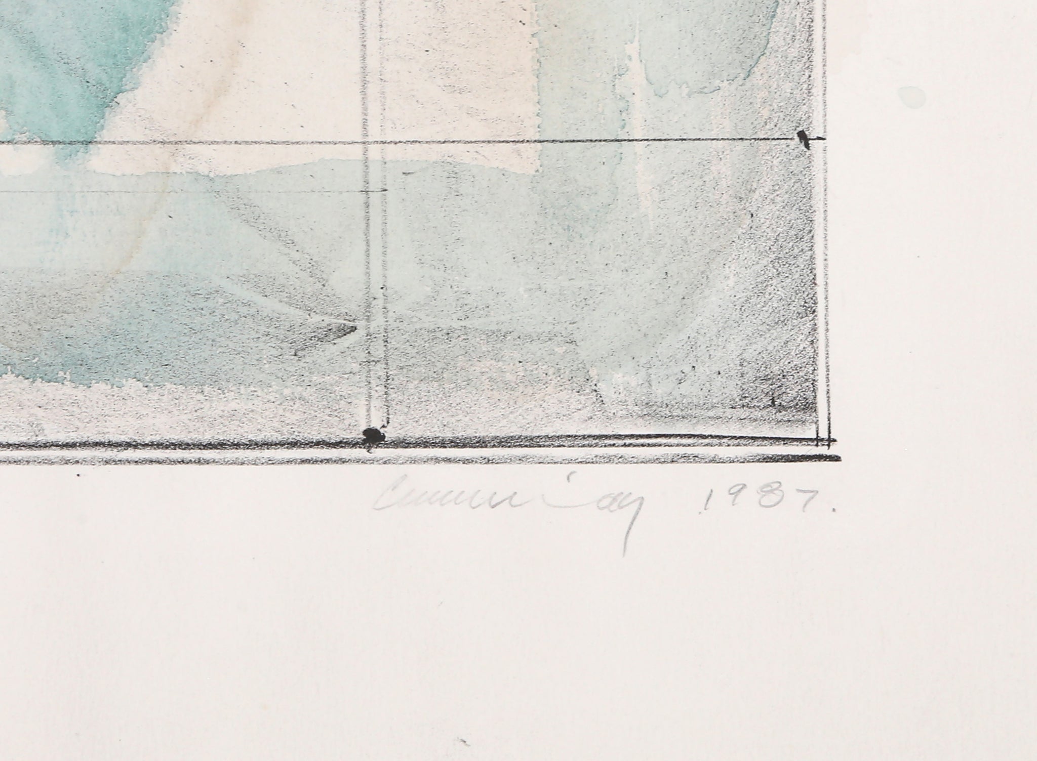 Robert Cumming's hand-signed lithograph presents a Surrealist vision of clasped hands transformed into knife-like forms, creating an unsettling yet captivating image. The watercolor-influenced print explores themes of connection, danger, and transformation through figurative imagery with dreamlike qualities. This intriguing work appeals to collectors of Surrealist art and those drawn to artwork that challenges perception and explores the psychological dimensions of everyday gestures.