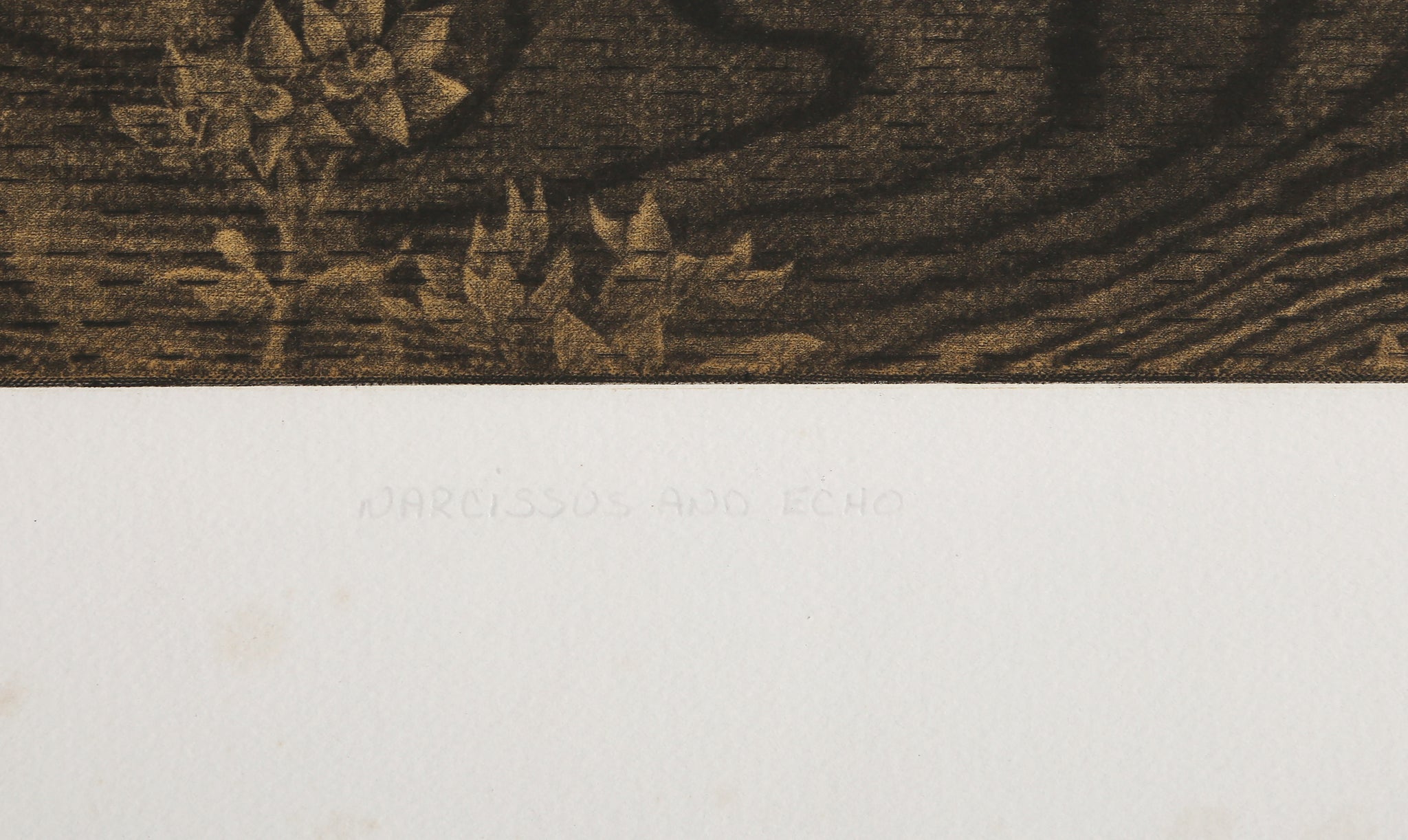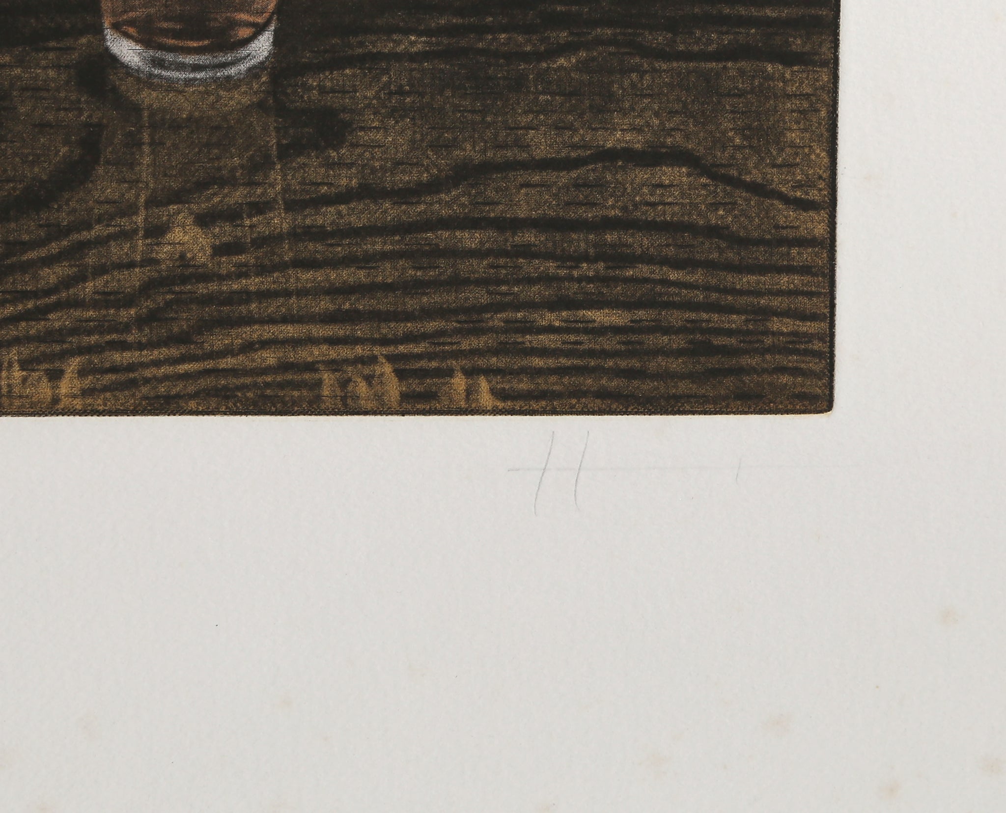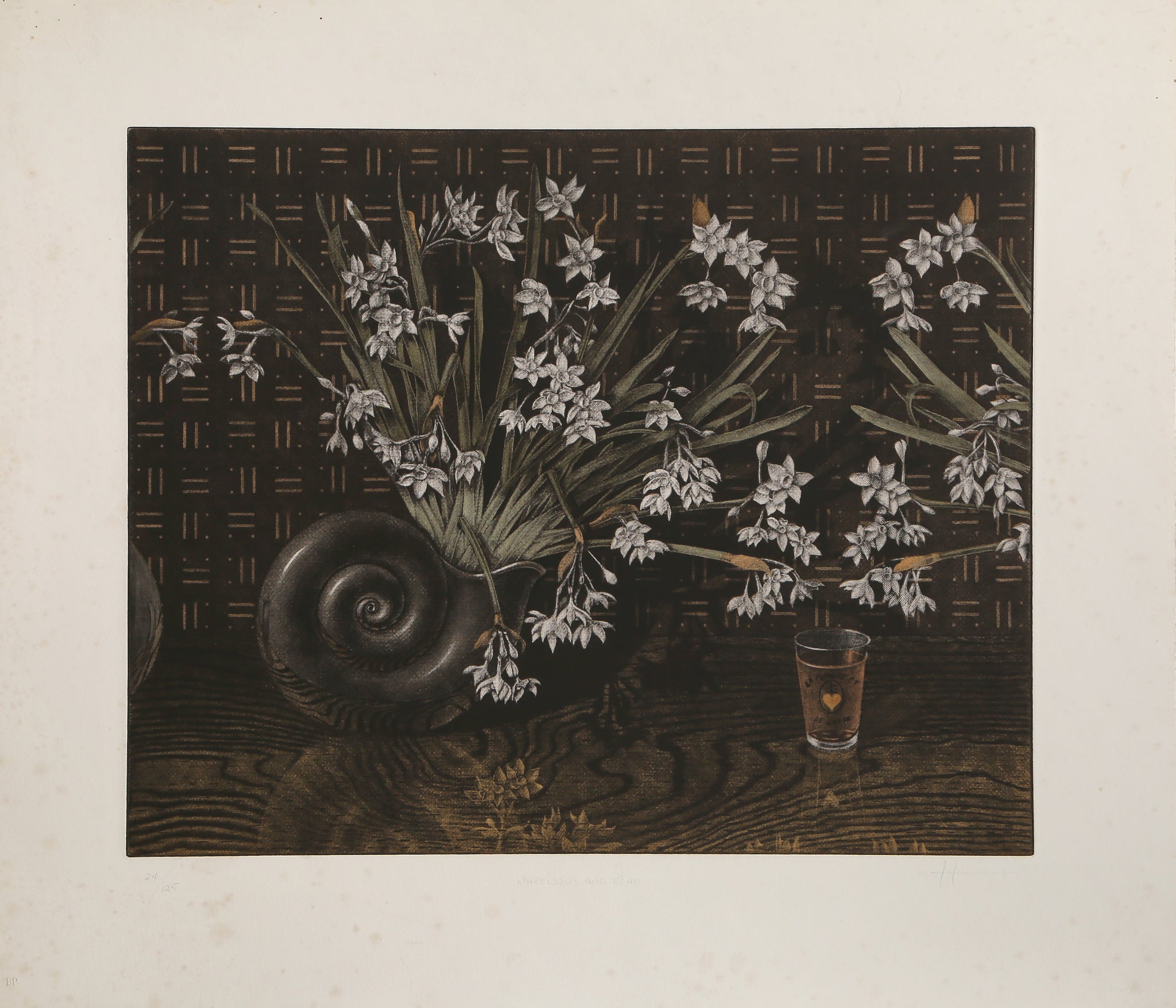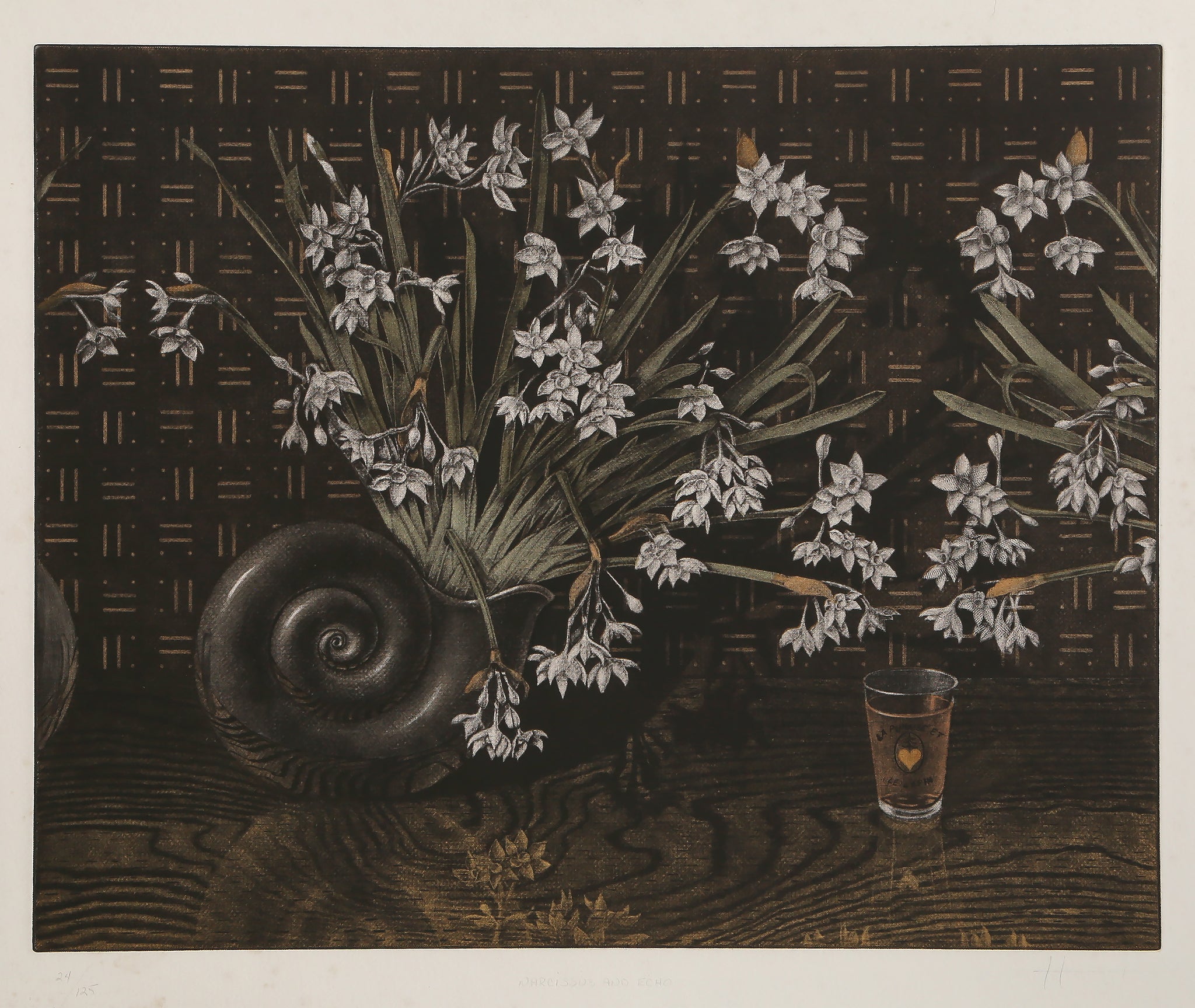 Discover this exquisite hand-signed Photorealist mezzotint featuring a meticulously rendered still life of flowers in glass with grain, shot glass, and wood table elements that blur the line between reality and art. This stunning Still Life print exemplifies the Photorealism and Surrealism movements through its extraordinary attention to detail and dreamlike composition that transforms everyday objects into subjects of contemplation. The artist's masterful mezzotint technique creates rich tonal variations and textural depth that bring the narcissus flowers and surrounding objects to life with remarkable clarity. A sophisticated example of contemporary Photorealist and Surrealist still life art that brings technical excellence and visual poetry to any collection seeking museum-quality prints with botanical and interior themes.