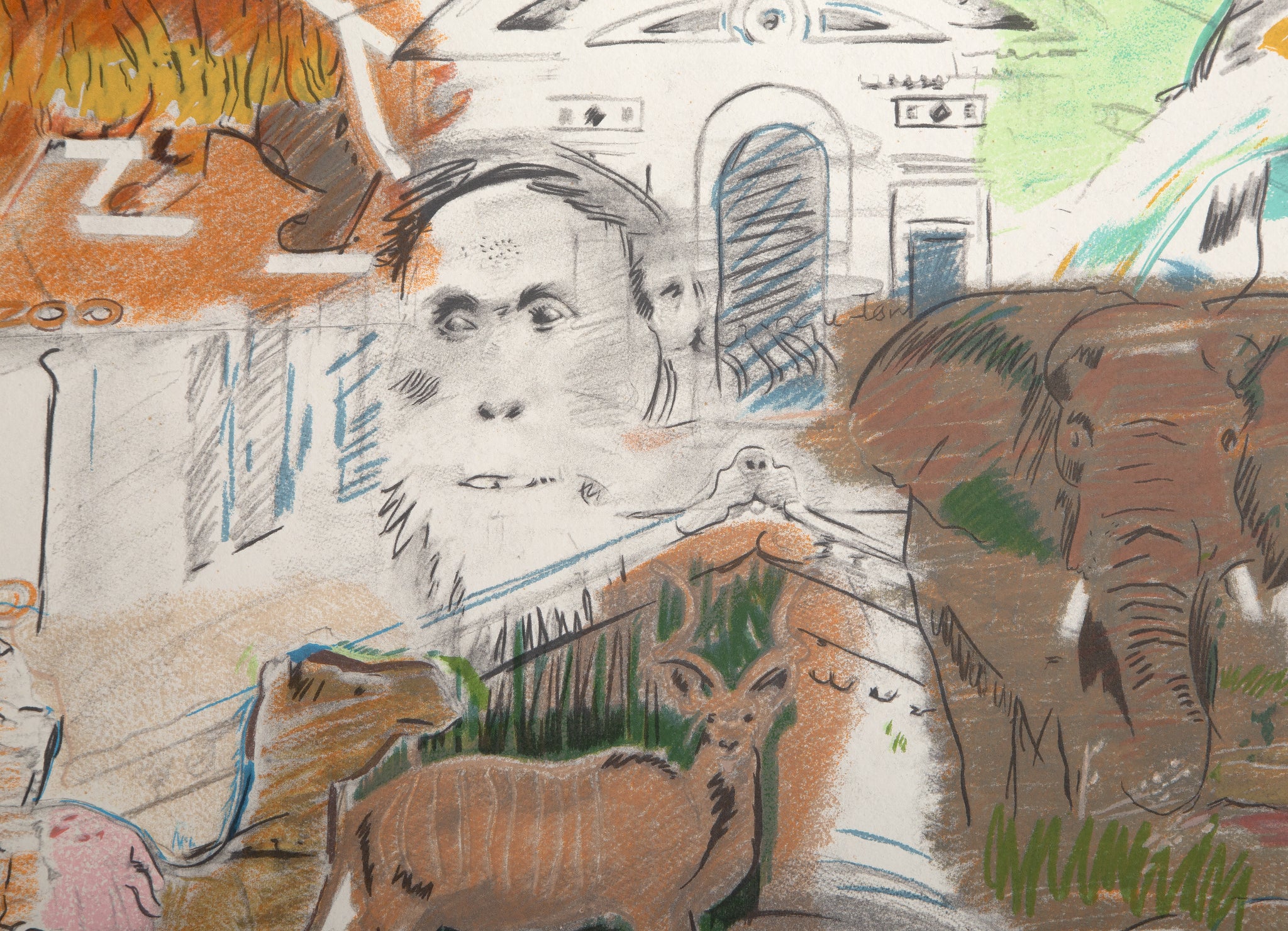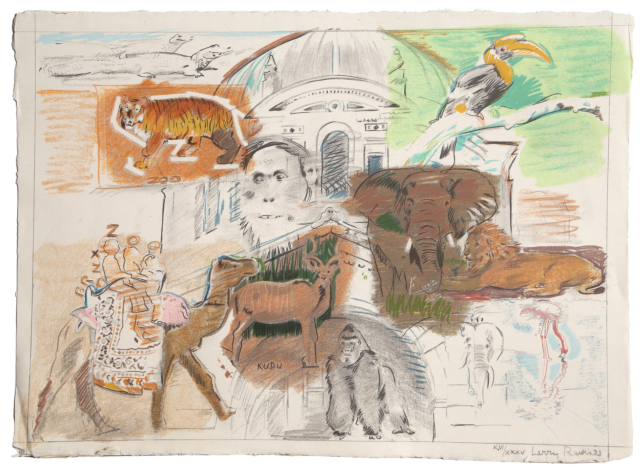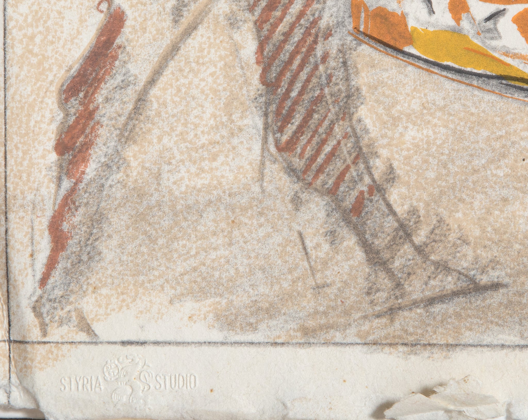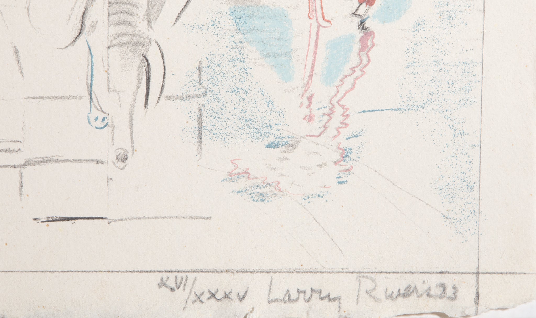 This print by Larry Rivers is part of an 8-piece portfolio published by The New York Graphic Society in 1983 and includes works from Red Grooms, Robert Indiana, Alex Katz, R.B. Kitaj, Robert Motherwell, Robert Rauschenberg, Larry Rivers, and James Rosenquist. The portfolio consists of two lithographs, five screenprints, and one mixed media print all on various wove papers, each signed and editioned in pencil along lower edge. This is from the edition of XVI/XXXV.