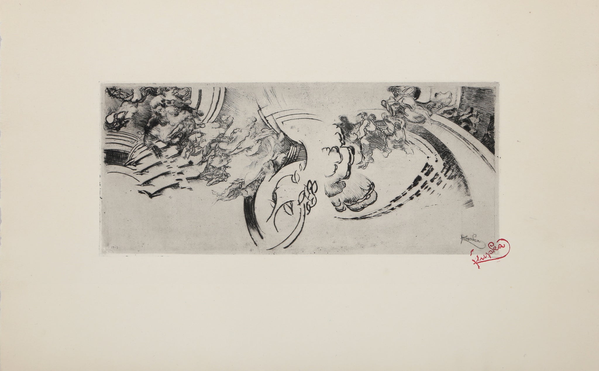 This abstract composition by Czech artist Frantisek Kupka features a chaotic scene that just barely passes beyond discernibility. Created in 1913, this etching is stamp signed and signed in the plate. It comes from the collection of the late Larry Saphire.