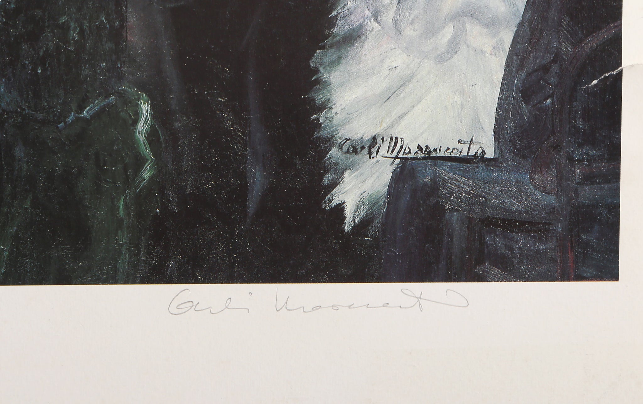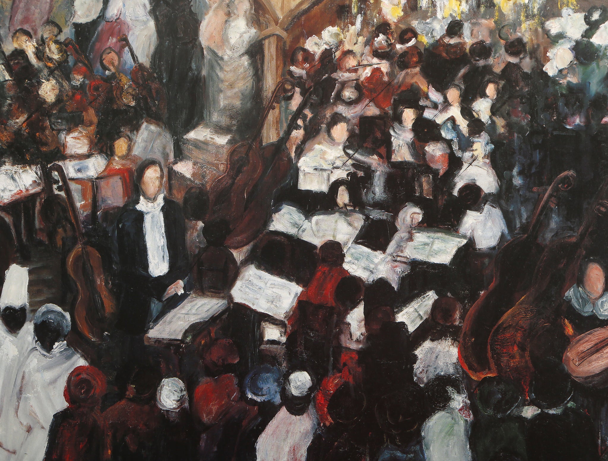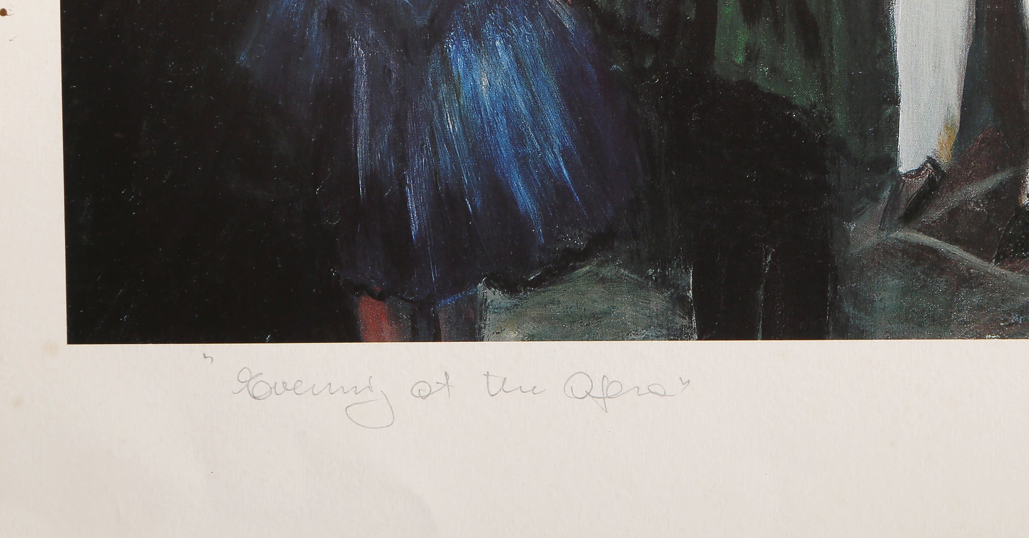 Evening at the Opera captures the elegant atmosphere of a grand ballroom performance with impressionistic flair. This hand-signed figurative print depicts a crowded interior scene filled with musical instruments and opera-goers, rendered in the soft, atmospheric style characteristic of impressionism. The artwork beautifully conveys the social energy and cultural sophistication of an evening at the opera, with careful attention to the interplay of figures and the ambient lighting of the performance space.