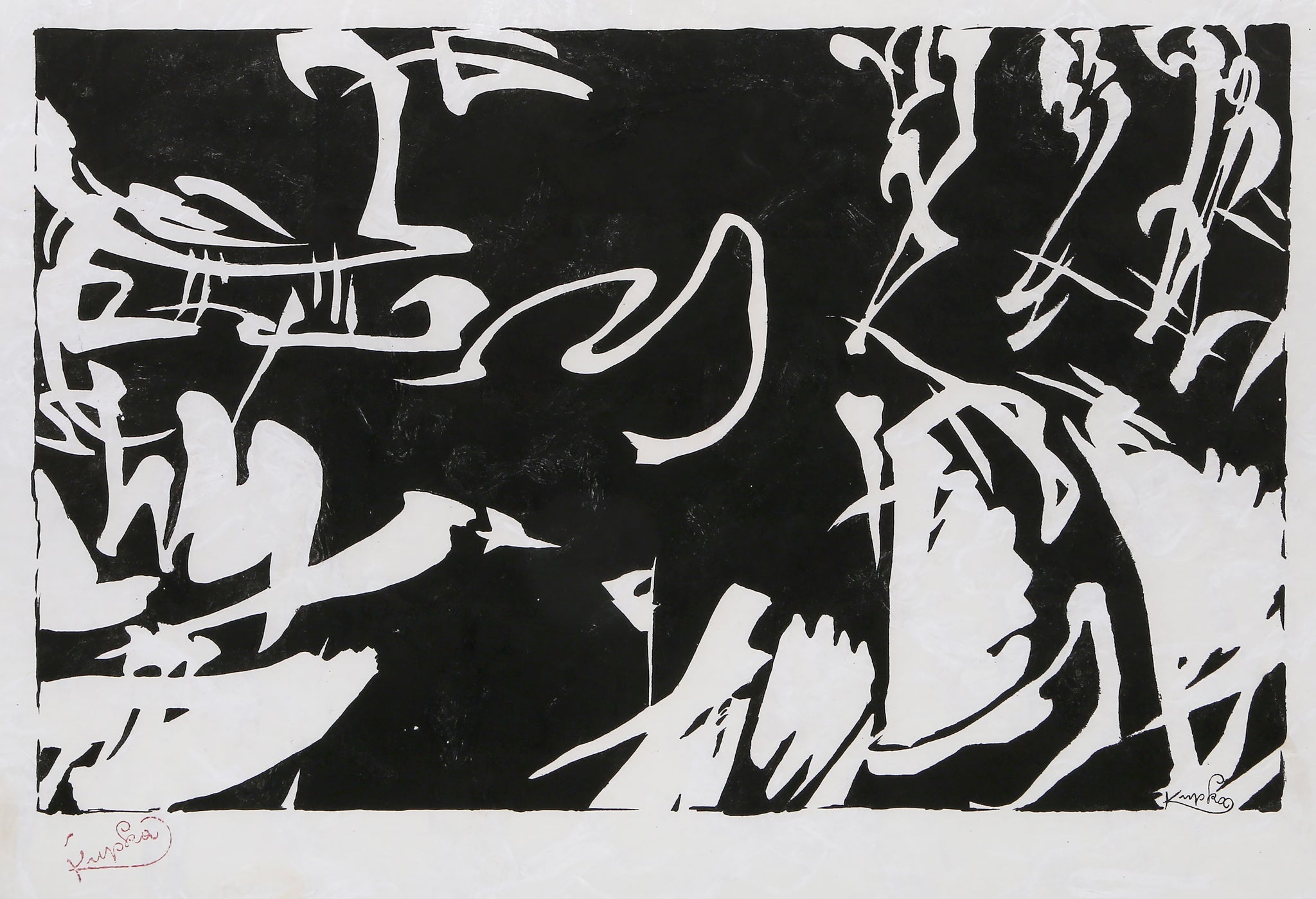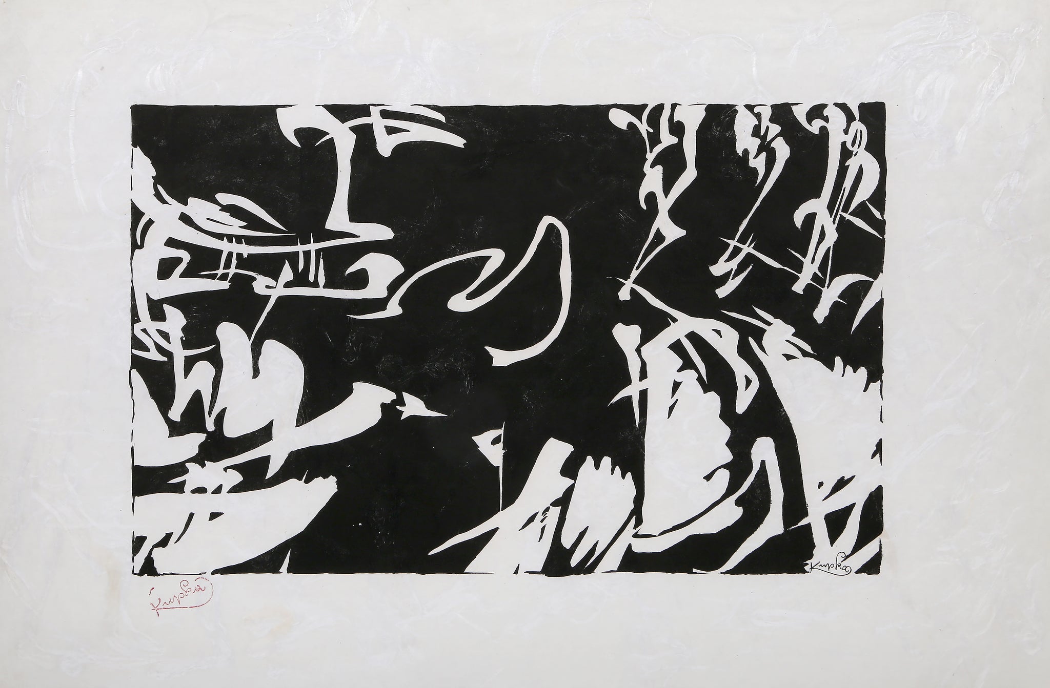 Frantisek Kupka, Czech (1871 - 1957) - Bile rytmy na Cernem II. Year: 1912, Medium: Woodcut on handmade rice paper, signed in the plate and stamp signed, Image Size: 10 x 16 inches, Size: 15 x 22.75 in. (38.1 x 57.79 cm), Description: From the collection of the late Larry Saphire