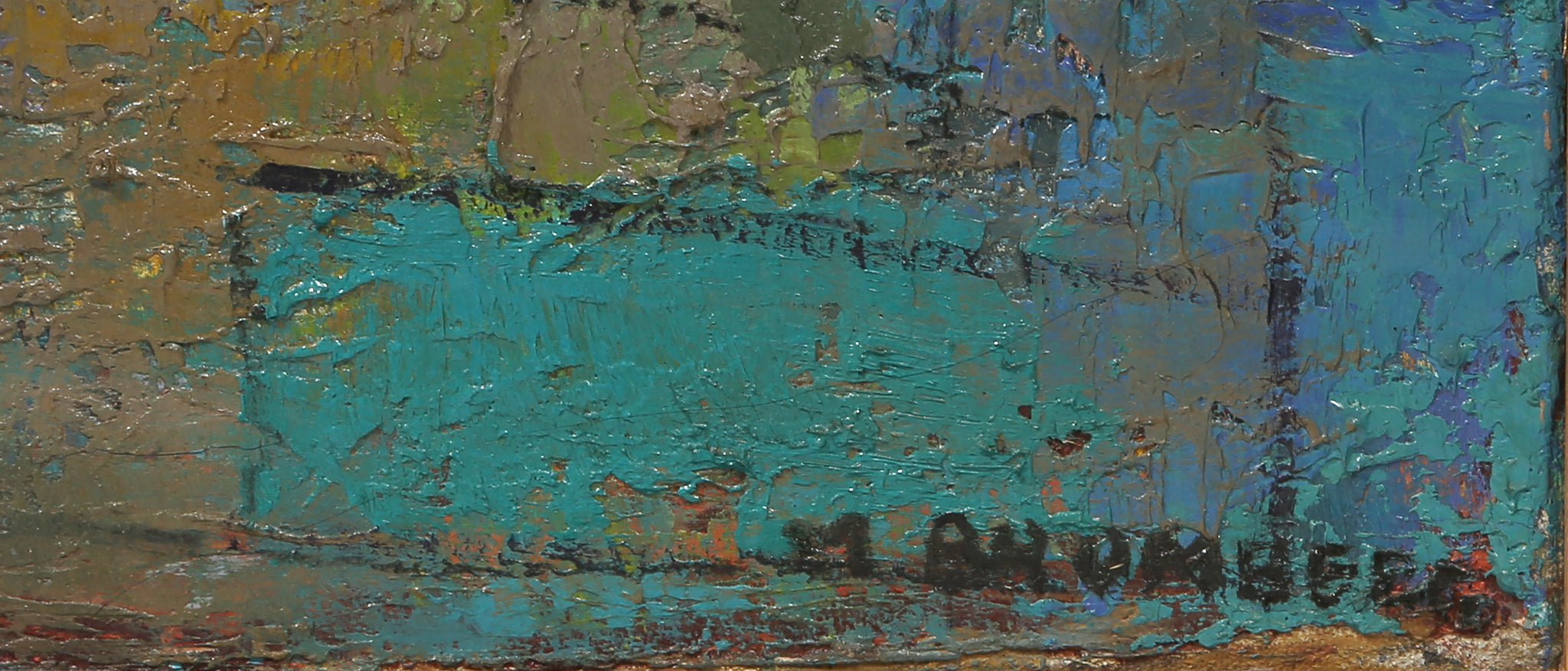 Set against a background of blurred greens, teals, and blues, Miriam Bromberg's minimalist renderings of linear shapes generate a deep contrast and complexity in the work.