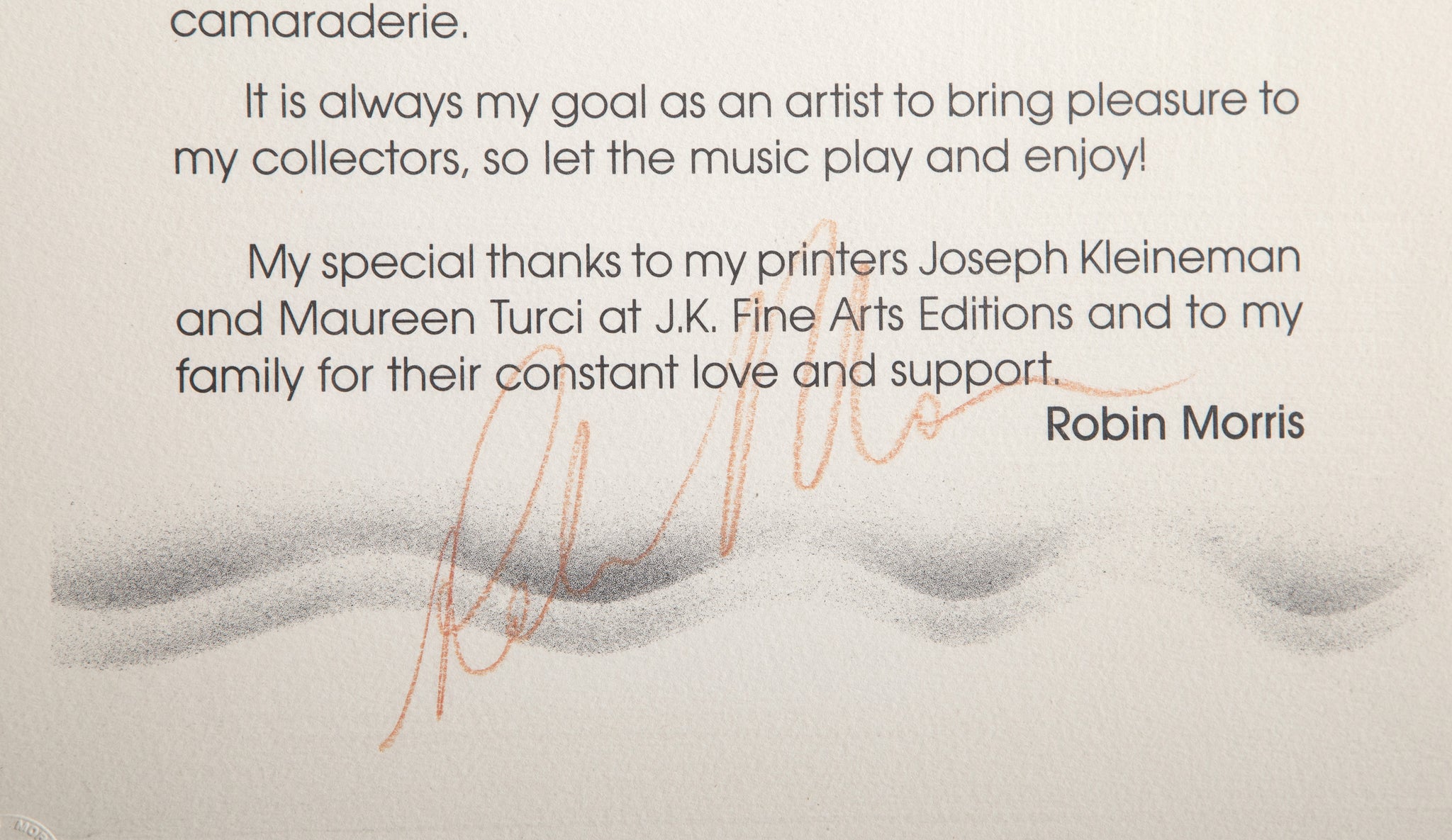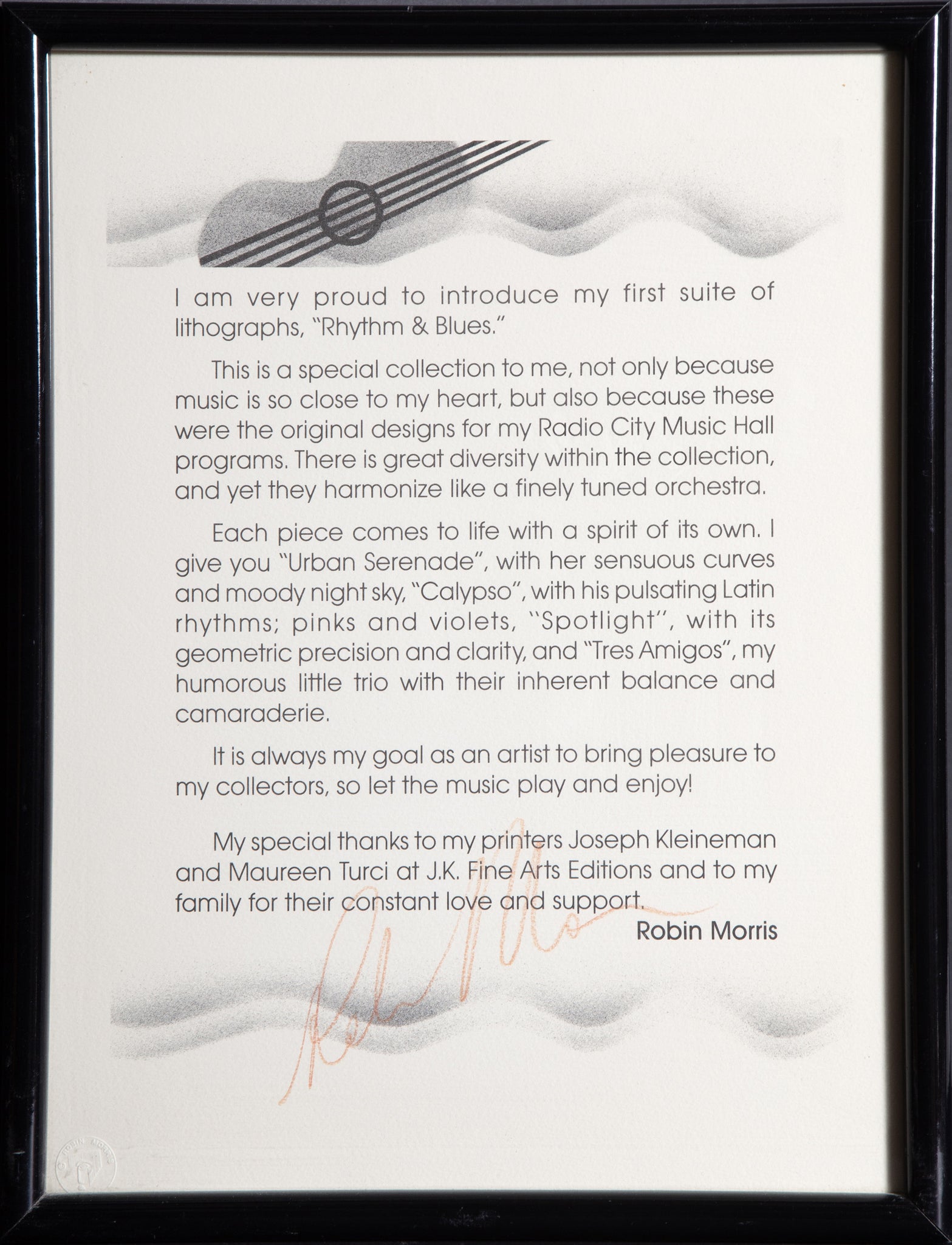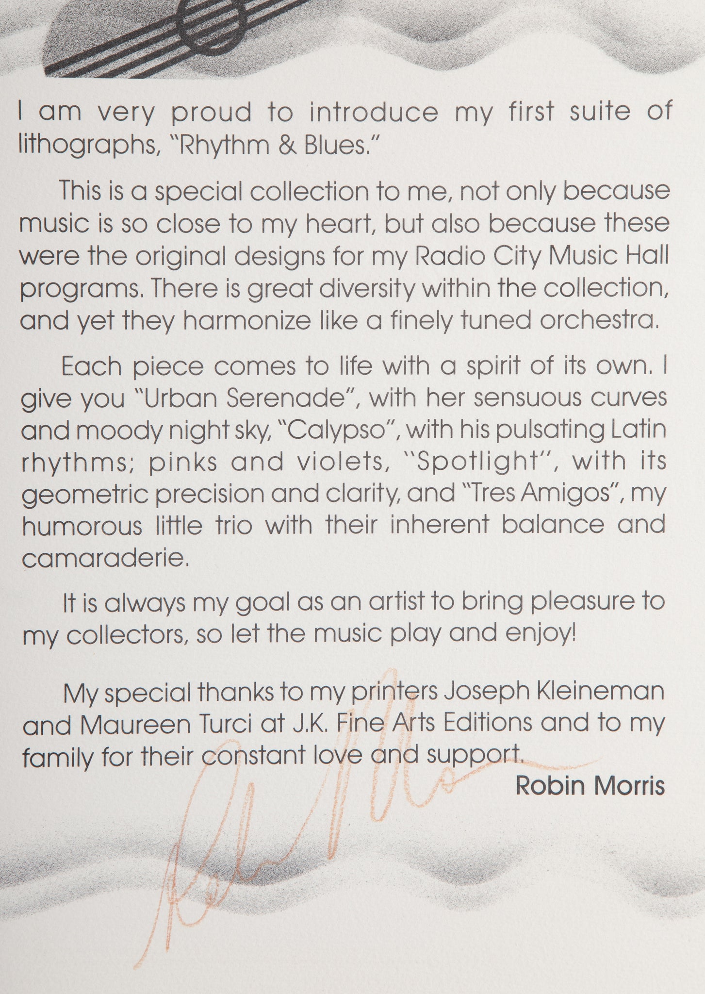 Robin Morris, American (1953 - ) - Rhythm & Blues Portfolio Introduction Page. Year: 1988, Medium: Lithograph, signed in color pencil, Size: 16.5 x 12.5 in. (41.91 x 31.75 cm), Frame Size: 18 x 14 inches