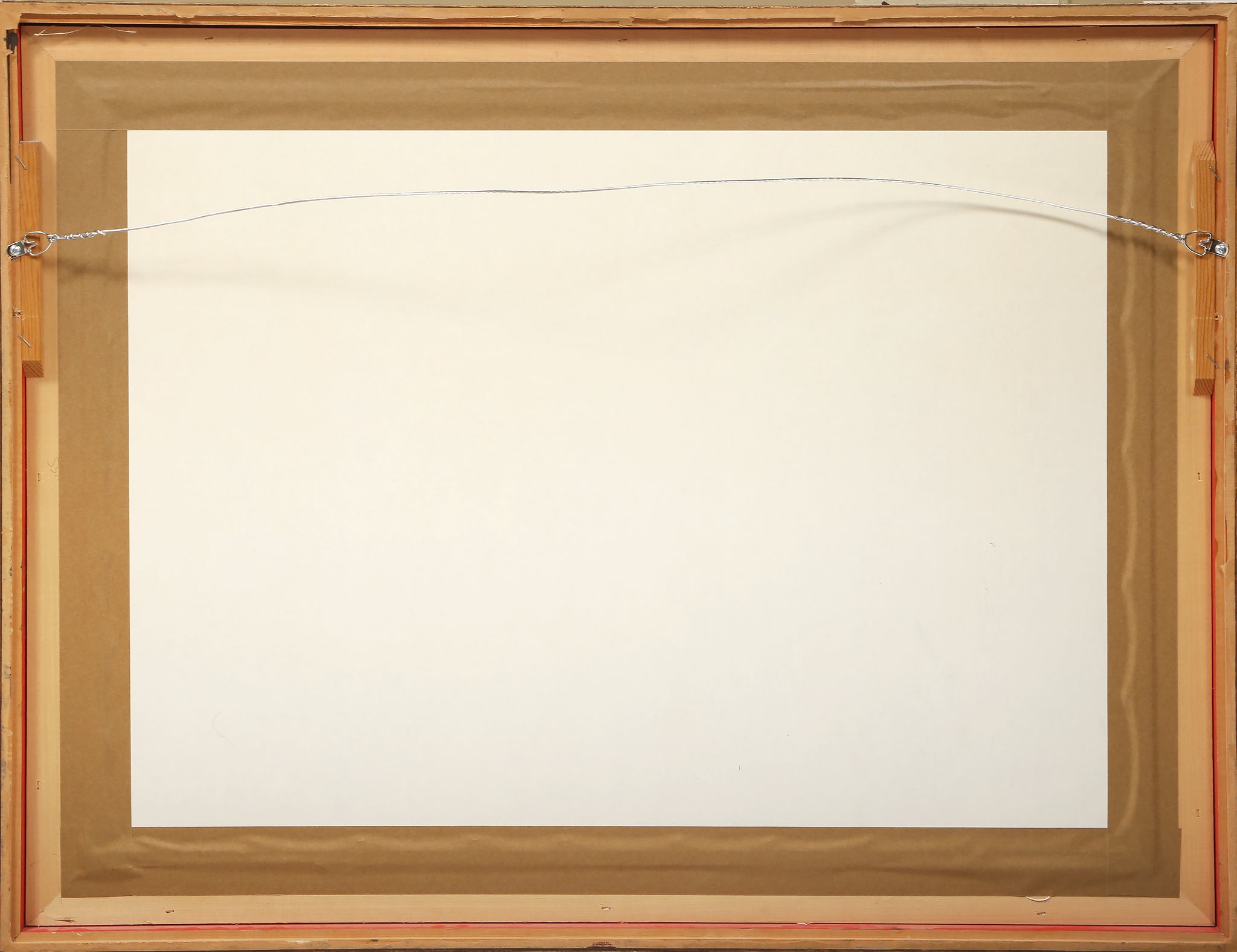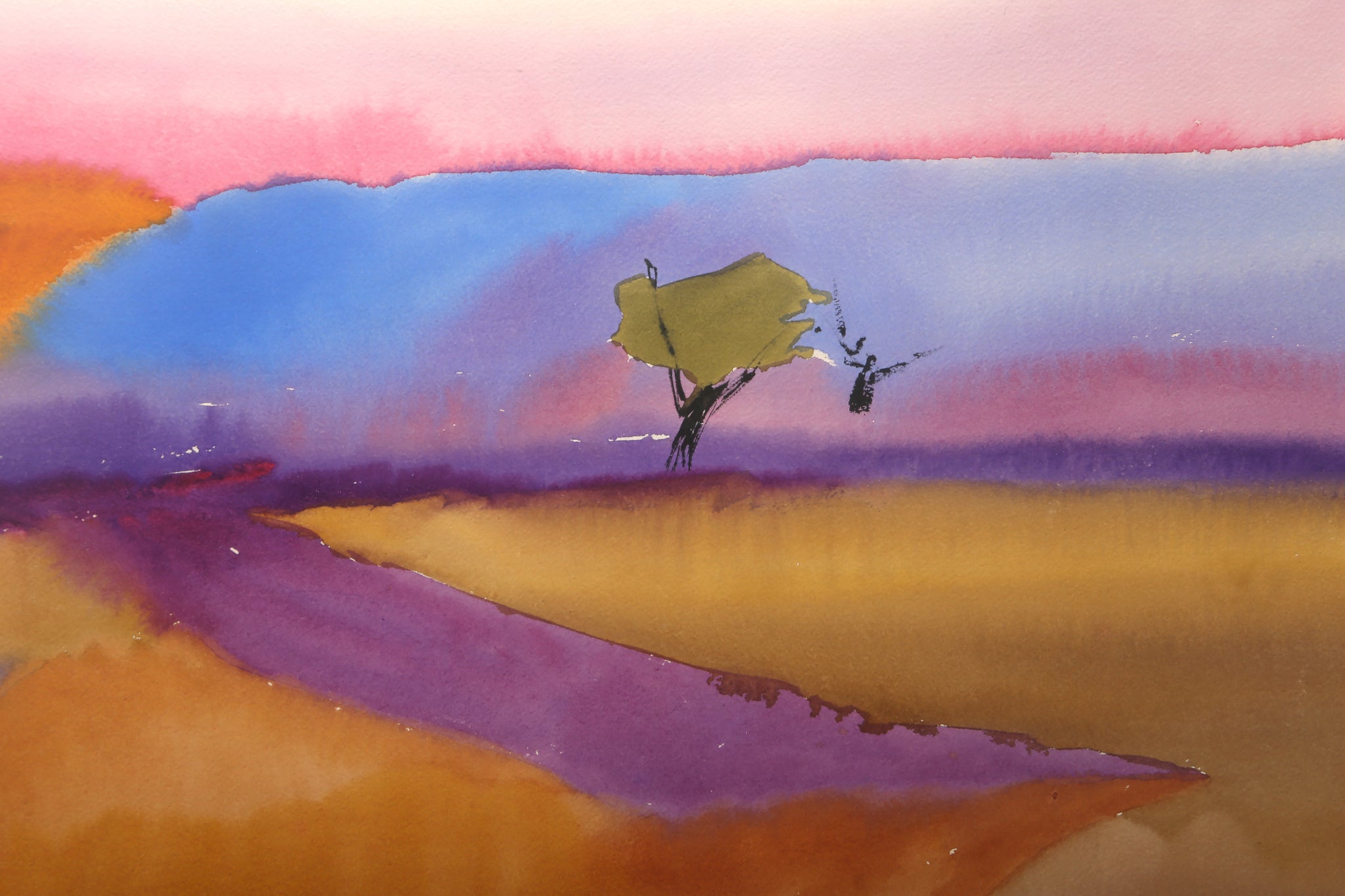 French Impressionist artist Emil Rampelberg is not afraid of using vibrant color in his paintings. This countryside scene of rolling hills and verdant fields might have been depicted by a different artist with the same colors occurring in nature - greens and blues. Rampelberg instead insists on alien hues of purple, yellow, and pink, with only a single tree in green to tie in the composition as a landscape rather than an abstract. This mesmerizing watercolor painting is signed in the lower left and nicely framed in gold. Provenance: Galerie Felix Vercel, New York.
