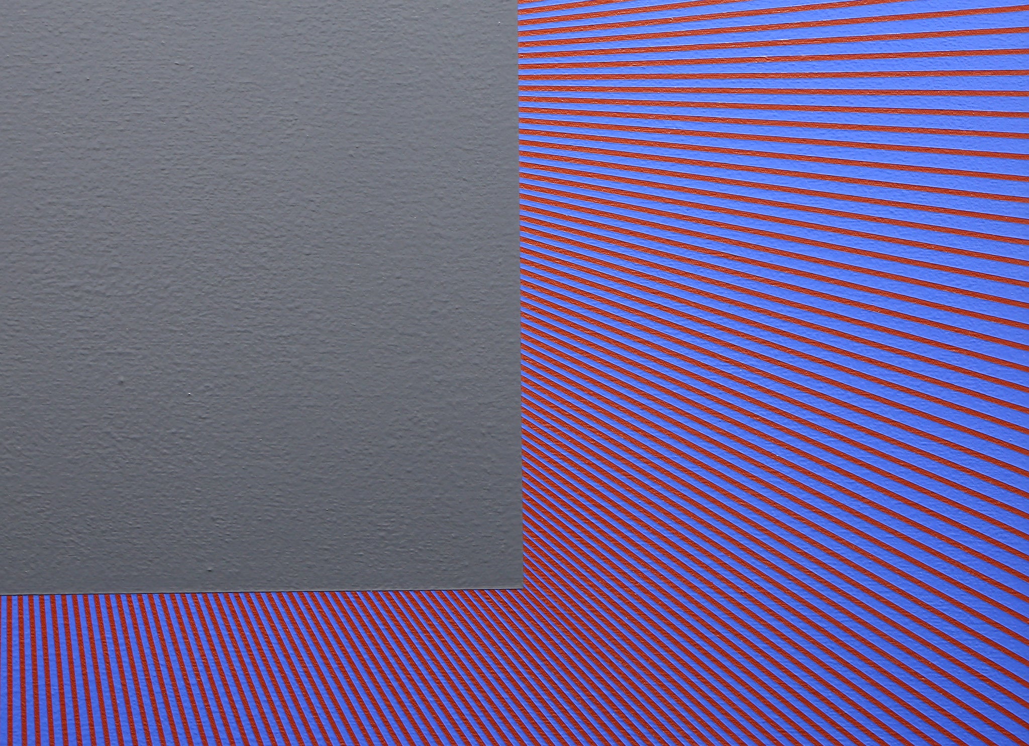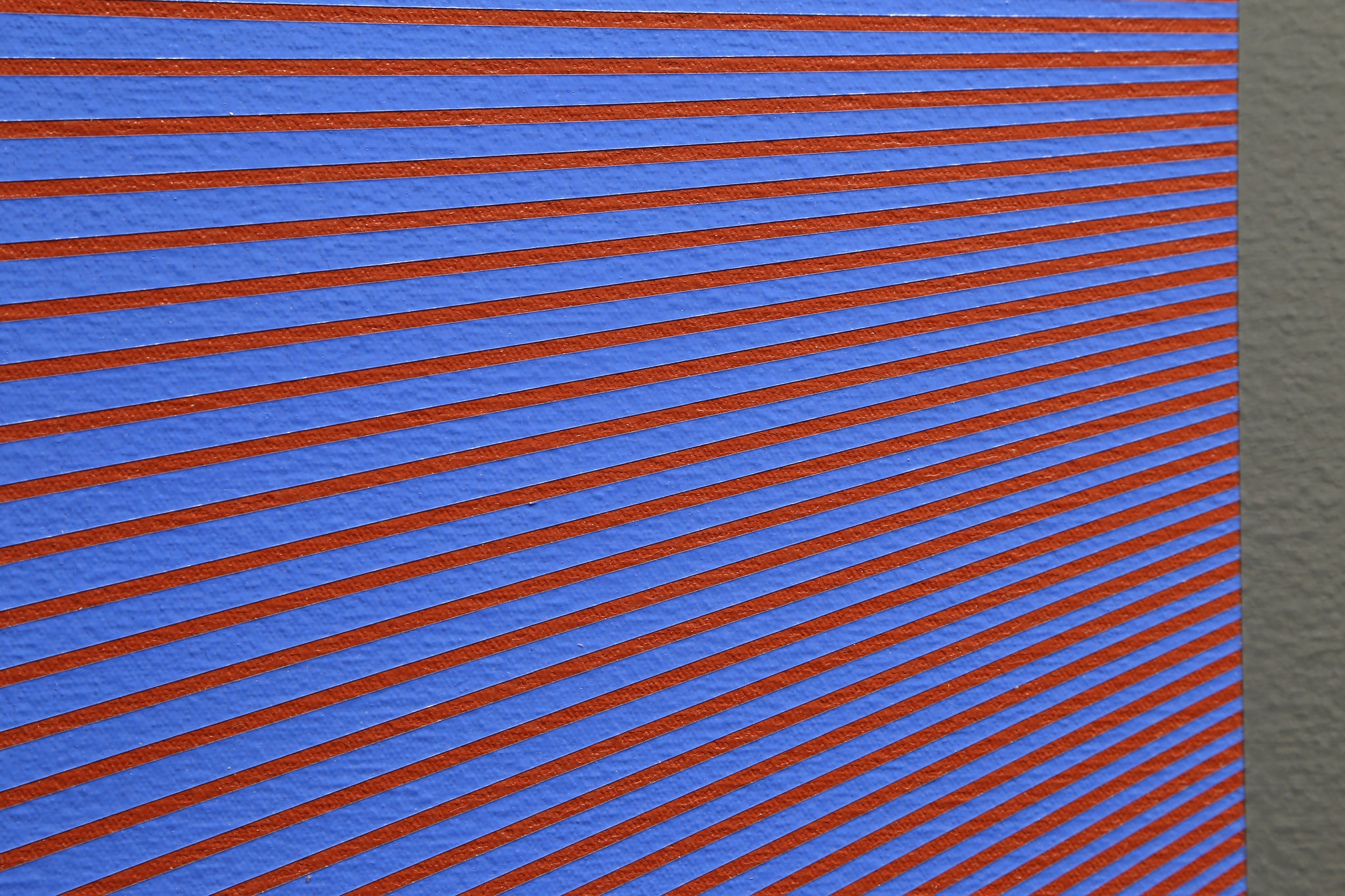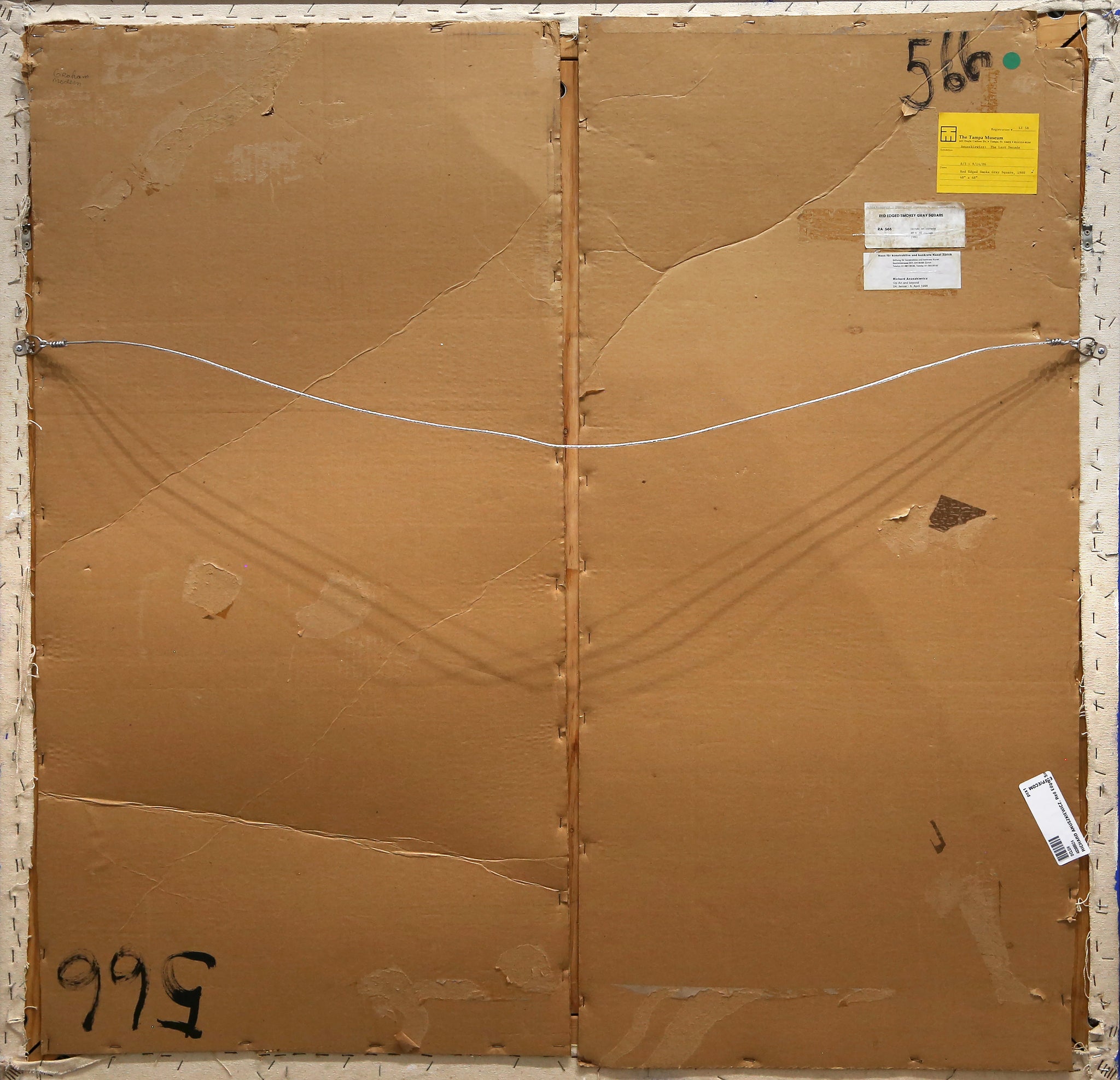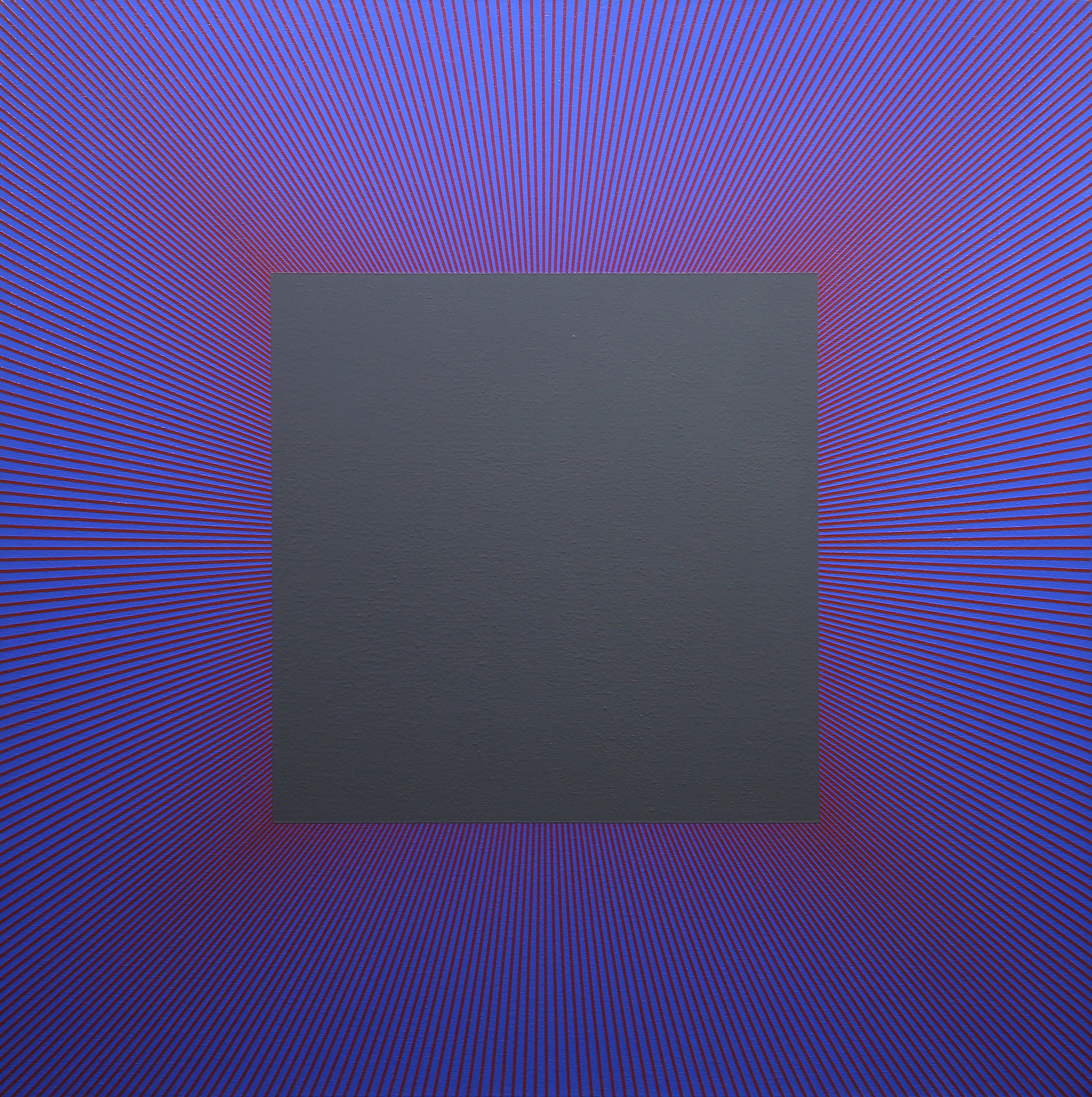 This magnificent Op Art painting by Richard Anuszkiewicz showcases the artist's signature style. Tight, precise lines of red paint spread out in all directions over a royal purple background, centering on a gray square. These closely-placed lines create a visual illusion that characterizes the Optical Art movement, tricking the eye into seeing movement on the canvas where there is none.