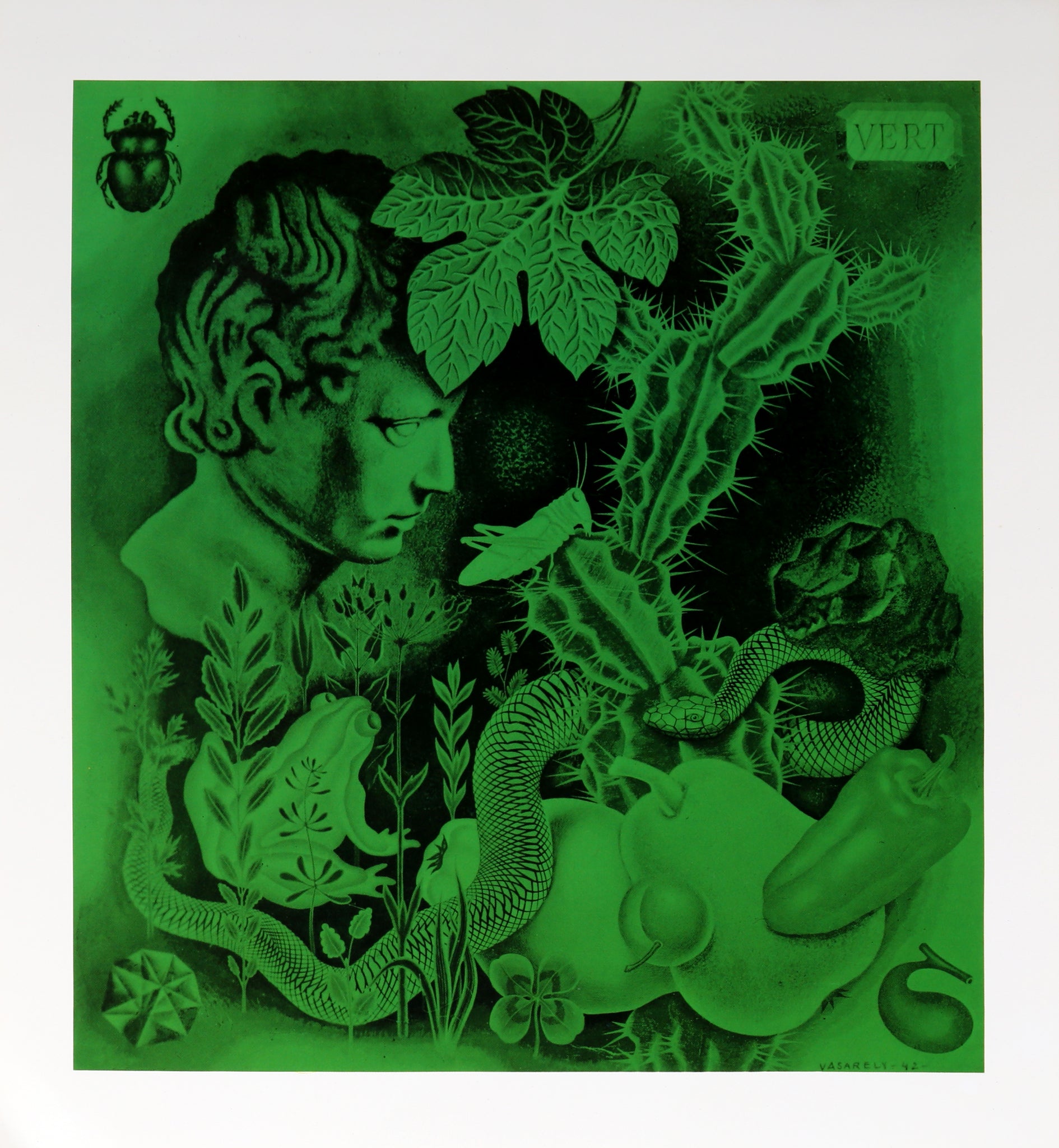 Victor Vasarely, Hungarian (1908 - 1997) - Etude en Vert. Portfolio: Graphismes 2, Year: 1977, Medium: Offset Lithograph, Size: 11.5 x 10.75 in. (29.21 x 27.31 cm), Frame Size: 14 x 14 inches, Publisher: Editions Du Griffon Neuchatel, Description: Portfolio of 8 Offset Lithographs on paper created originally by Hungarian artist Victor Vasarely, printed by Editions Du Griffon Neuchatel.