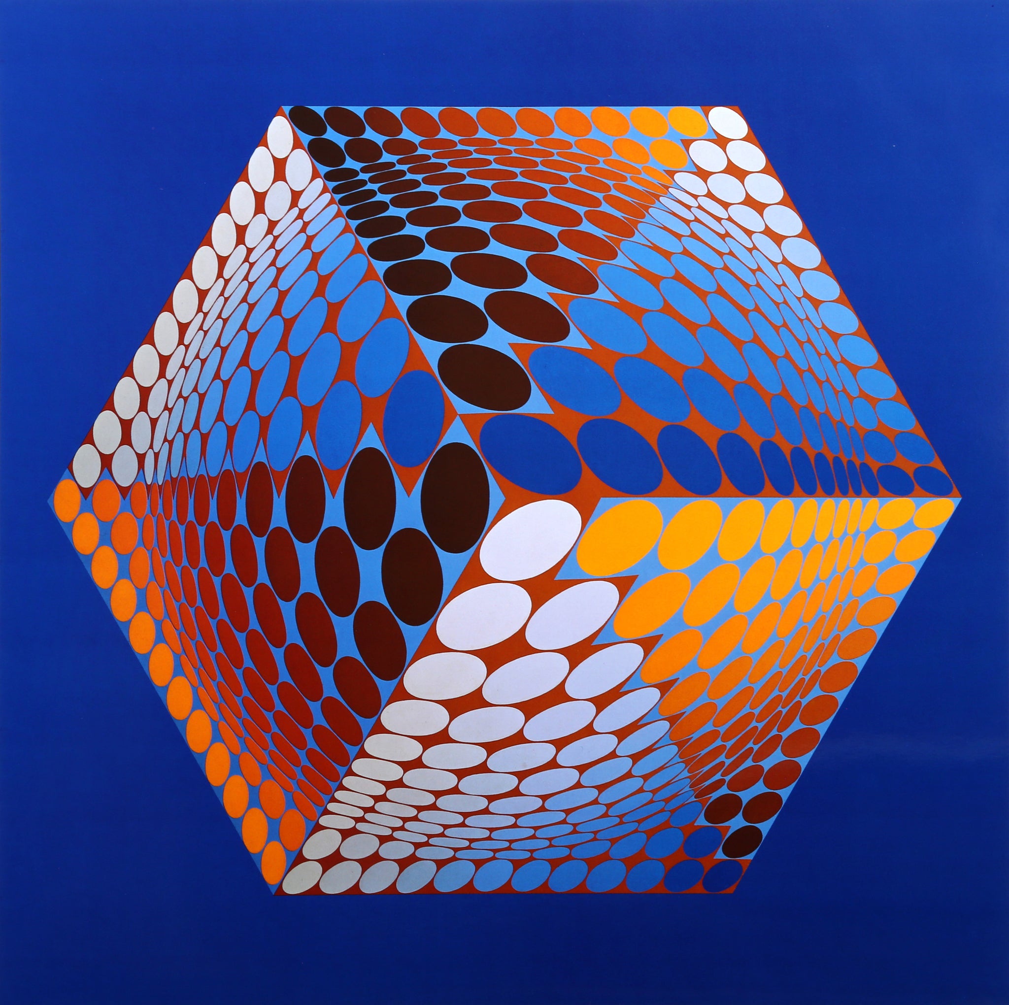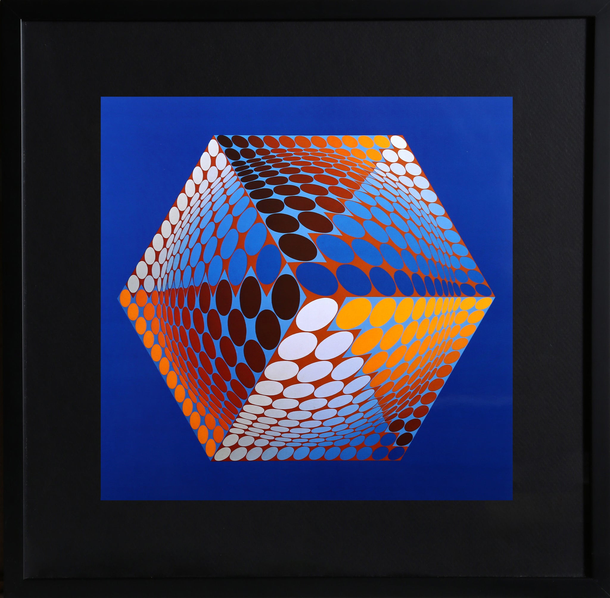 Victor Vasarely, Hungarian (1908 - 1997) - Tupa 3. Portfolio: Progressions 3, Year: 1974, Medium: Offset Lithograph, Size: 16 x 16 in. (40.64 x 40.64 cm), Frame Size: 21.5 x 21.5 inches, Publisher: Editions Du Griffon Neuchatel, Description: From a portfolio of 8 Offset Lithographs on paper created originally by Hungarian artist Victor Vasarely, printed by Editions Du Griffon Neuchatel. Another version of this is also included in the portfolio Structures Universelles de L'Hexagone. Nicely framed and matted in black.