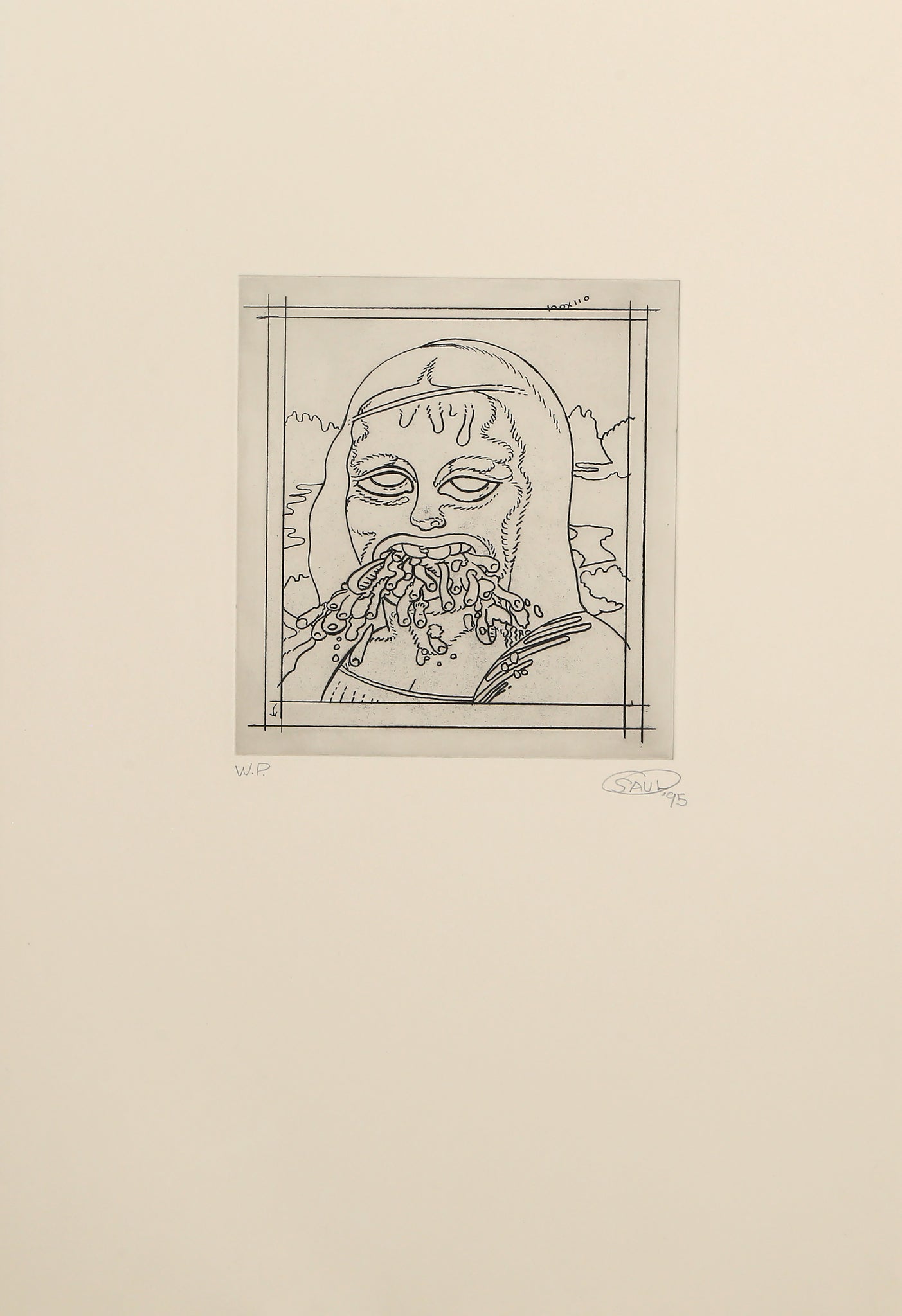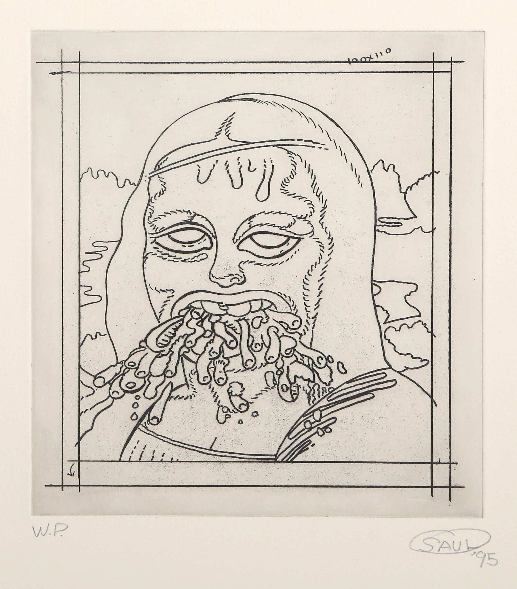 Peter Saul, American (1934 - ) - Mona Lisa. Year: 1995, Medium: Etching on cream wove paper, signed, numbered and dated in pencil, Edition: WP, Image Size: 7 x 6.5 inches, Size: 22 x 15 in. (55.88 x 38.1 cm), Printer: Vinalhaven Workshop and Press, Vinalhaven, Maine, Publisher: Vinalhaven Workshop and Press, Vinalhaven, Maine