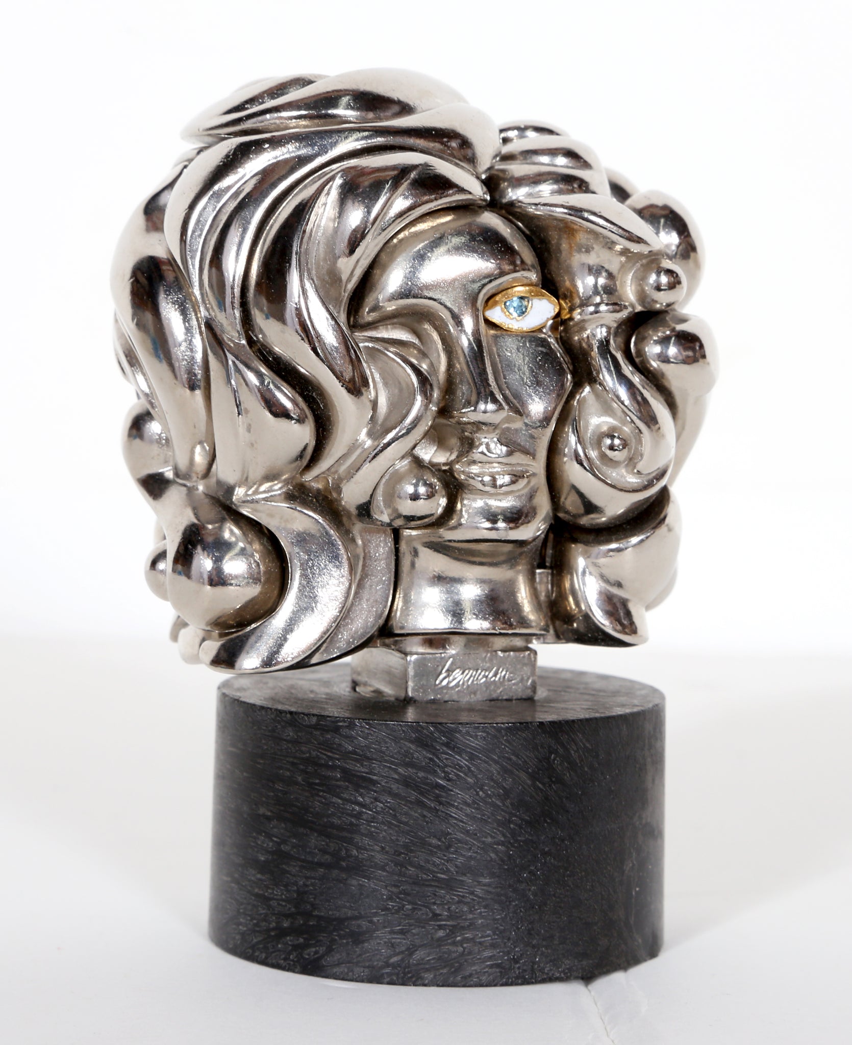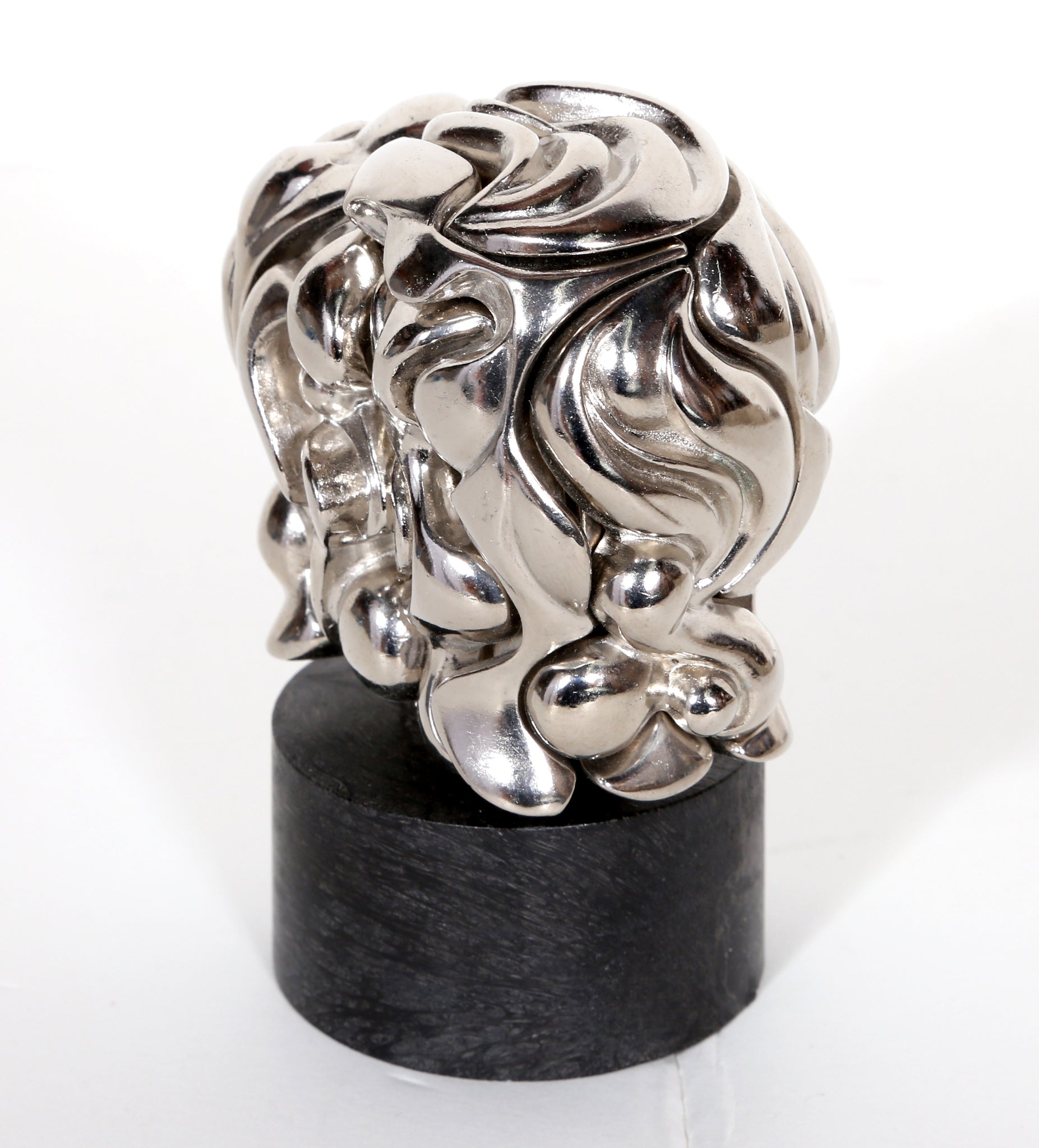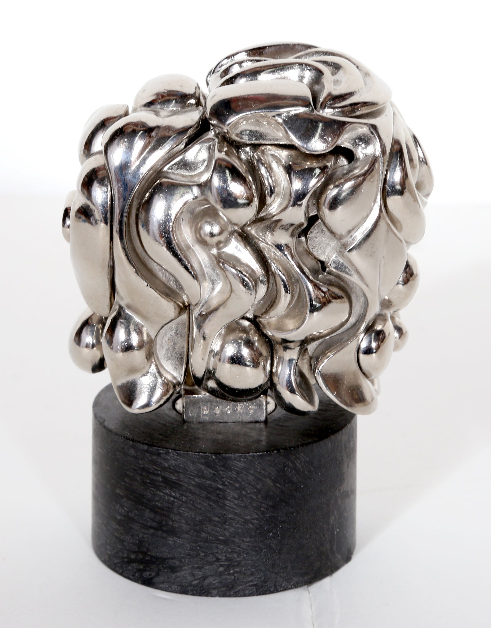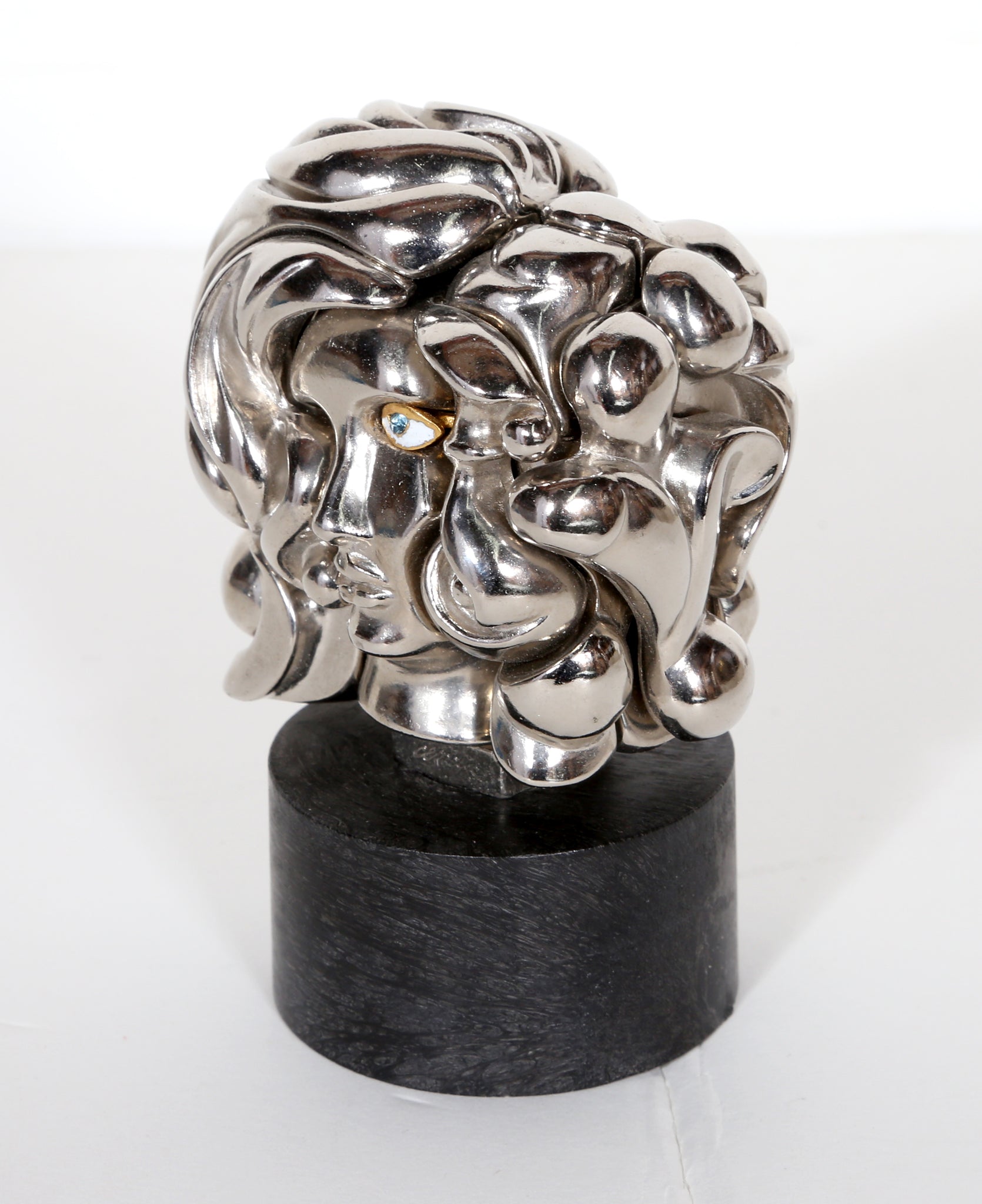 Surrealist Spanish artist Miguel Berrocal is best known for his puzzle sculptures, charming assemblages of detailed metalwork that lock together in precise configurations to create a solid-looking sculpture. These pieces are meant to be touched and toyed with, to be disassembled and rejoined. The art, beautiful on its own, develops a stronger relationship with its owner when taken apart and put together again. The deeper understanding of the interior of the piece makes it incredibly personal. This work is made of 18 nickel-plated elements and comes from an edition of 9500.