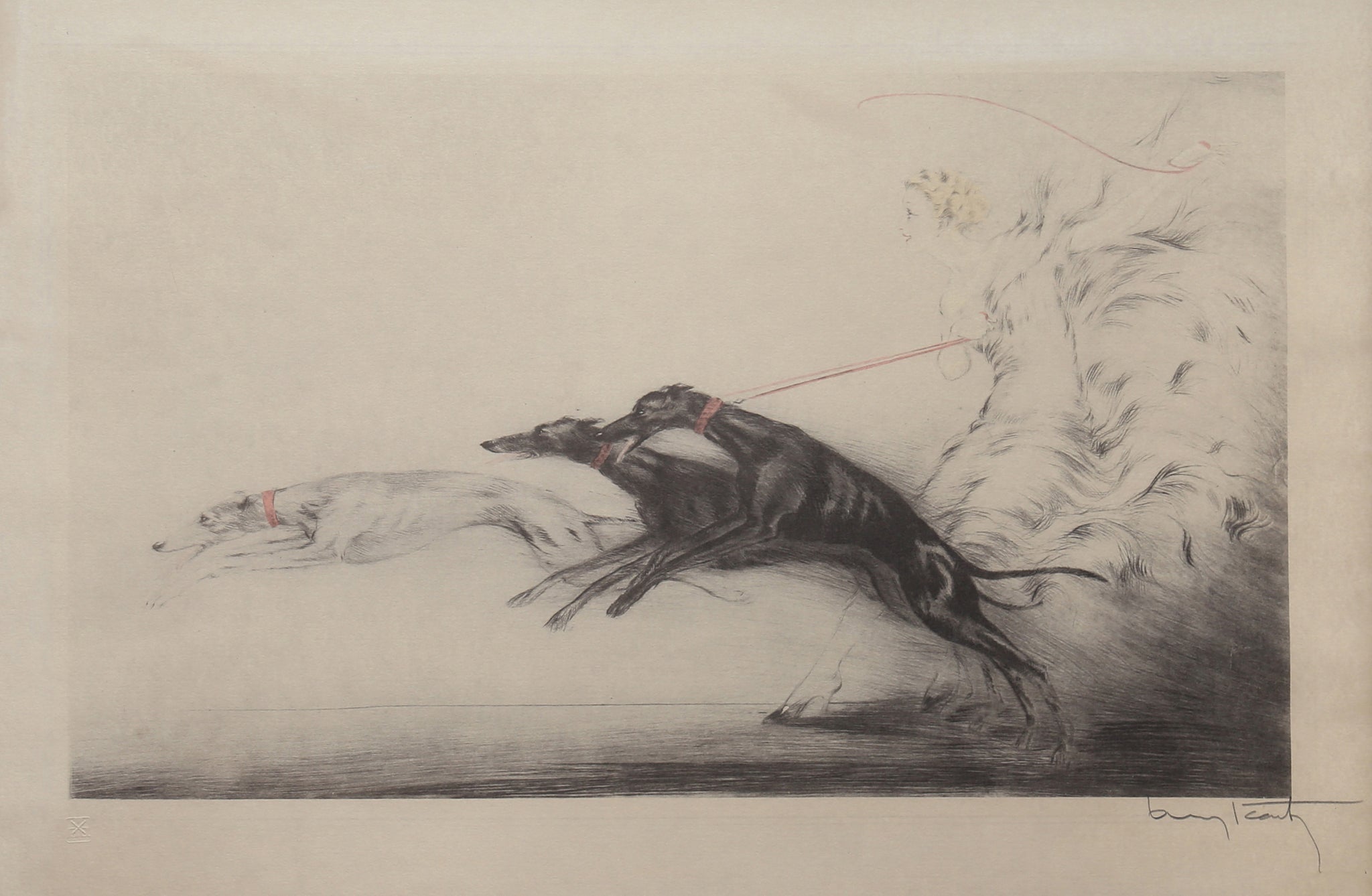 A ghostly lithograph by Art Nouveau artist Louis Icart. The artist has captured the moment of three greyhounds, all leashed, as they begin to leap forward. Their owner, a woman in a flowing white dress, is a breath away from being pulled off her feet.