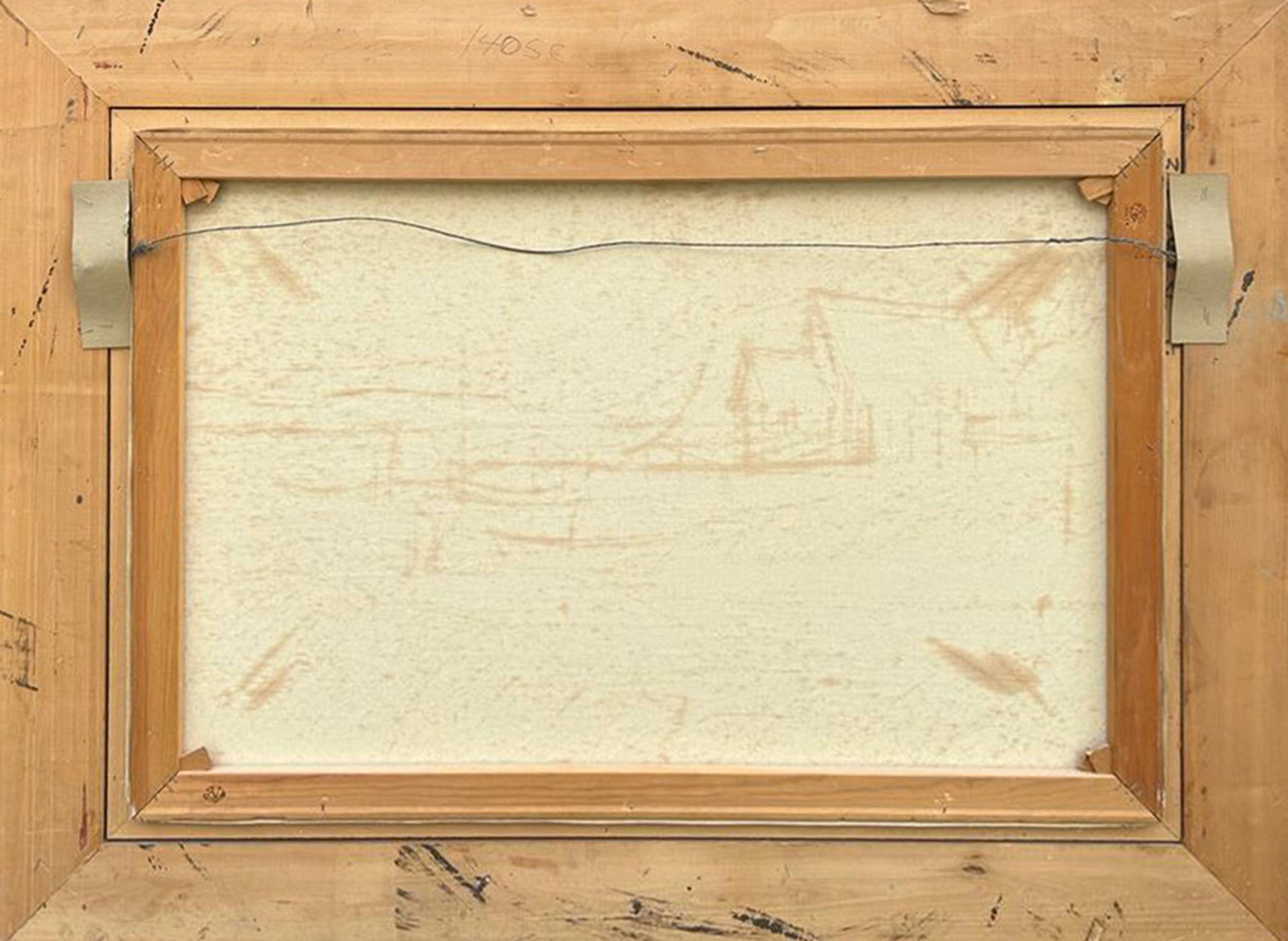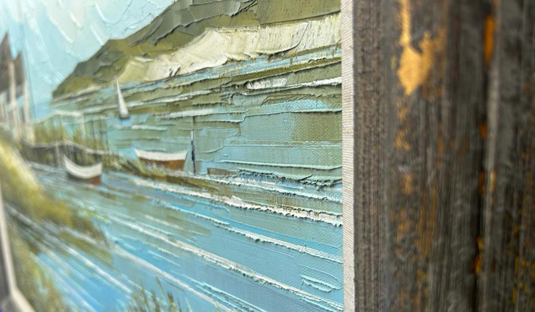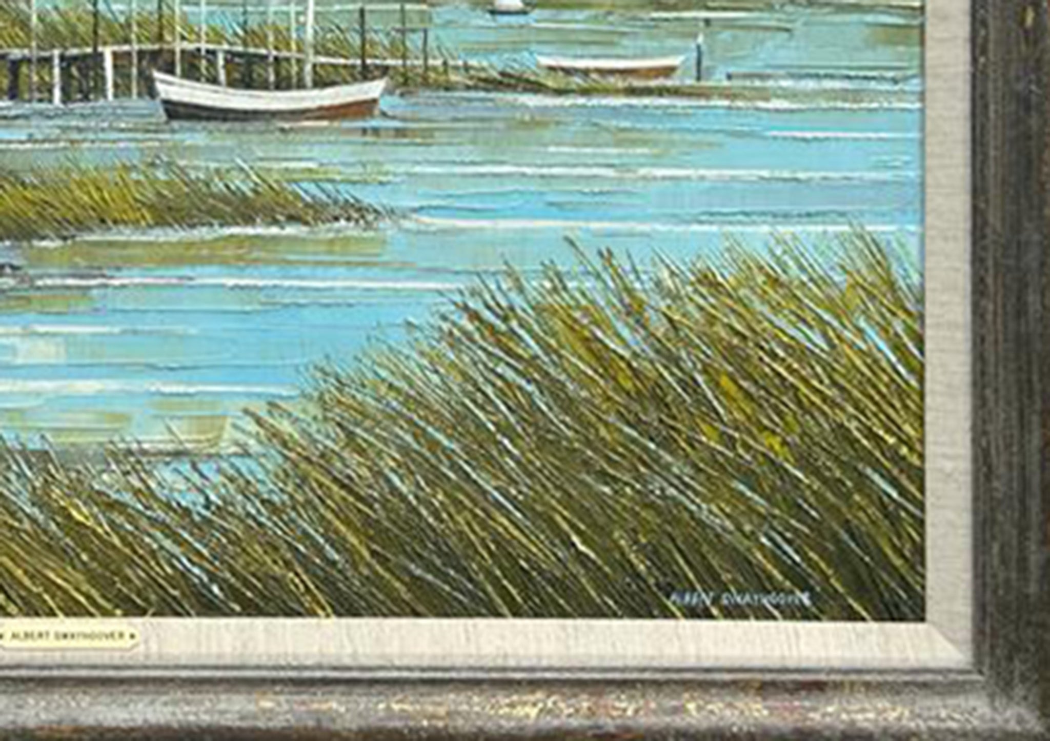 A breezy coastal scene of an ocean inlet flanked by tall green grasses. Up in the dunes is a white house serviced by a pier and a few sailboats can be seen bobbing in the water.
