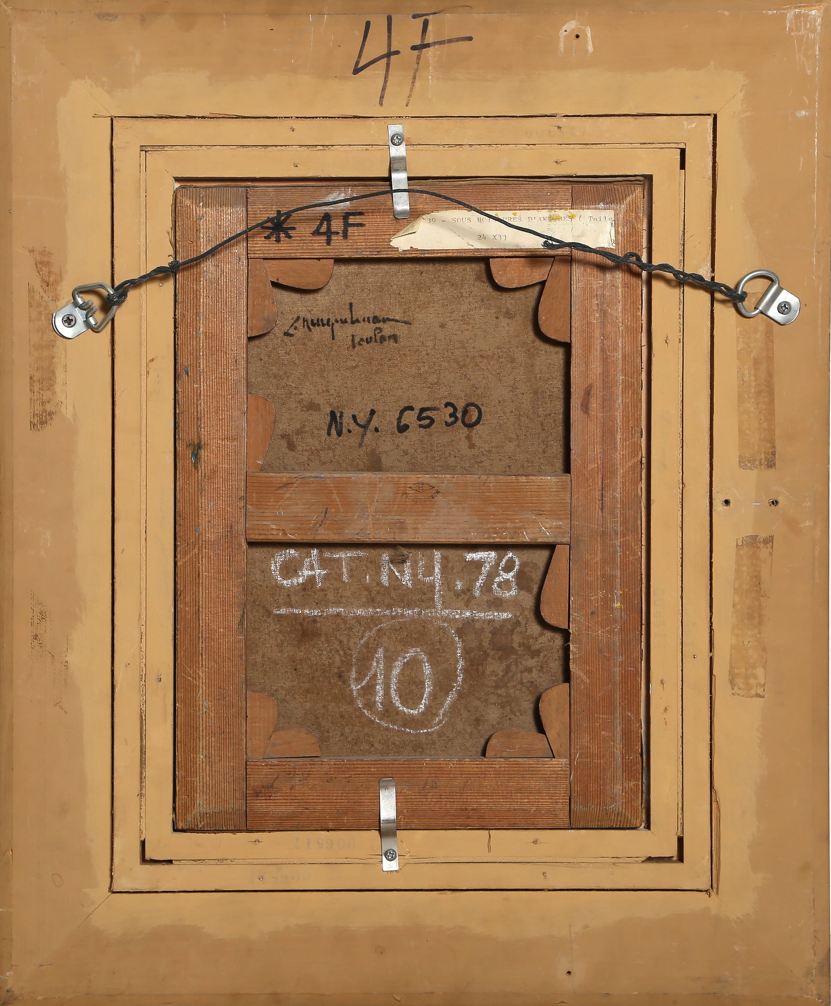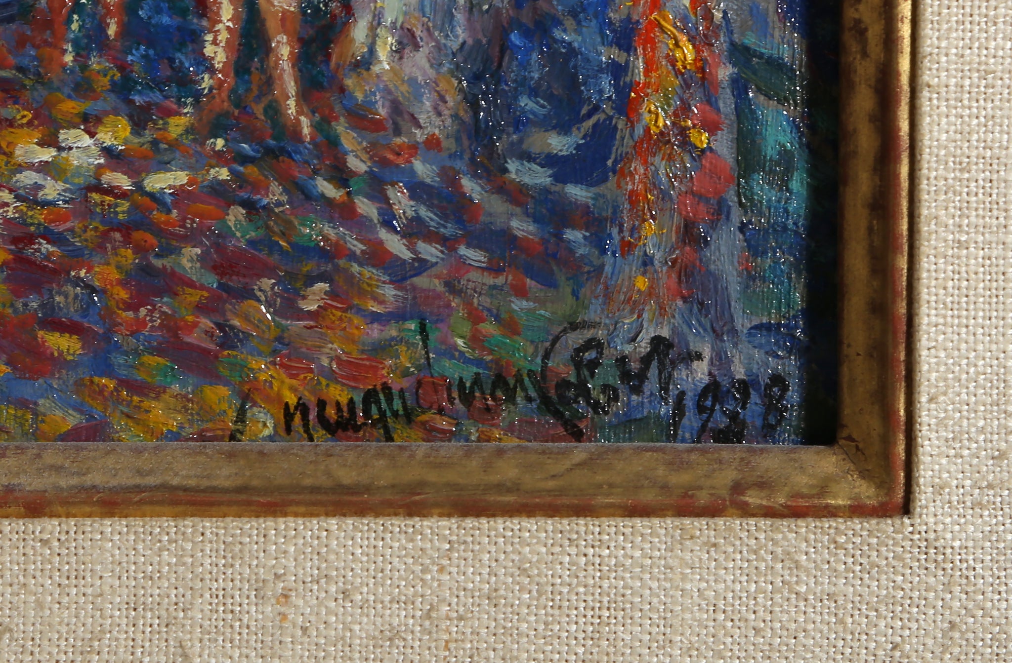 A vivid scene of a forest path leading down to a crystal-blue lake by French Pointillist artist Lucien Neuquelman. This oil painting employs the technique first developed by Georges Seurat in the late 1800s and later made more popular by Paul Signac. Several small dots of different colors are placed directly beside one another and, at a distance, are blurred together by the eye to give the illusion of blended color. This oil painting is signed in the lower right and nicely framed in a carved gold-leaf frame. Provenance: Galerie Felix Vercel, New York.
