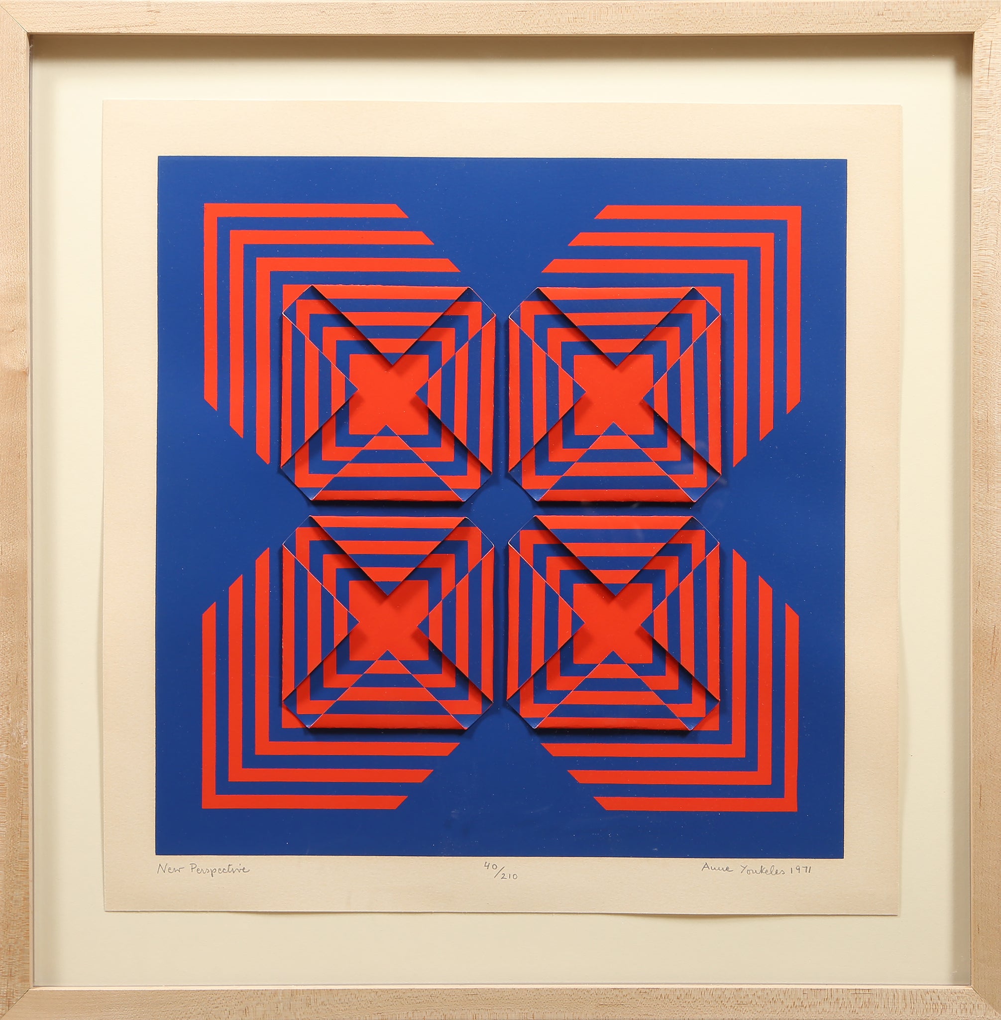 Anne Youkeles, Austrian (1920 - ) - New Perspective. Portfolio: . Year: 1971, Medium: 3D screenprint collage on Arches paper, signed, titled, dated and numbered in pencil, Edition: 40/210, Image Size: 13 x 13 inches, Size: 17 x 15 in. (43.18 x 38.1 cm),  Frame Size: 19 x 19 inches
