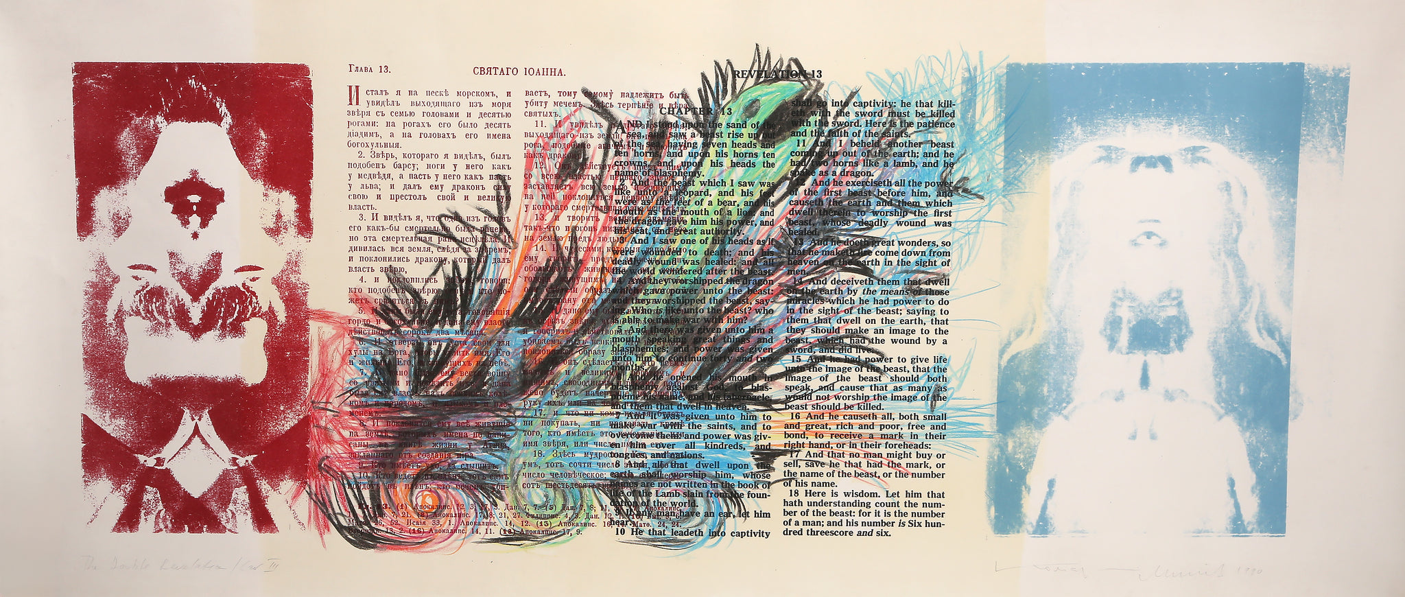 Explore the intersection of spirituality and contemporary life with this thought-provoking screenprint by Komar and Melamid featuring biblical text overlaid with automotive imagery and portrait faces. This conceptually rich work from The Double Revelation series exemplifies Conceptual Art and Religious Art movements, juxtaposing sacred scripture with modern symbols to create a powerful commentary on faith in the contemporary world. The layered composition featuring Jesus imagery, car elements, and textual references creates a complex visual dialogue that challenges viewers to consider the sacred within the secular. This museum-quality print represents the collaborative duo's signature approach to blending high and low culture, making it an essential piece for collectors of Conceptual Art, Religious Art, and contemporary portraiture.