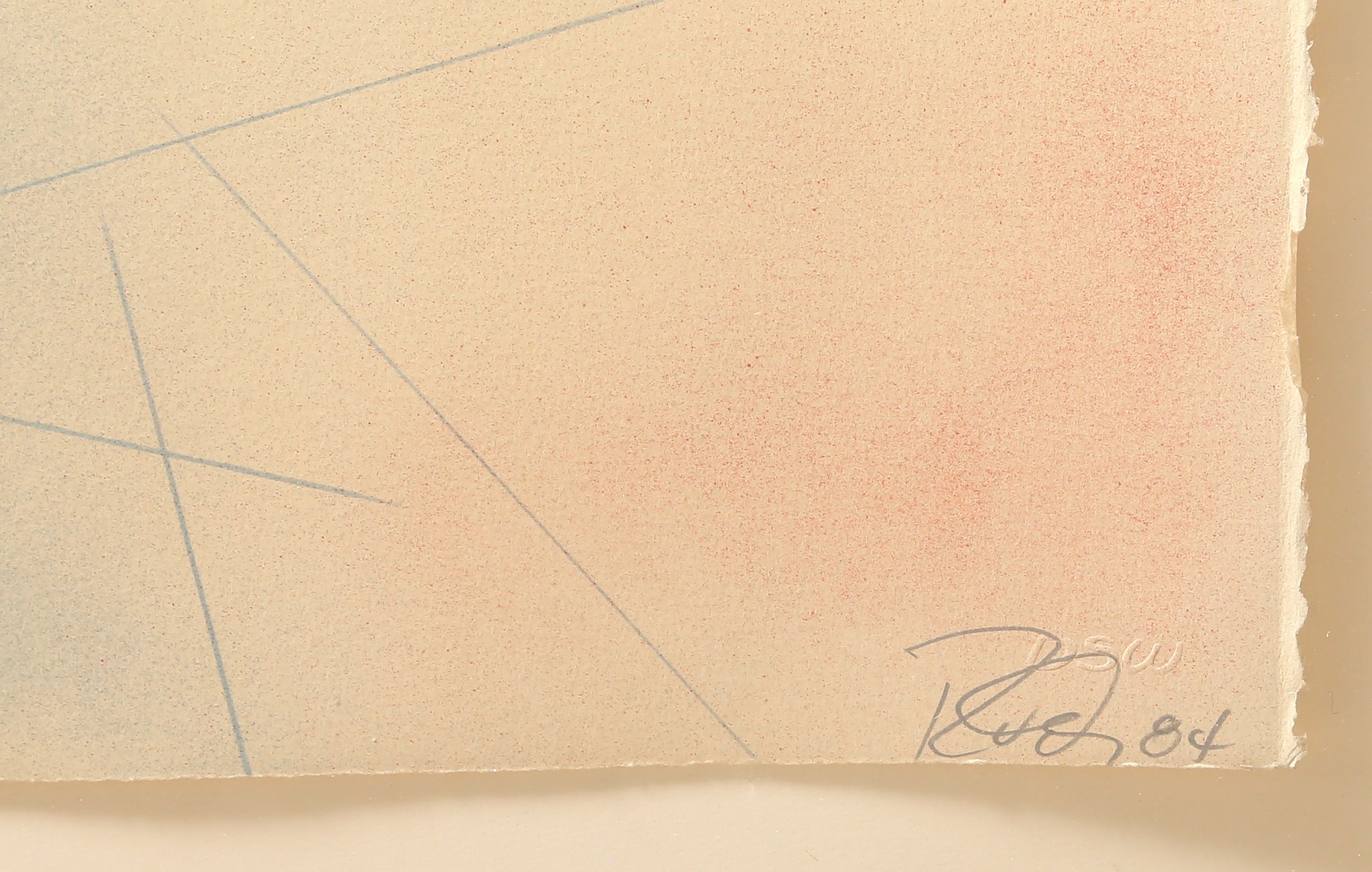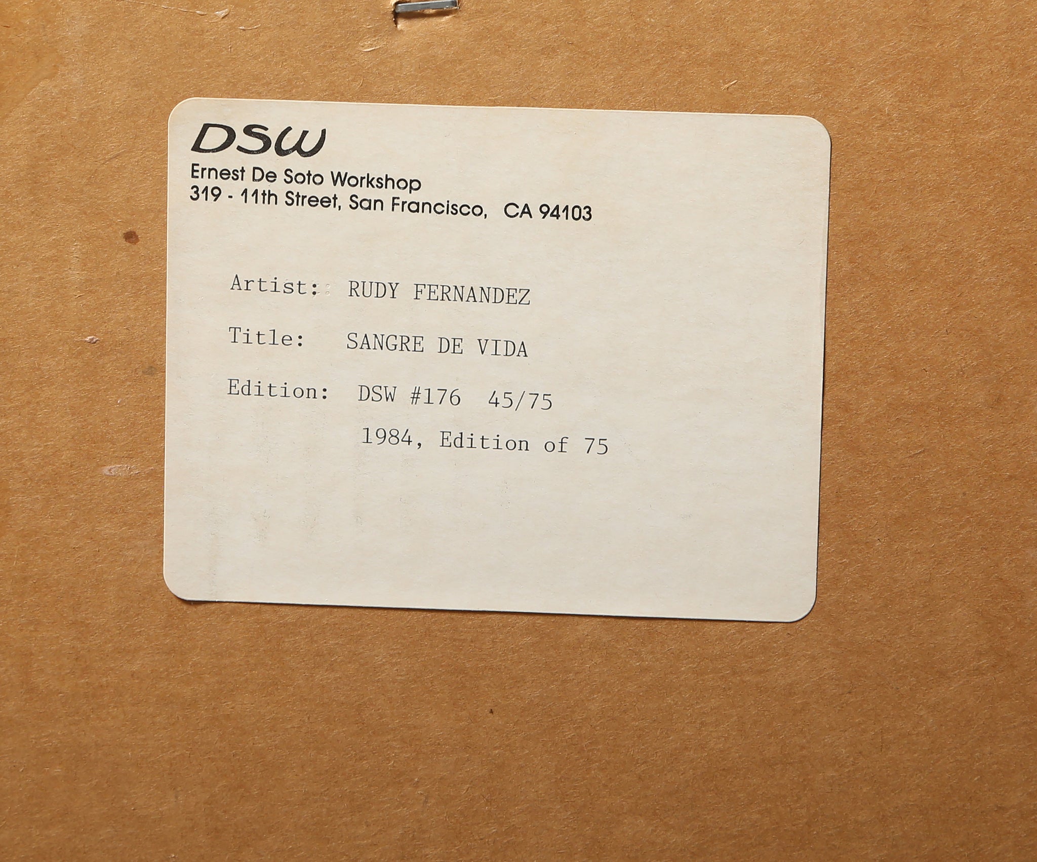 Rudy Fernandez, American (1948 - ) - Sangre de Vida. Year: 1984, Medium: Lithograph and 3-D collage, signed, numbered, titled and dated in pencil, Edition: 45/75, Size: 31.75 x 24 in. (80.65 x 60.96 cm), Frame Size: 39 x 30.5 inches, Printer: Ernest de Soto Workshop, Publisher: Ernest de Soto Workshop