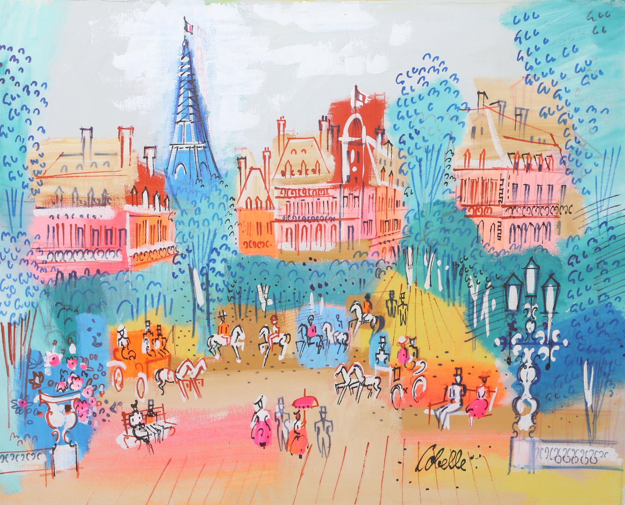 Charles Cobelle, French (1902 - 1994) - Eiffel Tower. Year: circa 1961, Medium: Acrylic on Canvas, signed, Size: 24 x 30 in. (60.96 x 76.2 cm), Description: A large acrylic on canvas painting by French street painting Charles Cobelle. Cobelle regularly painted slice-of-life scenes of Parisian streets, waterways, and landmarks. This painting is signed by the artist.
