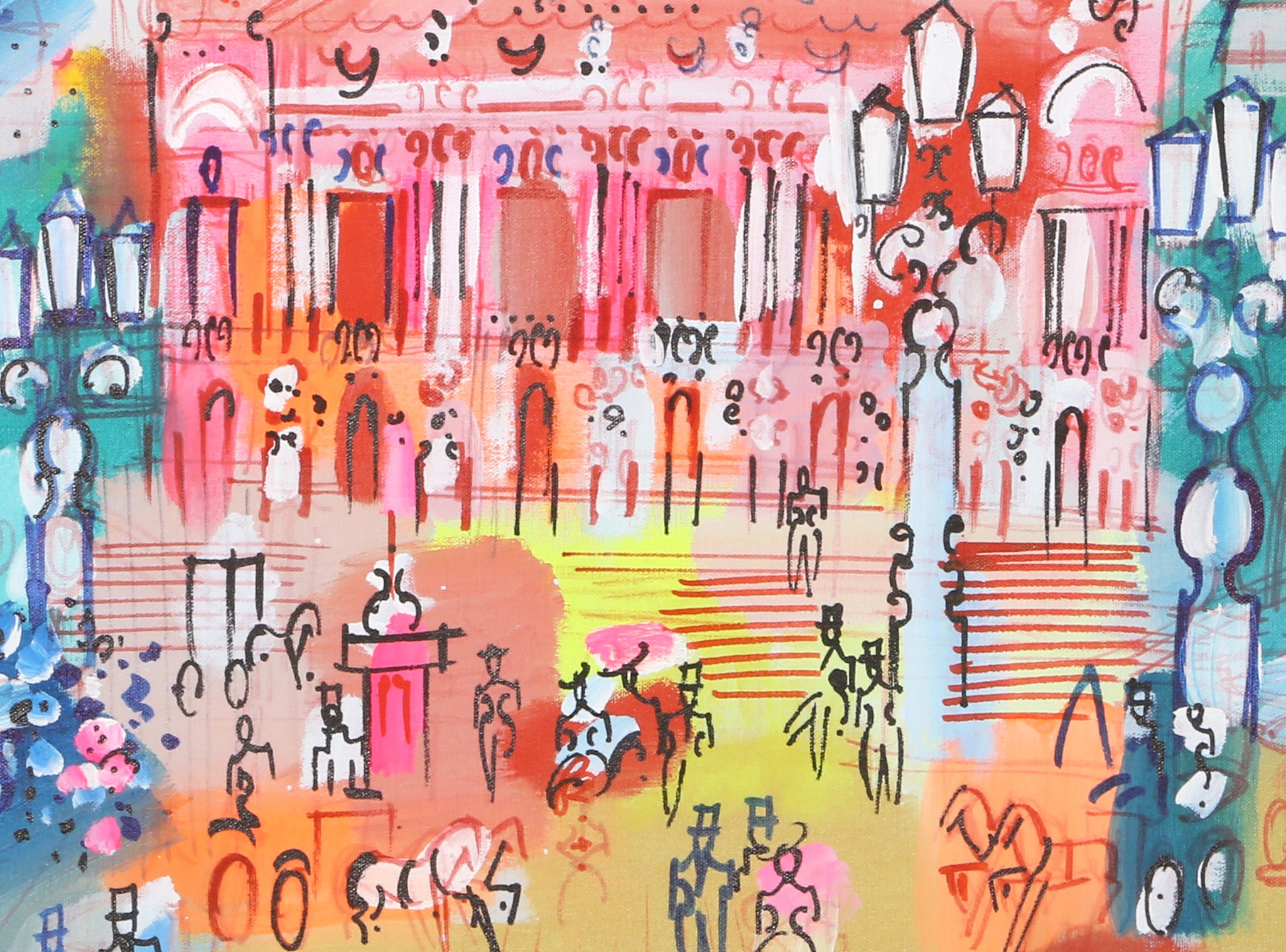 Charles Cobelle, French (1902 - 1994) - Palais Garnier Plaza IV. Year: circa 1961, Medium: Acrylic on Canvas, signed, Size: 24 x 30 in. (60.96 x 76.2 cm), Description: A large acrylic on canvas painting by French street painting Charles Cobelle. Cobelle regularly painted slice-of-life scenes of Parisian streets, waterways, and landmarks. This painting is signed by the artist.