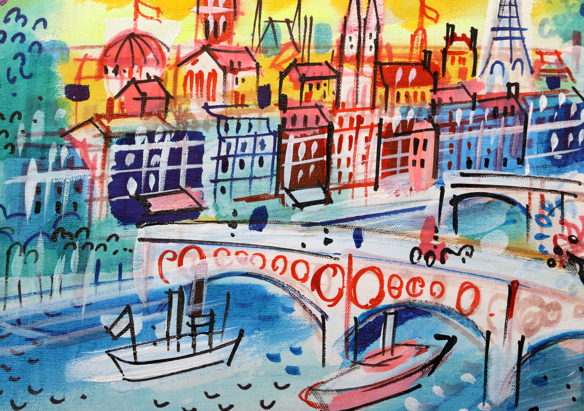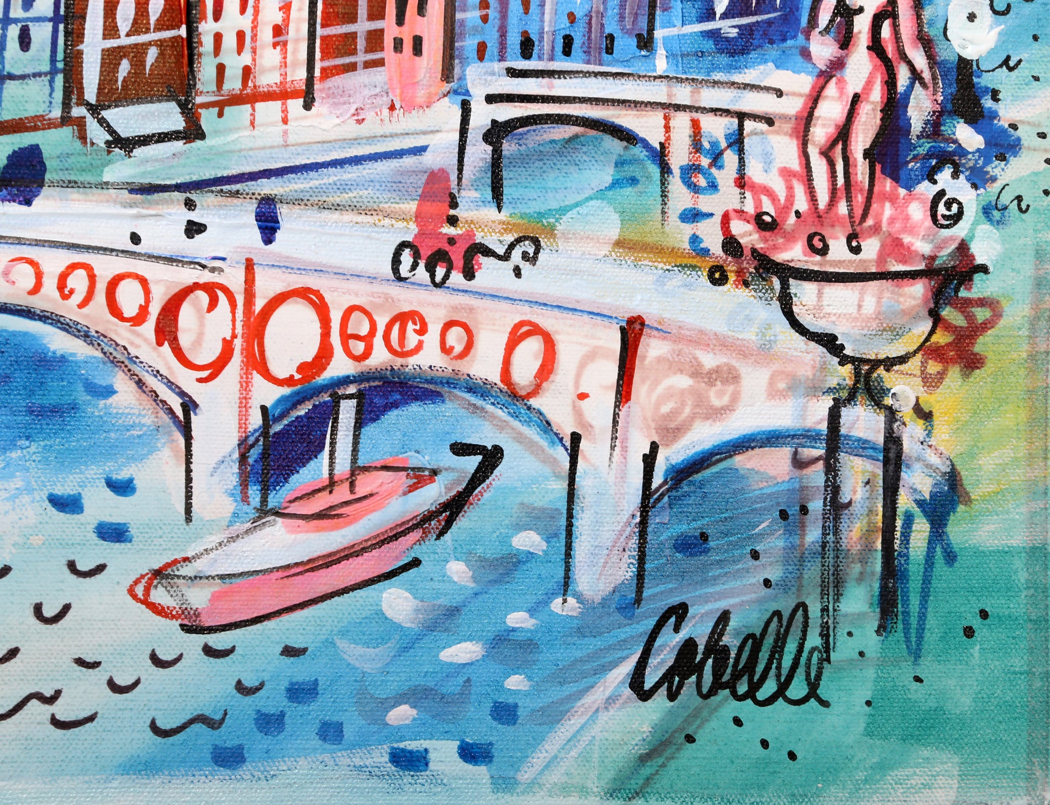 Charles Cobelle, French (1902 - 1994) - Paris Bridge. Year: circa 1960, Medium: Acrylic on canvas, signed lower right, Size: 12 x 16 in. (30.48 x 40.64 cm), Description: A bright and bustling Paris cityscape by French artist Charles Cobelle