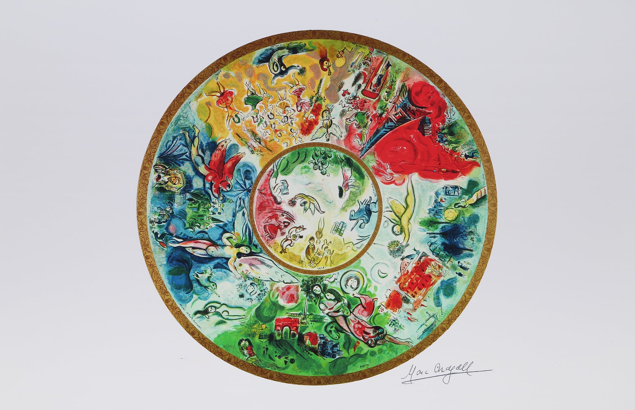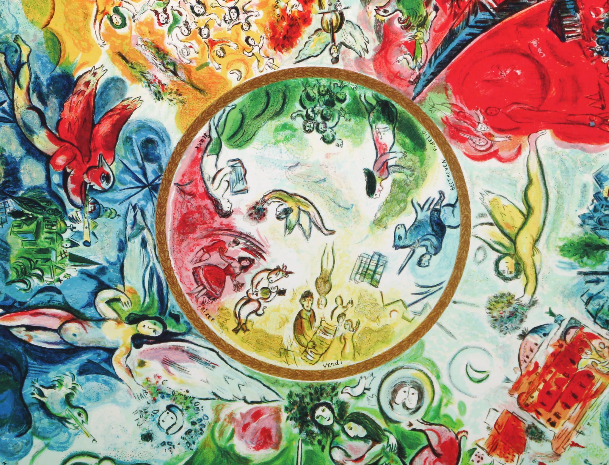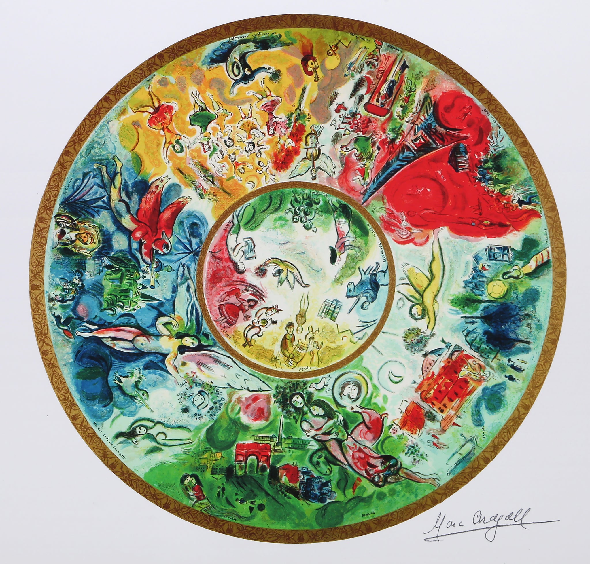 Marc Chagall, After, Russian (1887 - 1985) - Paris Opera Ceiling. Year:, Medium: Giclee, fascimille signed and numbered in pencil, Edition: 375, Image Size: 13.5 x 13.5 inches, Size: 16 x 24 in. (40.64 x 60.96 cm)