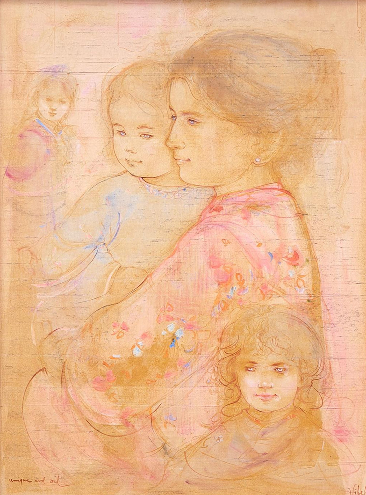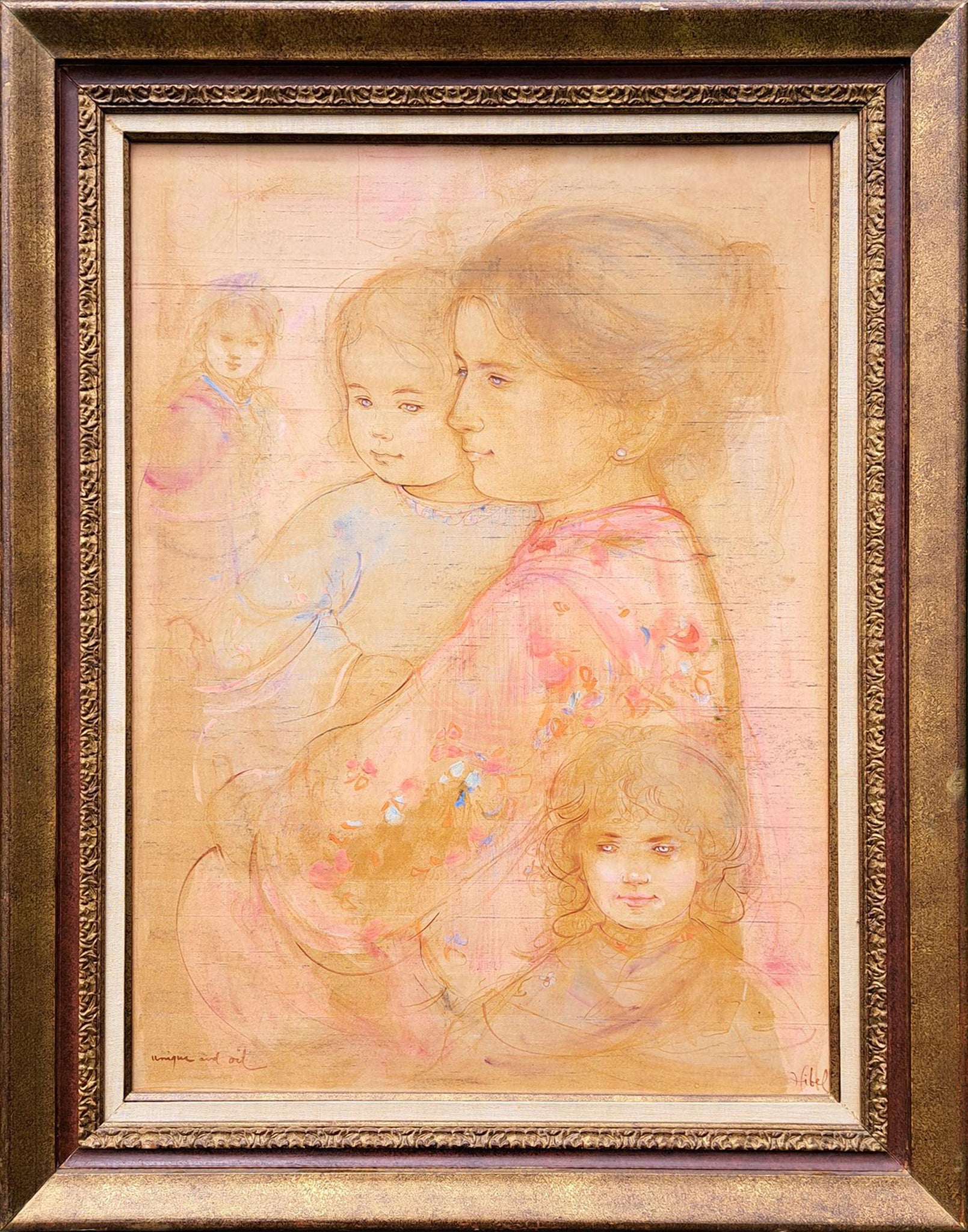 Edna Hibel, American (1917 - 2014) - Mother and Child. Year: 1981, Medium: Unique Lithograph and Oil, signed, Size: 32 x 23.5 in. (81.28 x 59.69 cm), Frame Size: 40.25 x 31.8 inches