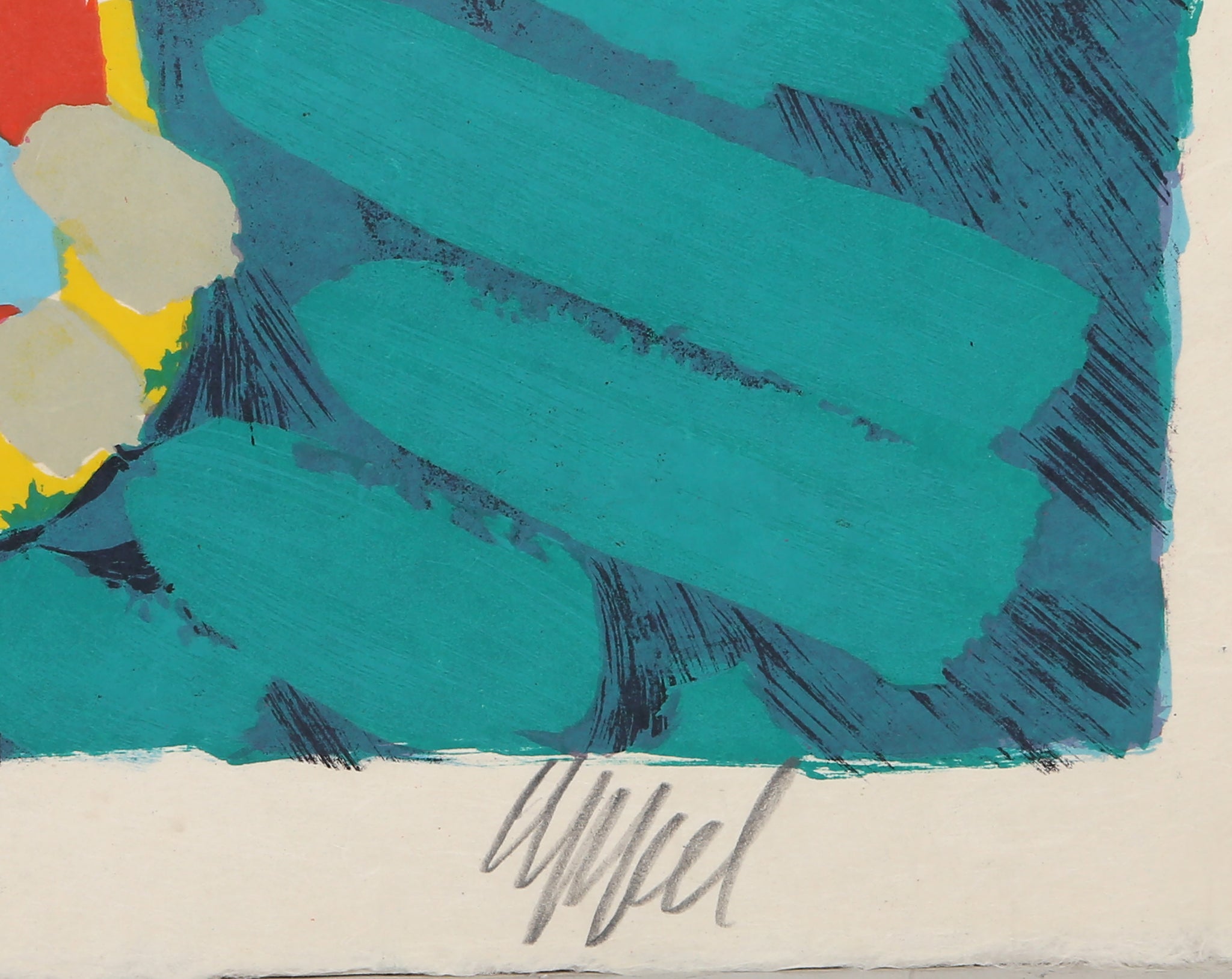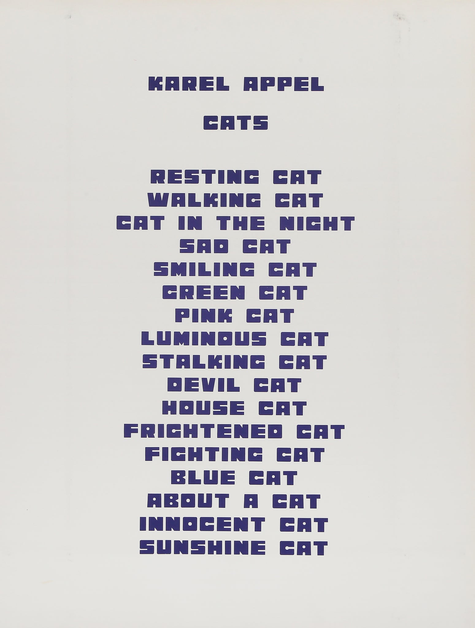 This signed and numbered lithograph on Japon paper is from a portfolio of 17 prints by Modern artist Karel Appel. He admired the domestic house cat for its aloof, yet instinctive, demeanor, and it became one of his favorite subjects. The portfolio "Cats" is a visual meditation on the animals’ behavior in which the artist depicts them resting, walking, stalking, frightened, and poised to attack.
